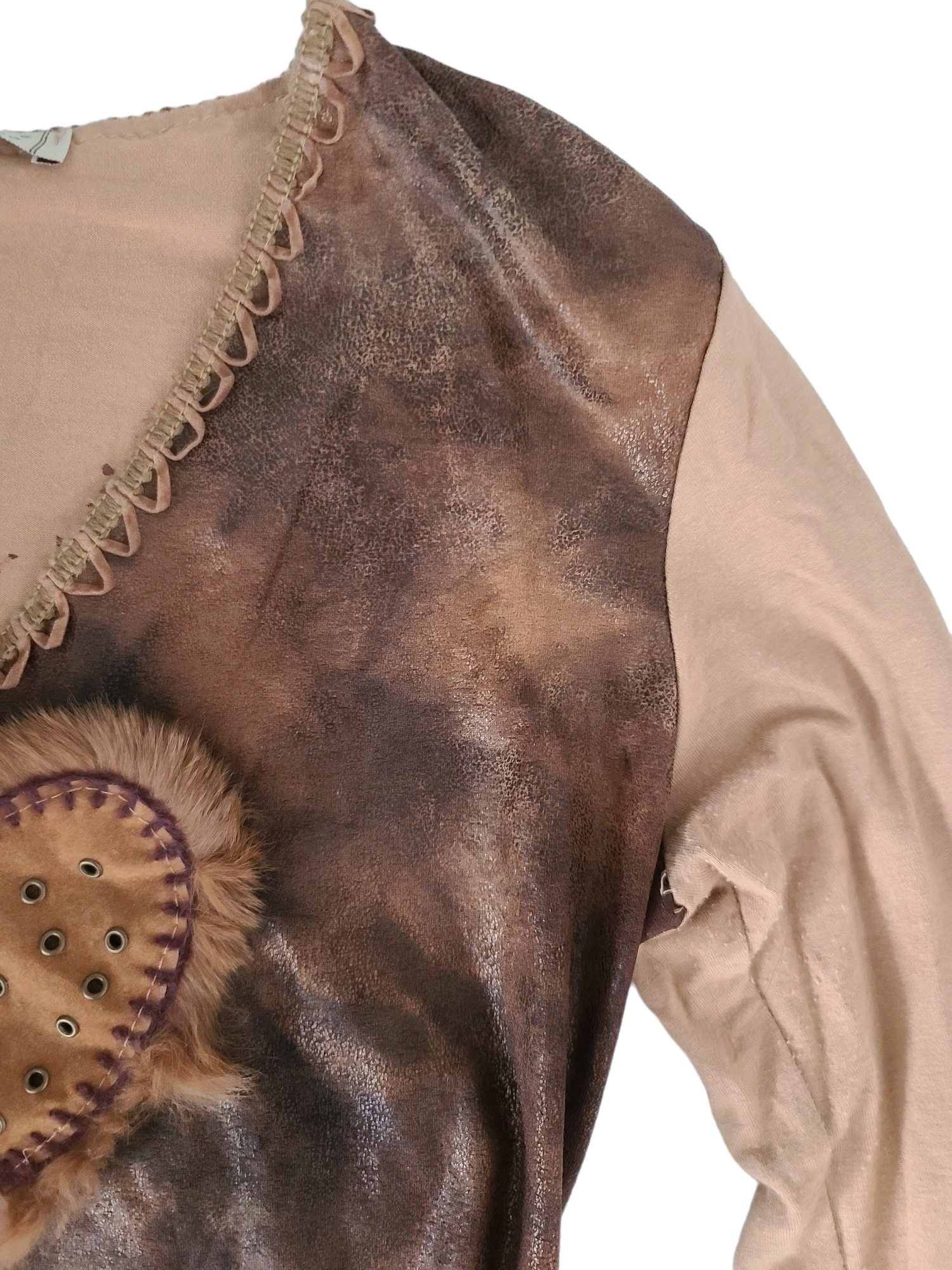 Very beautiful vintage 90s beige and brown long-sleeved top. Laces, eyelets, heart pattern in faux fur. Coquette grunge archive