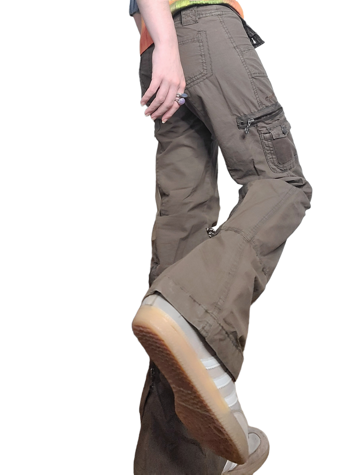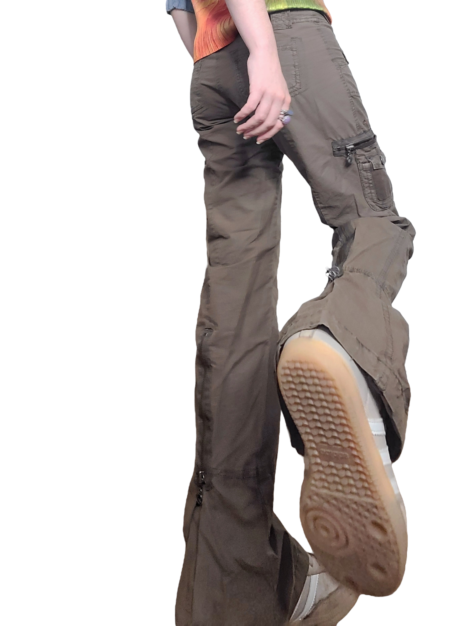 Very nice brown multi-pocket y2k cargo, fairygrunge post apo style. Peace and love details and gorpcore zippers on the back of the calves. Archive 2000.