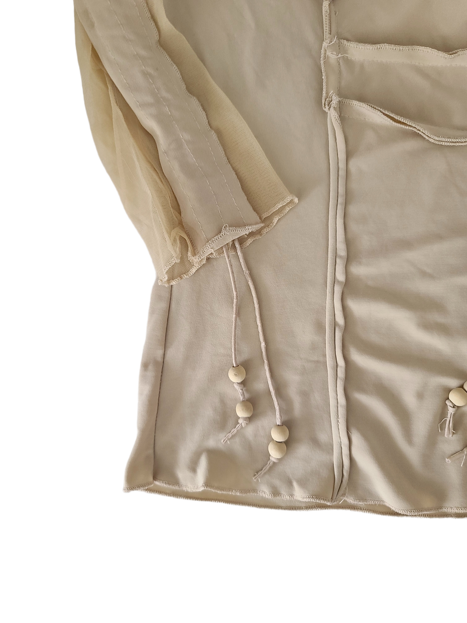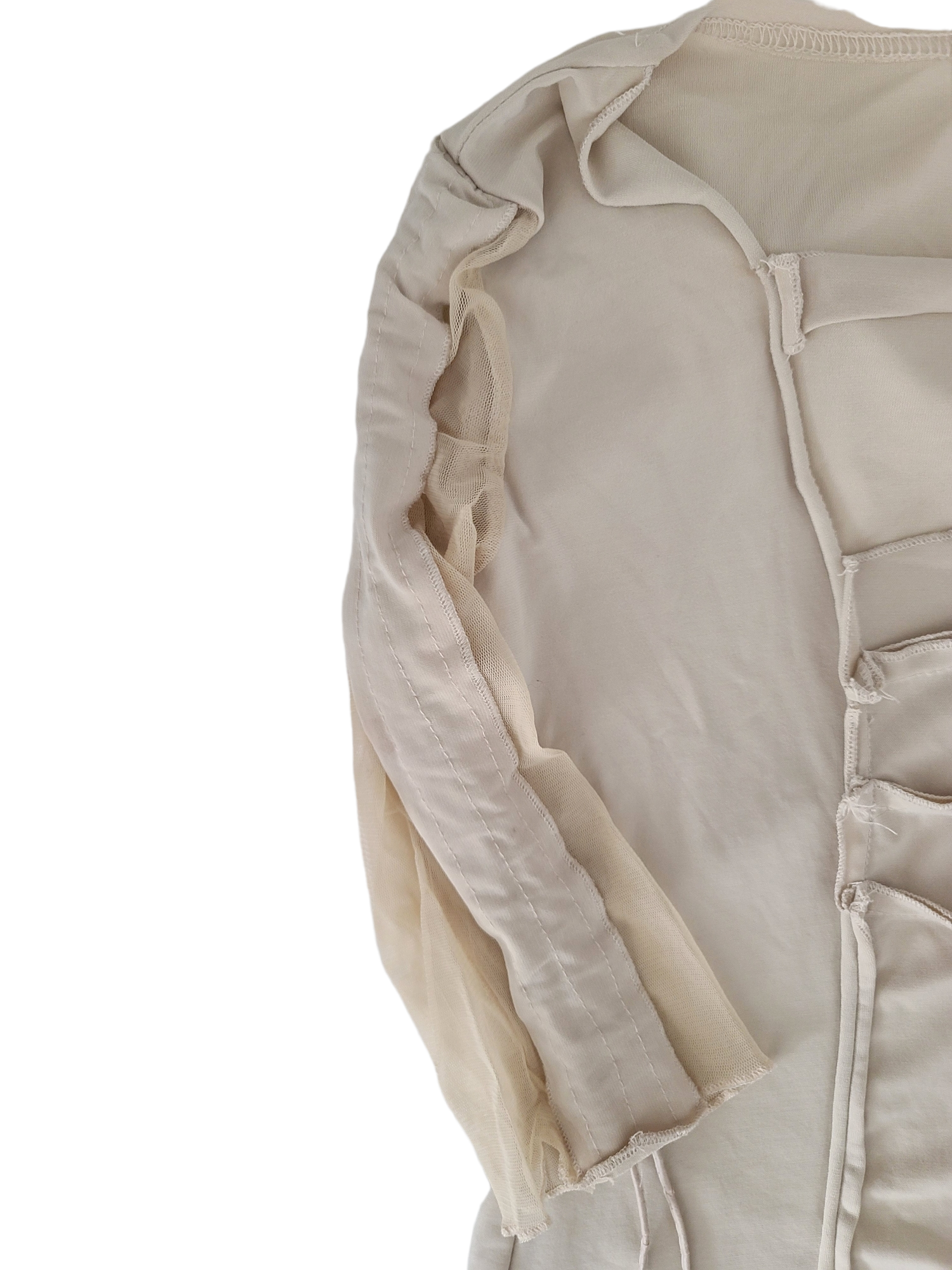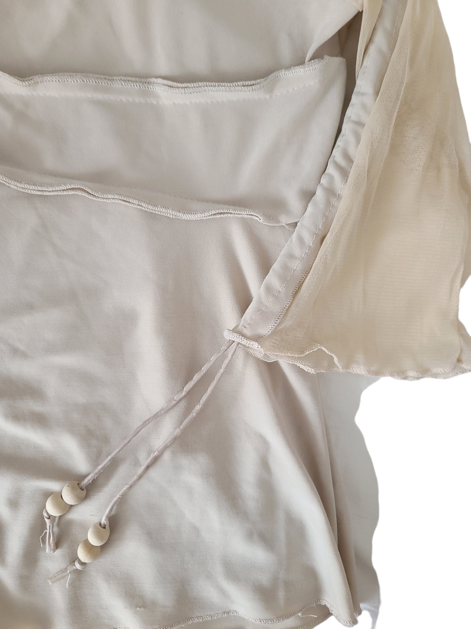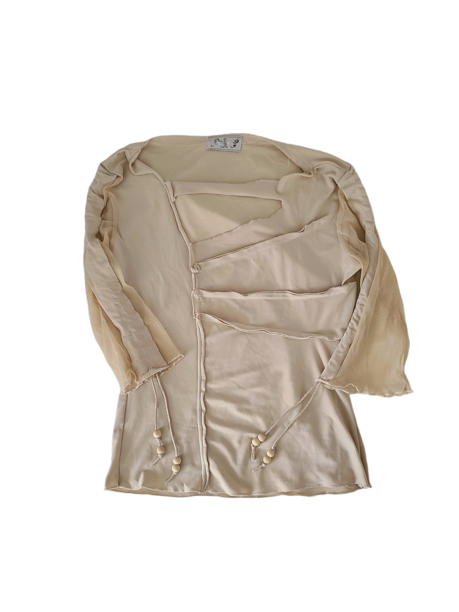 Incredible vintage cybery2k beige top, acubi style with gorpcore details: transparent mesh, tightening cords, asymmetrical lines. Subversive basics.