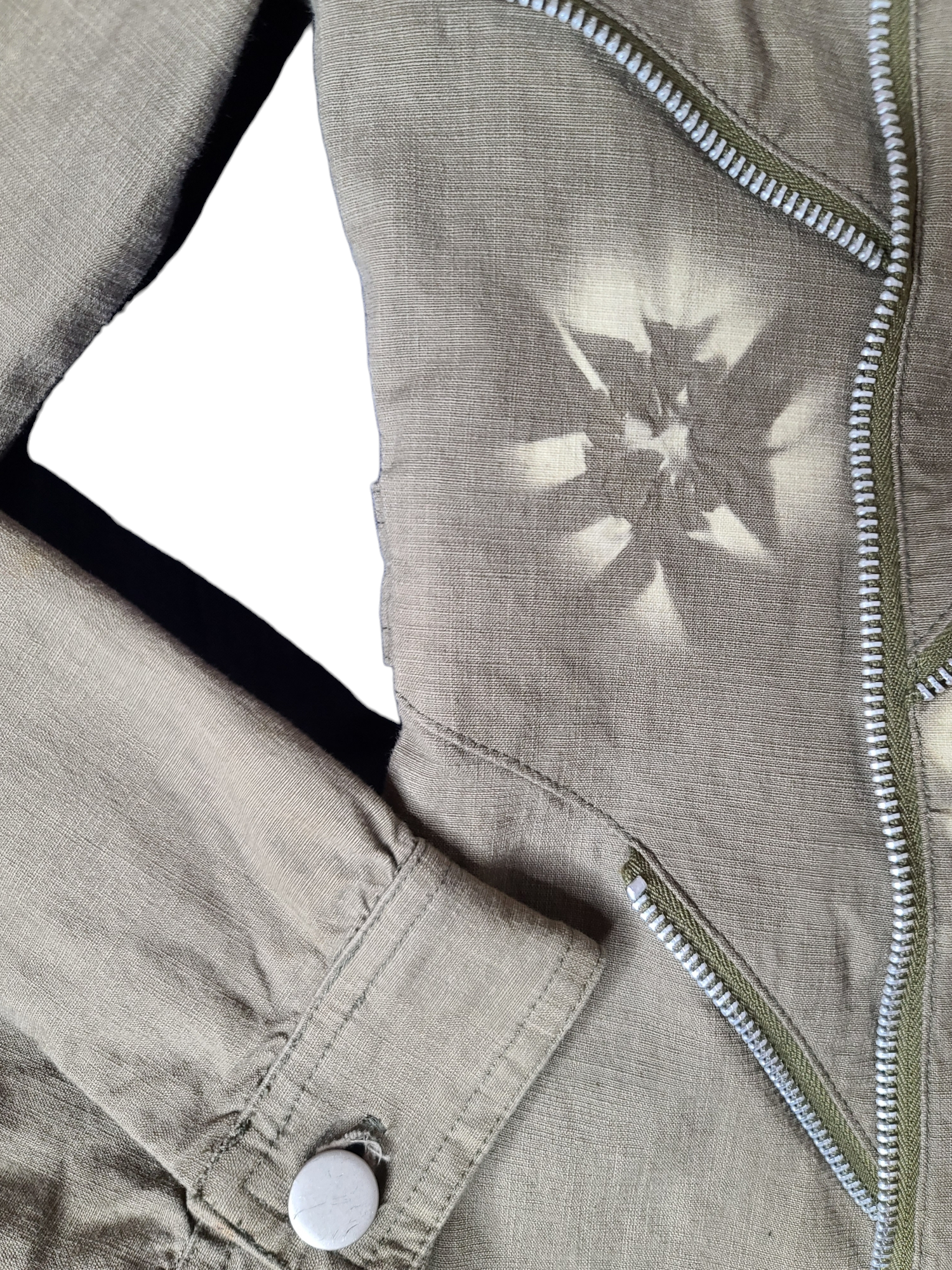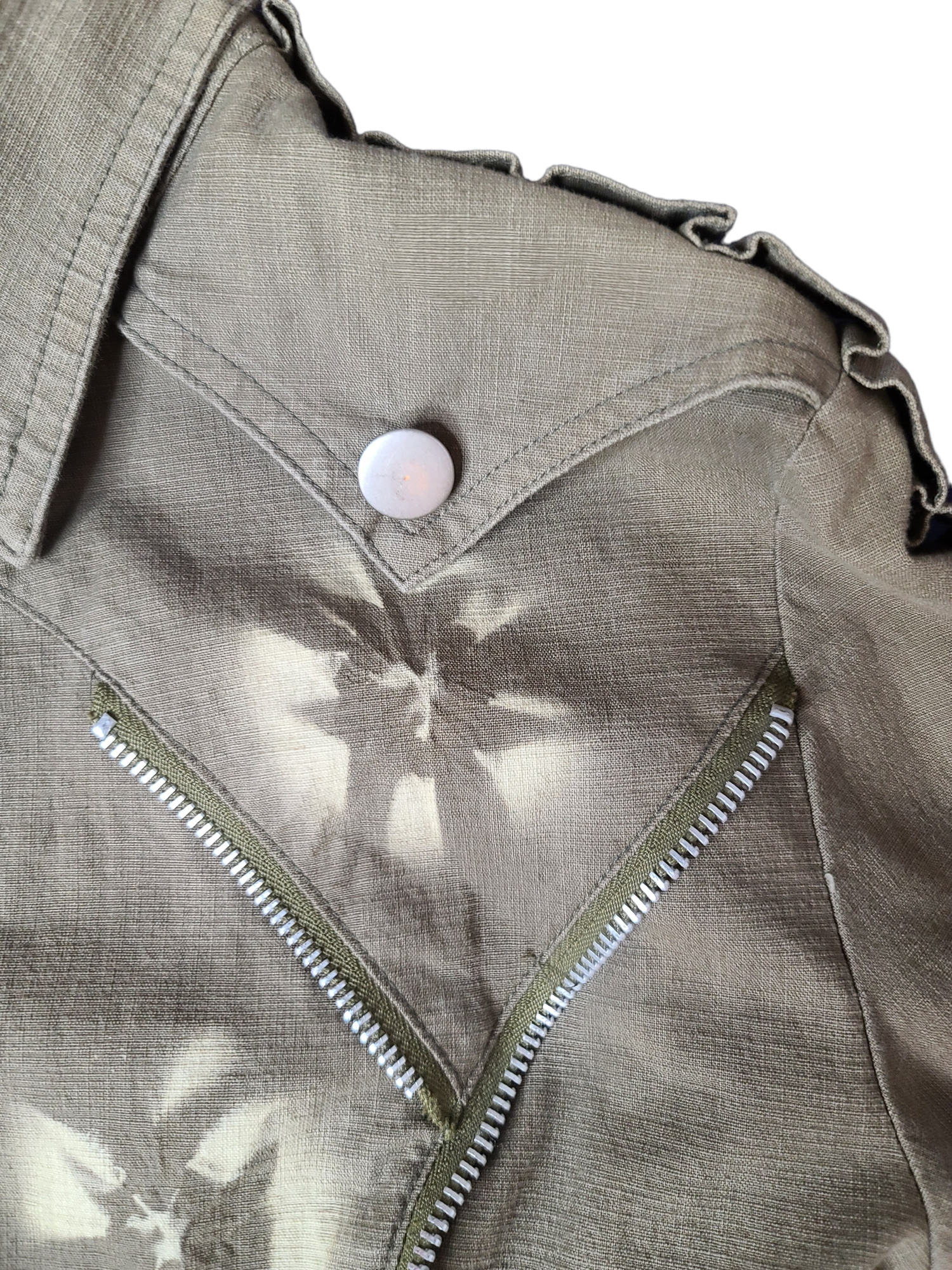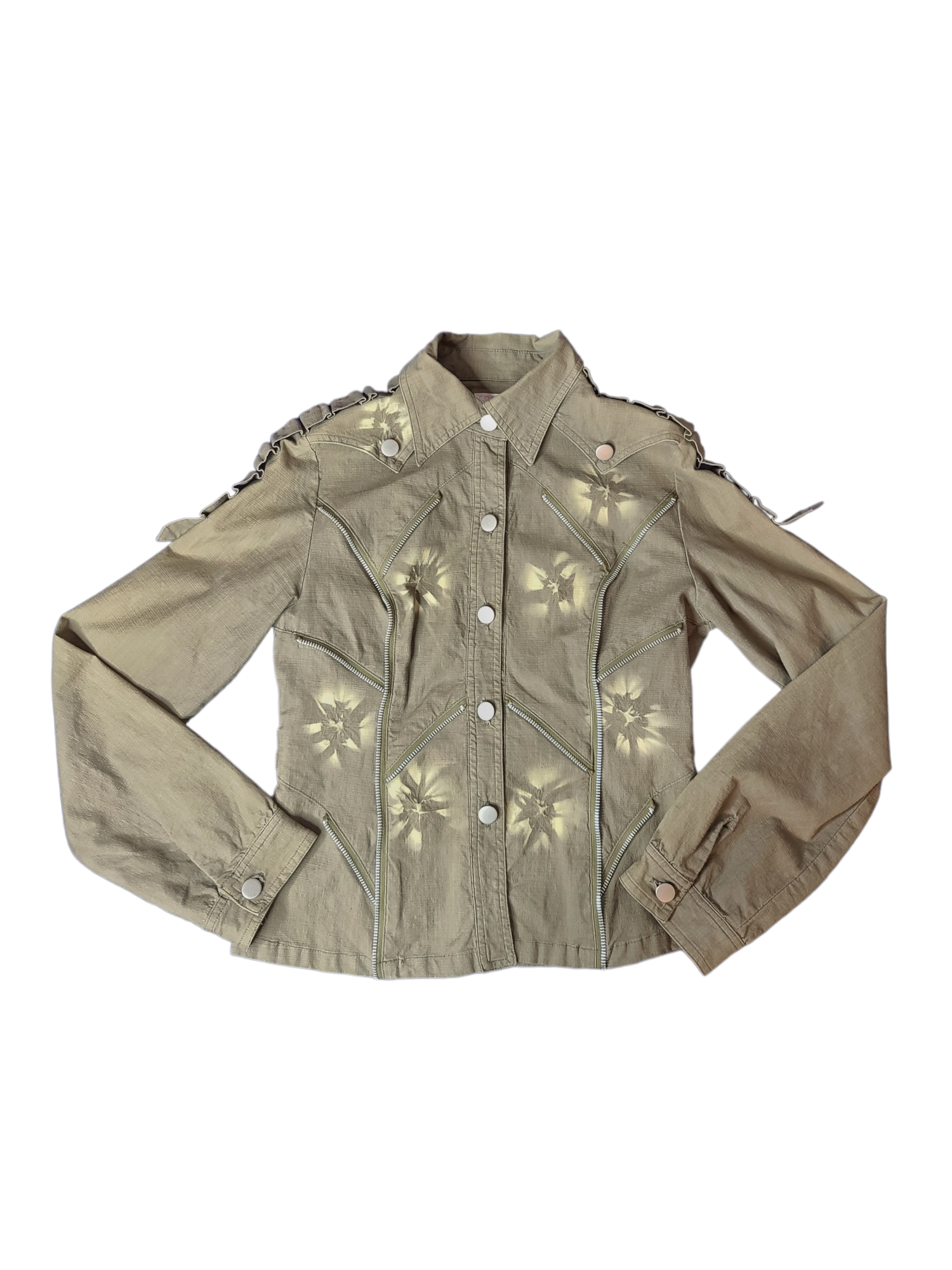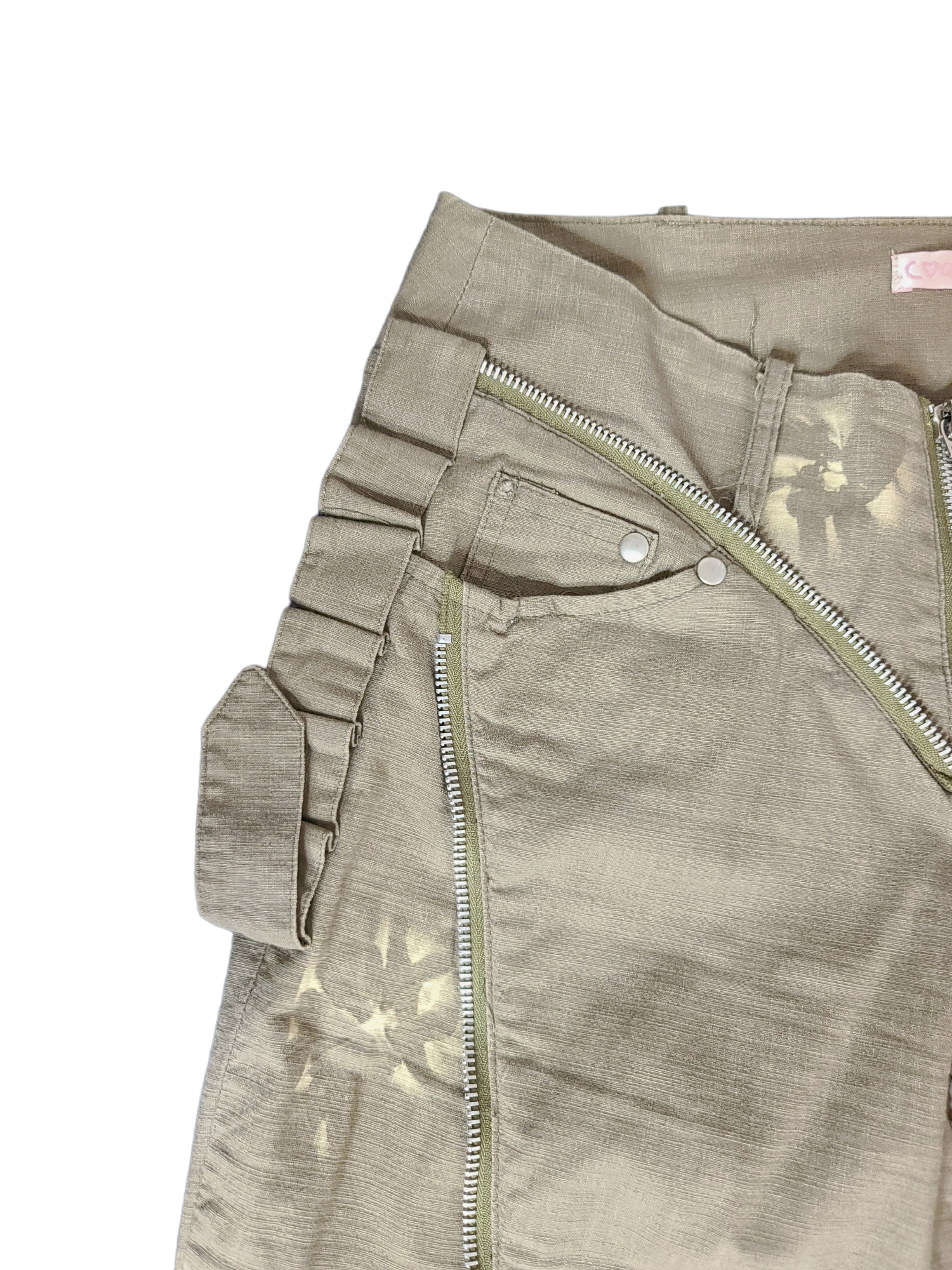 Amazing vintage cybery2k tie and dye khaki denim set. Flare cut jacket and pants, multi zips. Grunge archive.