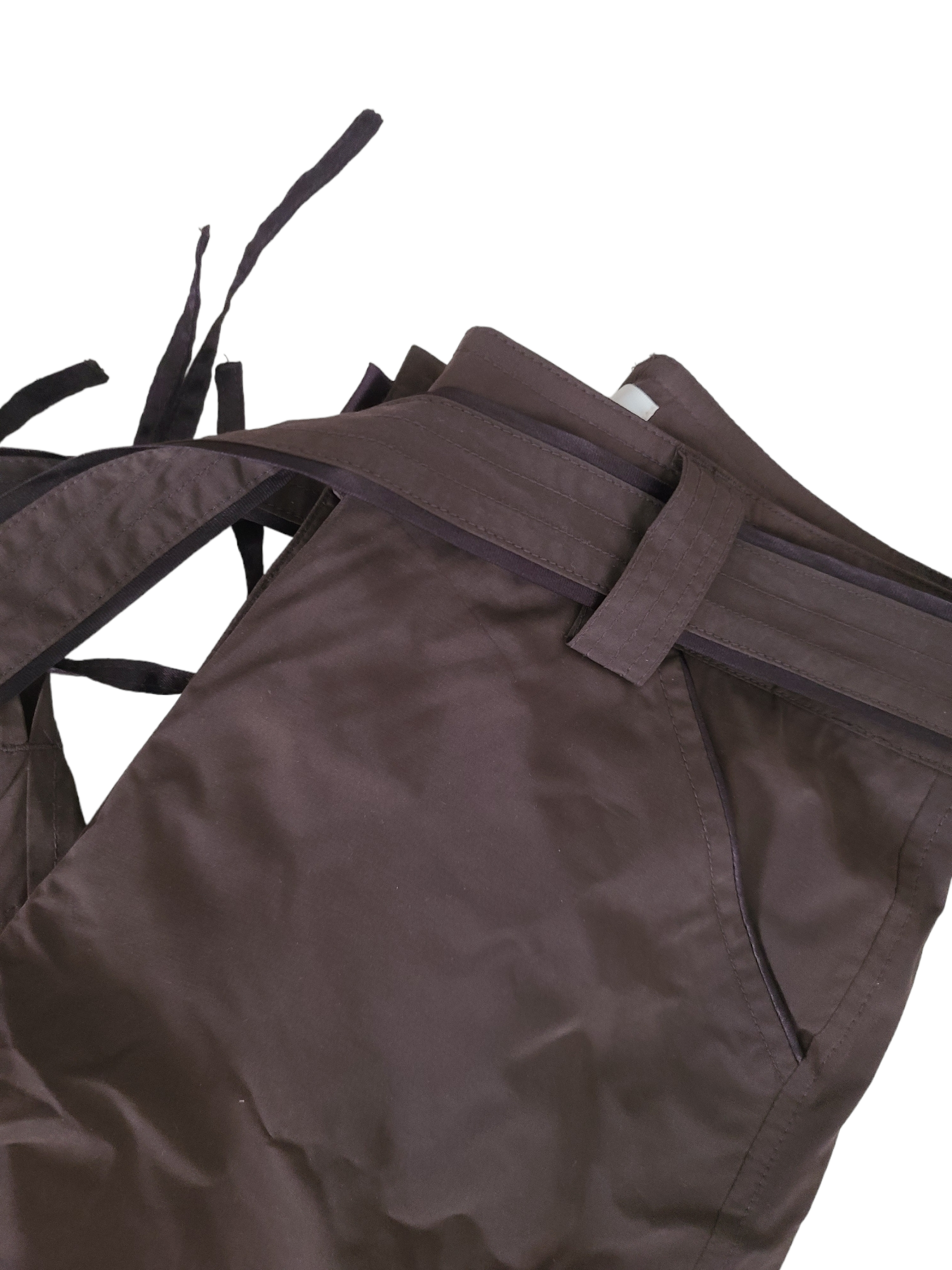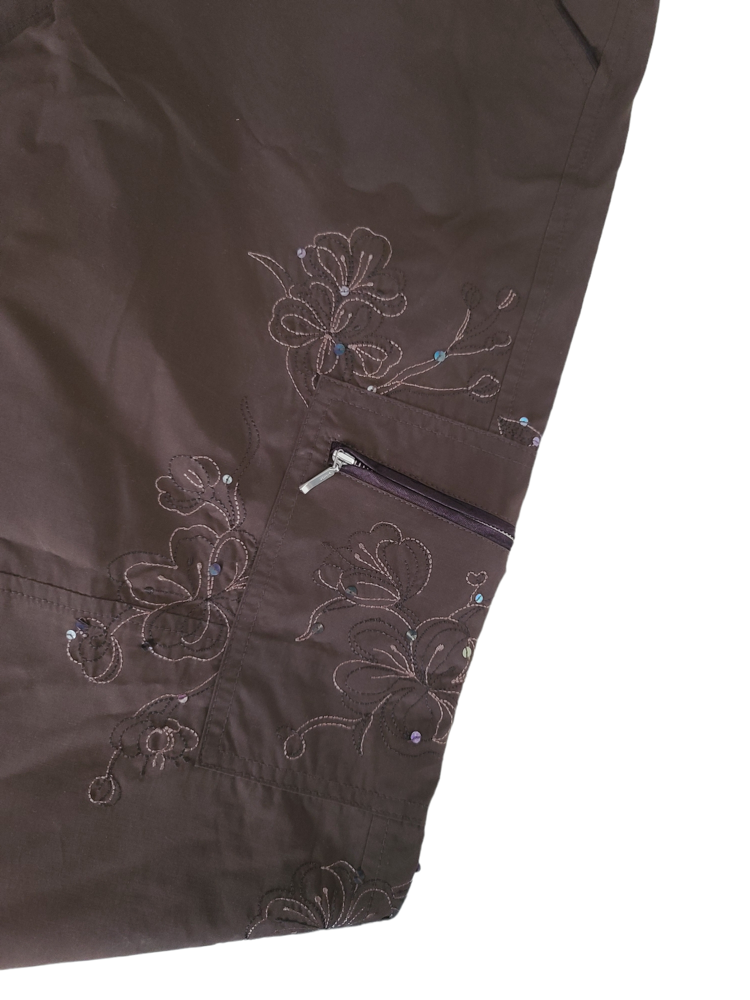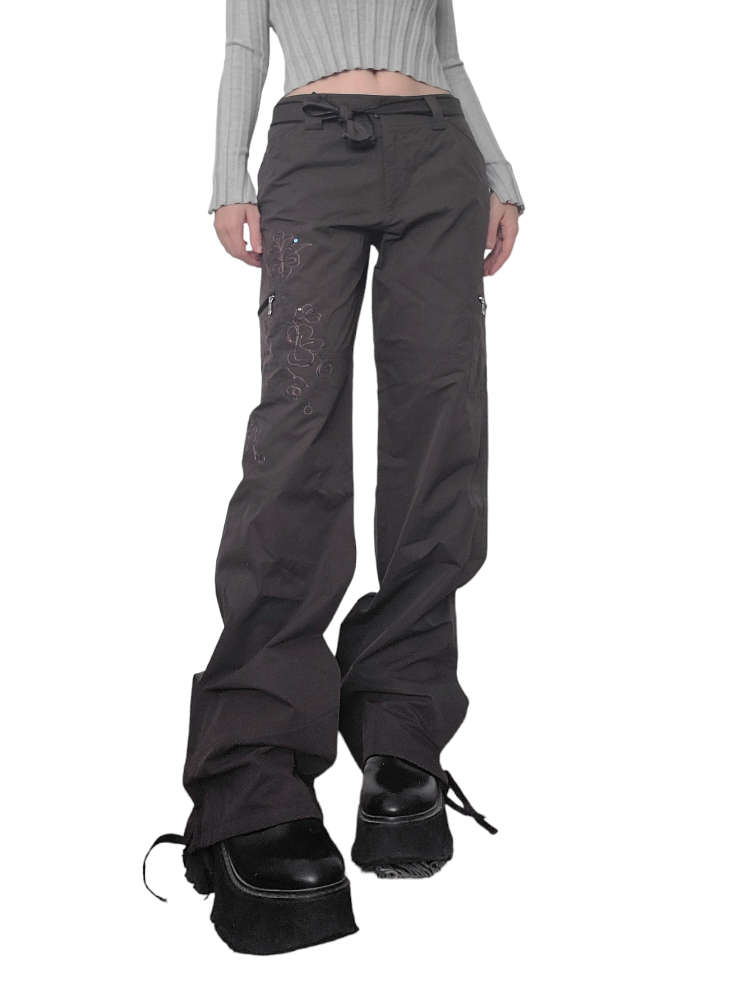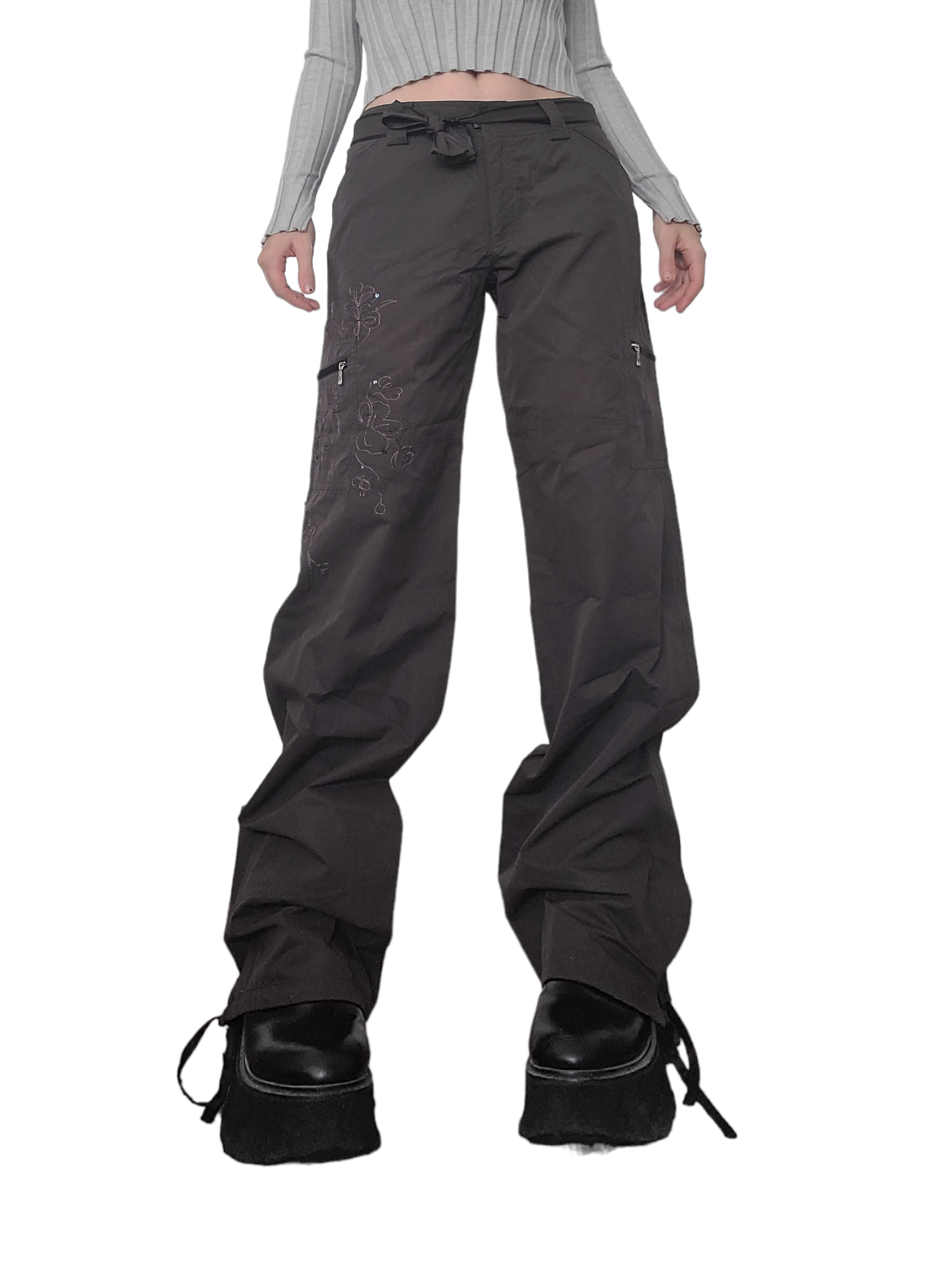 Amazing vintage 2000s fairygrunge brown cargo with floral embroidery and rhinestones. Fabric belt and drawstrings at the ankles.