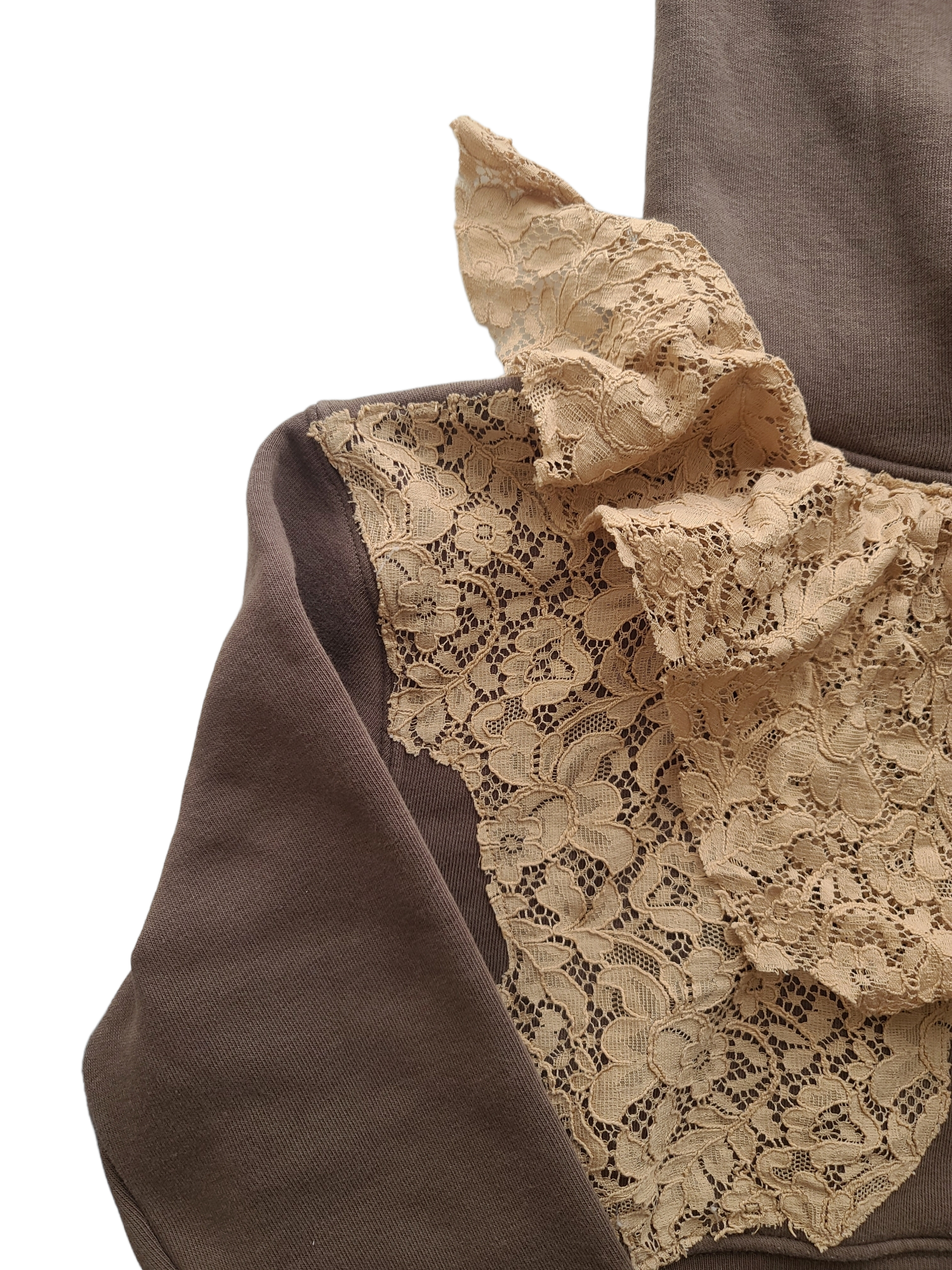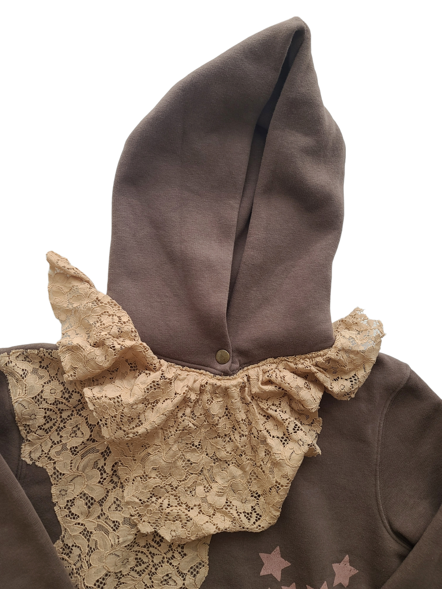 Magnificent brown oversized gyaru y2k hooded sweatshirt. Printed pink stars and beige lace. Harajuku archive.