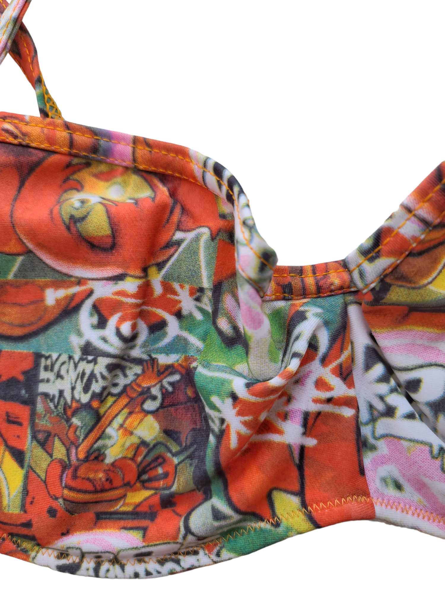 Beautiful 90s Ddp archive two-piece swimsuit, maximalist streetwear patterns.