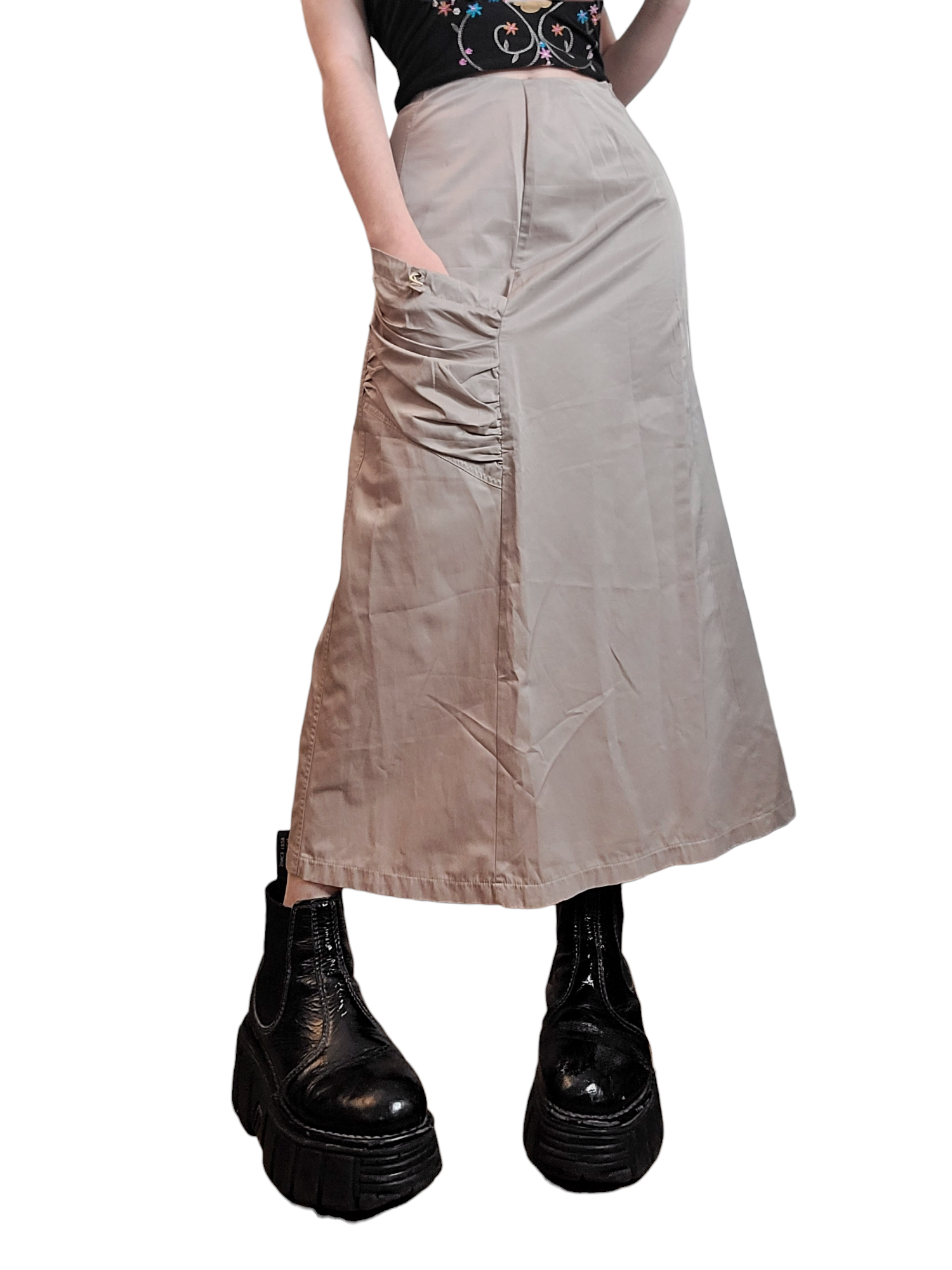 Very nice vintage long skirt from the 2000s, harajuku beige, with gathered gorpcore elements. Utility style pocket on the side. Acubi style.