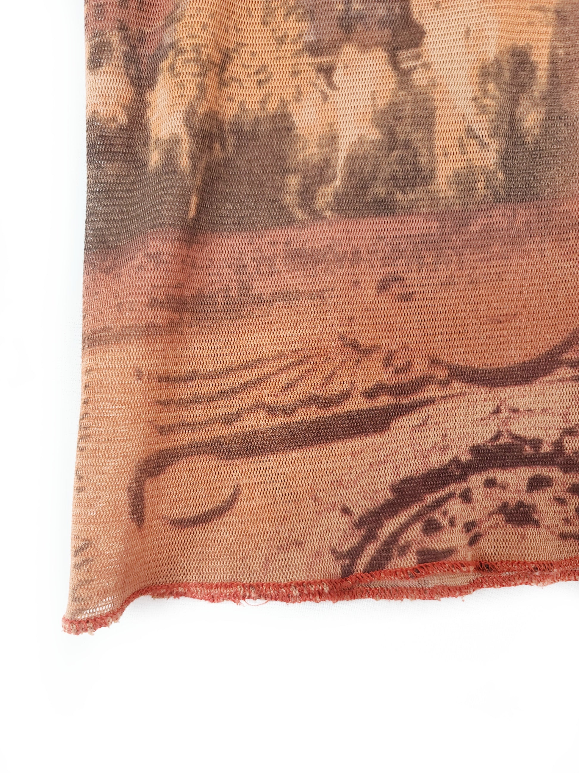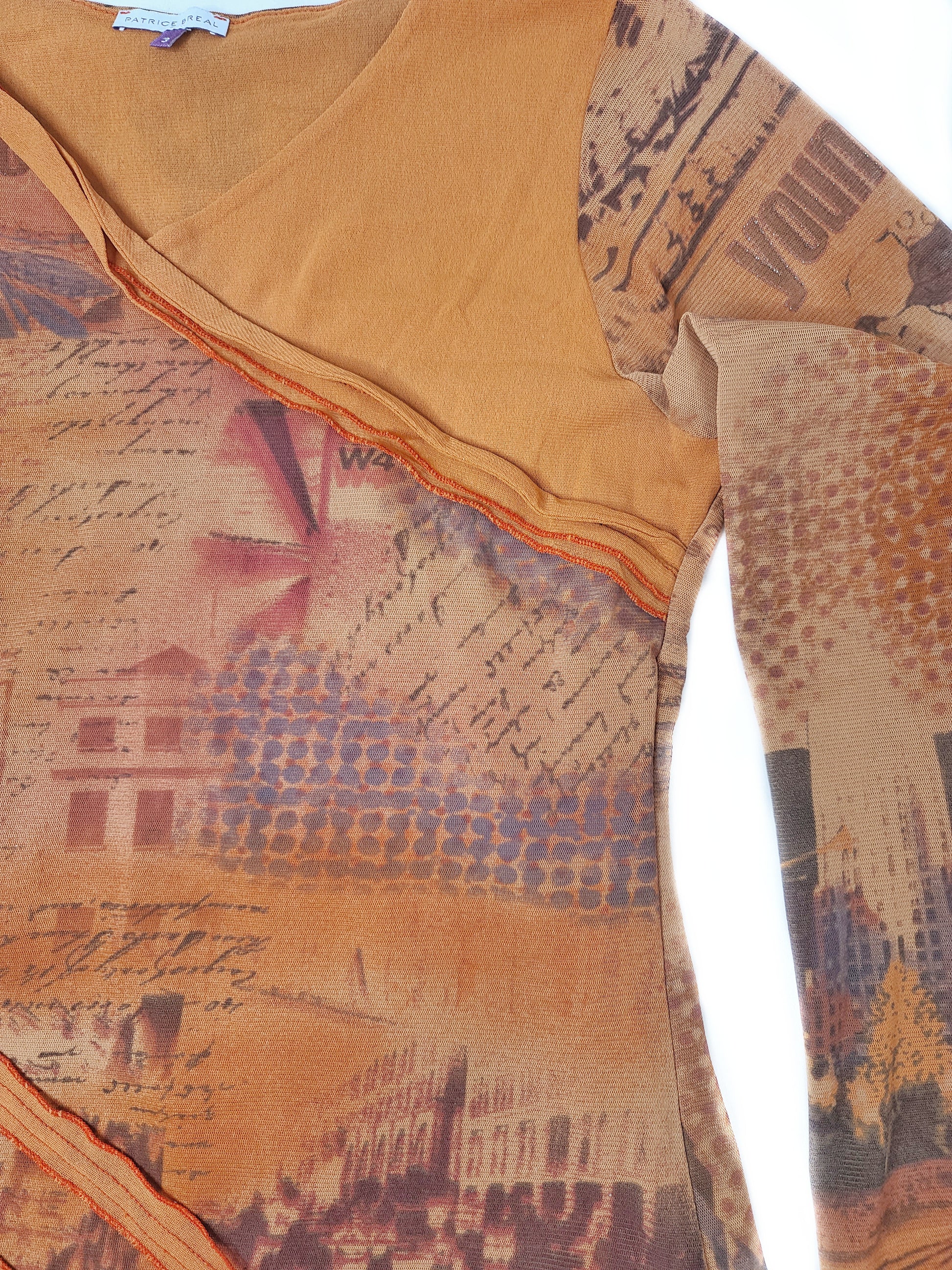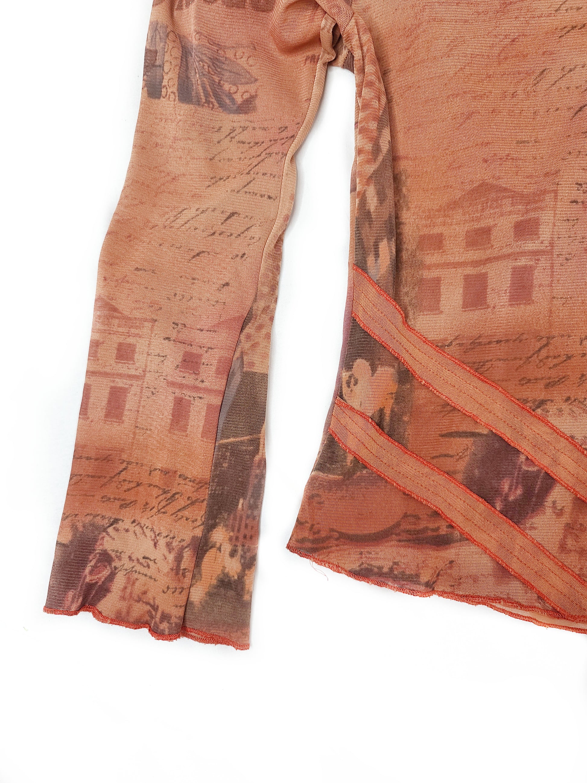 Cybery2k bohem orange long sleeve mesh top, text and photo print.
