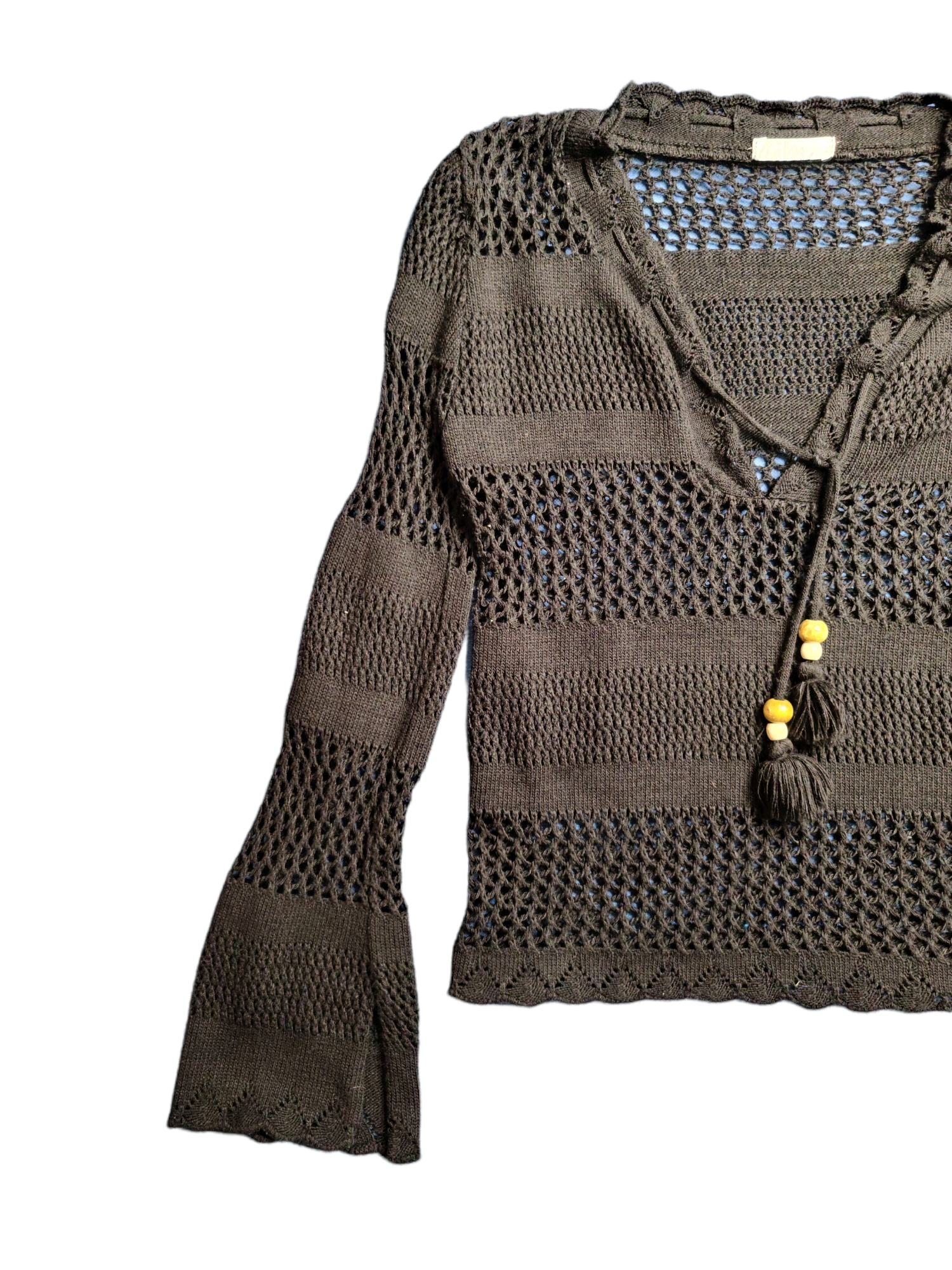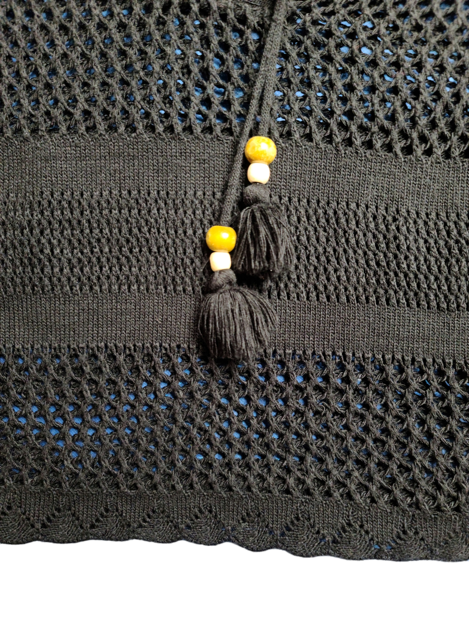 Vintage large black crochet bohemian sweater from the 2000s, net mesh. Details of wooden bead threads.