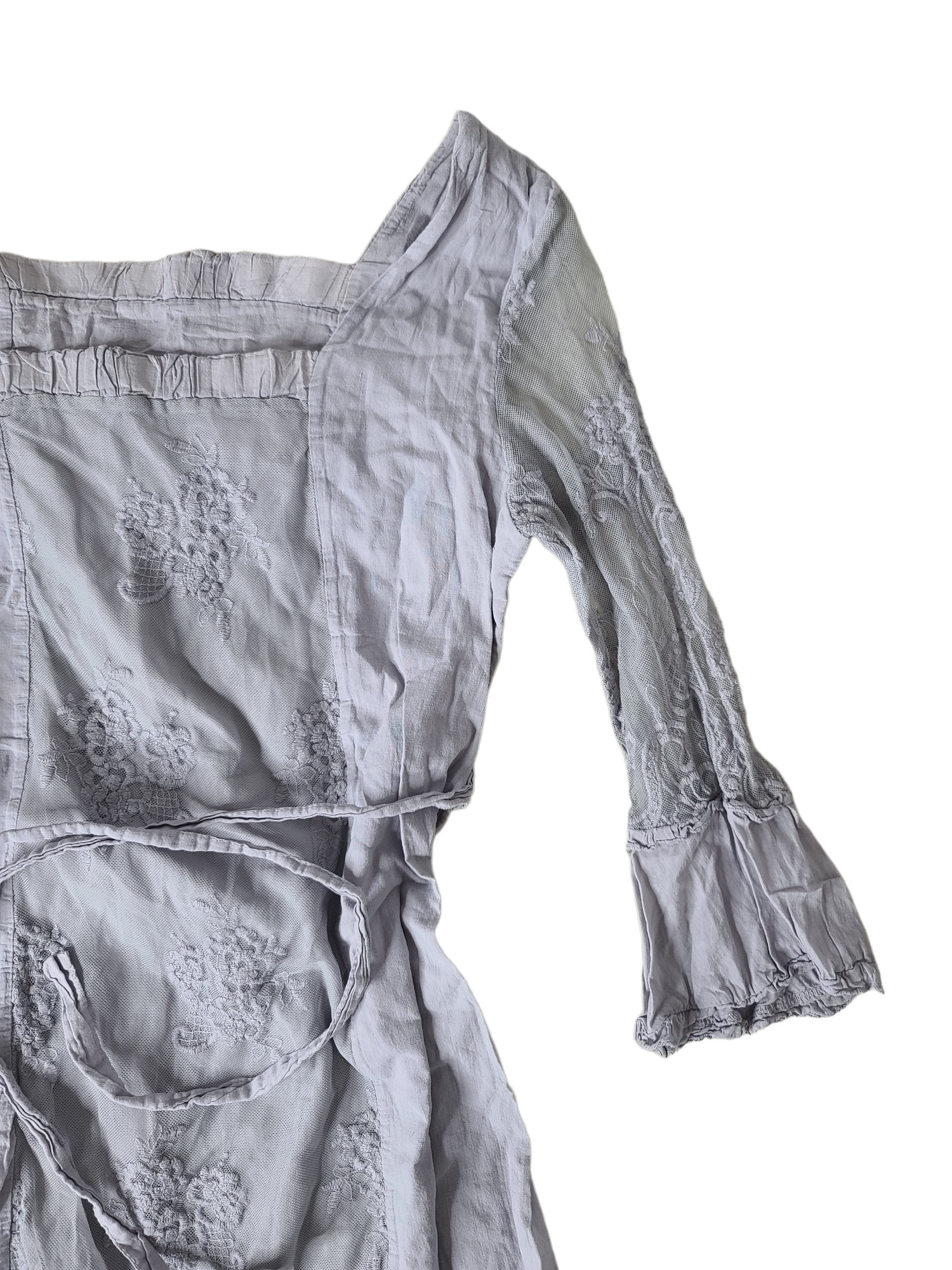 Very beautiful long gray dress from the 2000s, romantic fairycore. Openwork floral lace, transparent ruffled sleeves. Nice archive.