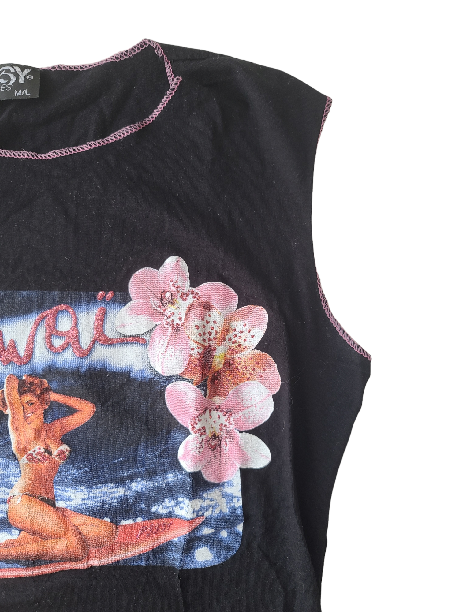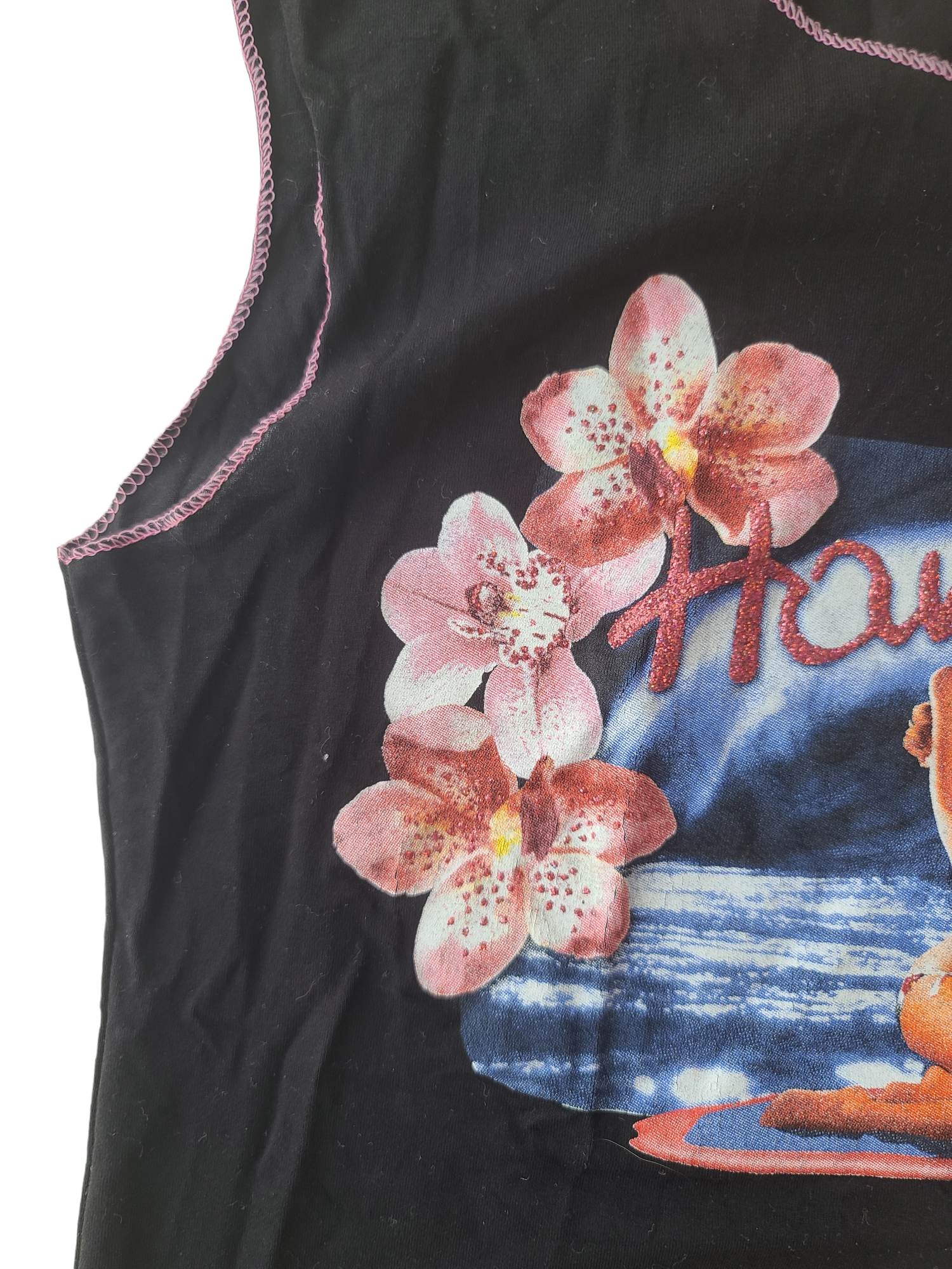 Amazing 90s black tank top, rhinestone Hawaii print, beachwear.