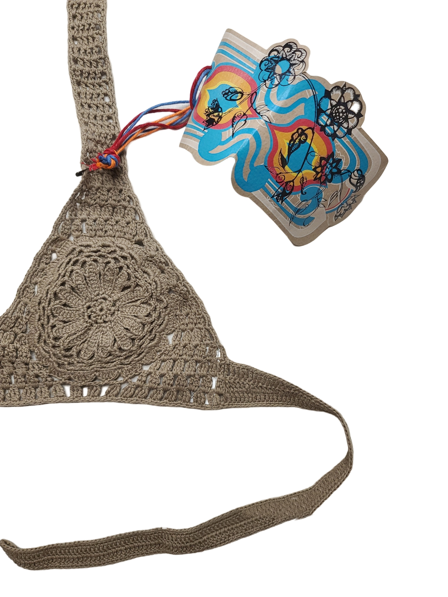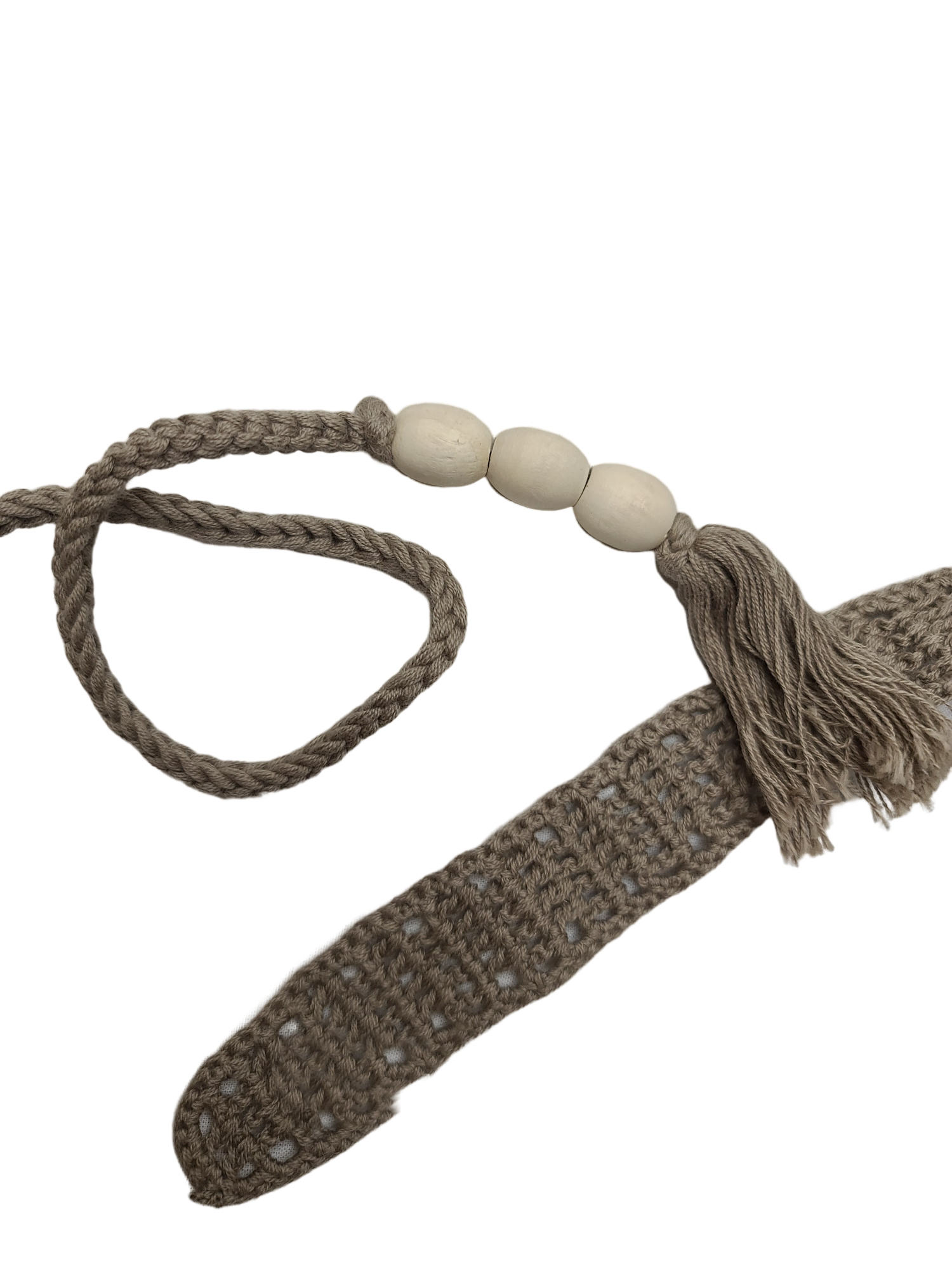 Beautiful vintage crochet top with a taupe bohemian chest and wooden beads from the 2000s. Please note that the color is lighter in real life than in the photos. It is a taupe color and not dark brown.