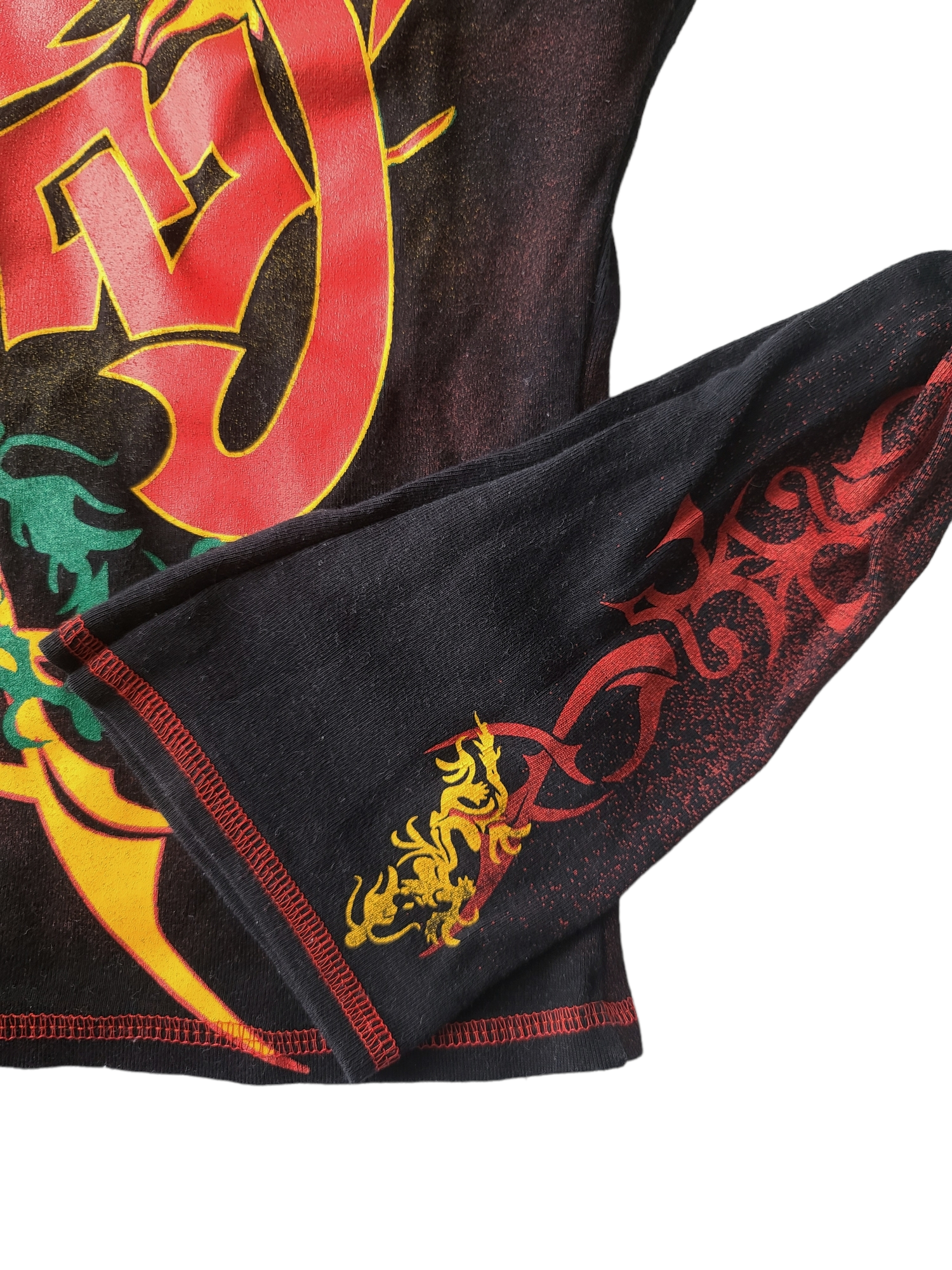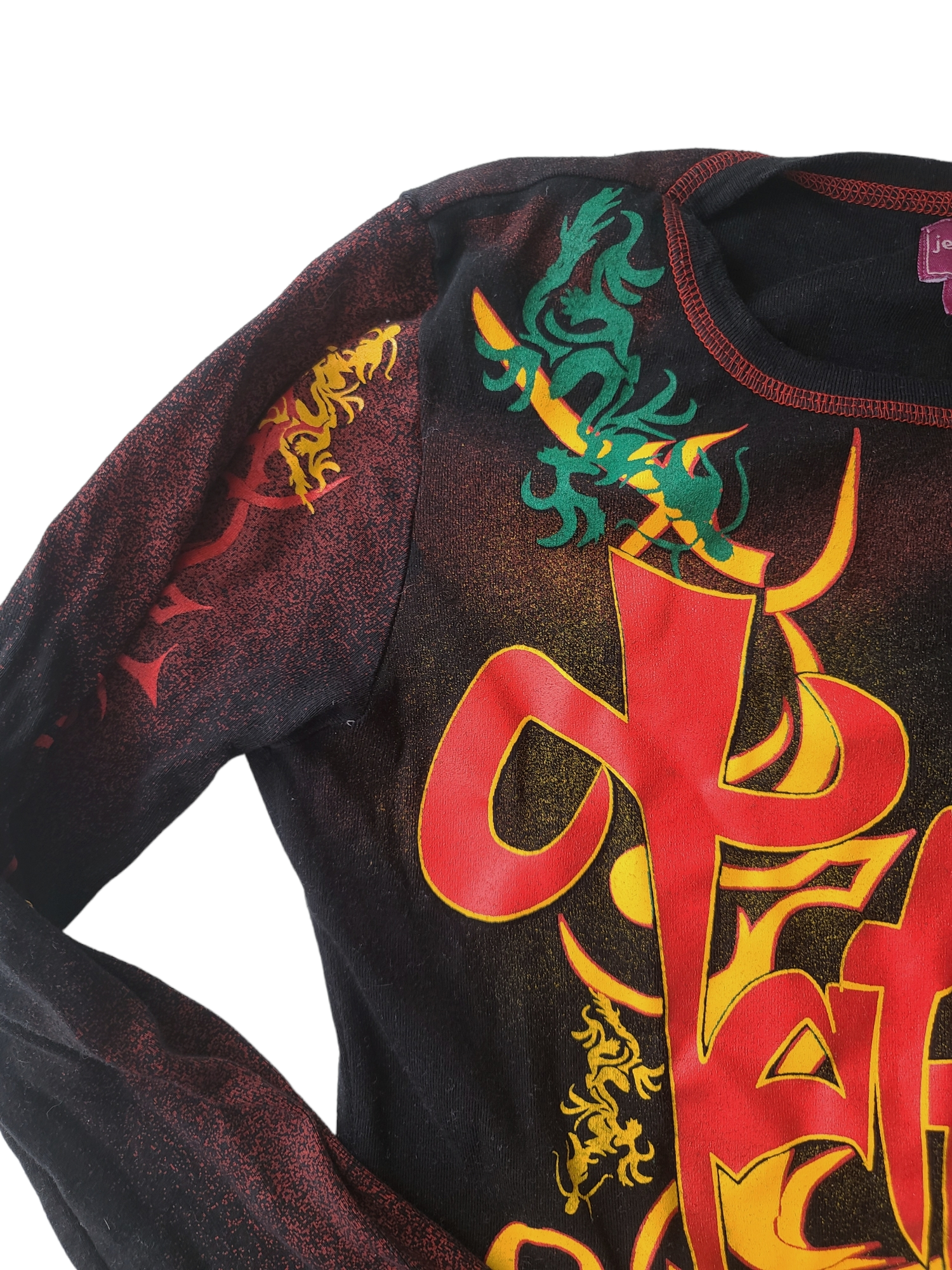 Amazing black long sleeve top vintage cybery2k streetwear graffiti print. Colorful tie and dye and flocking.