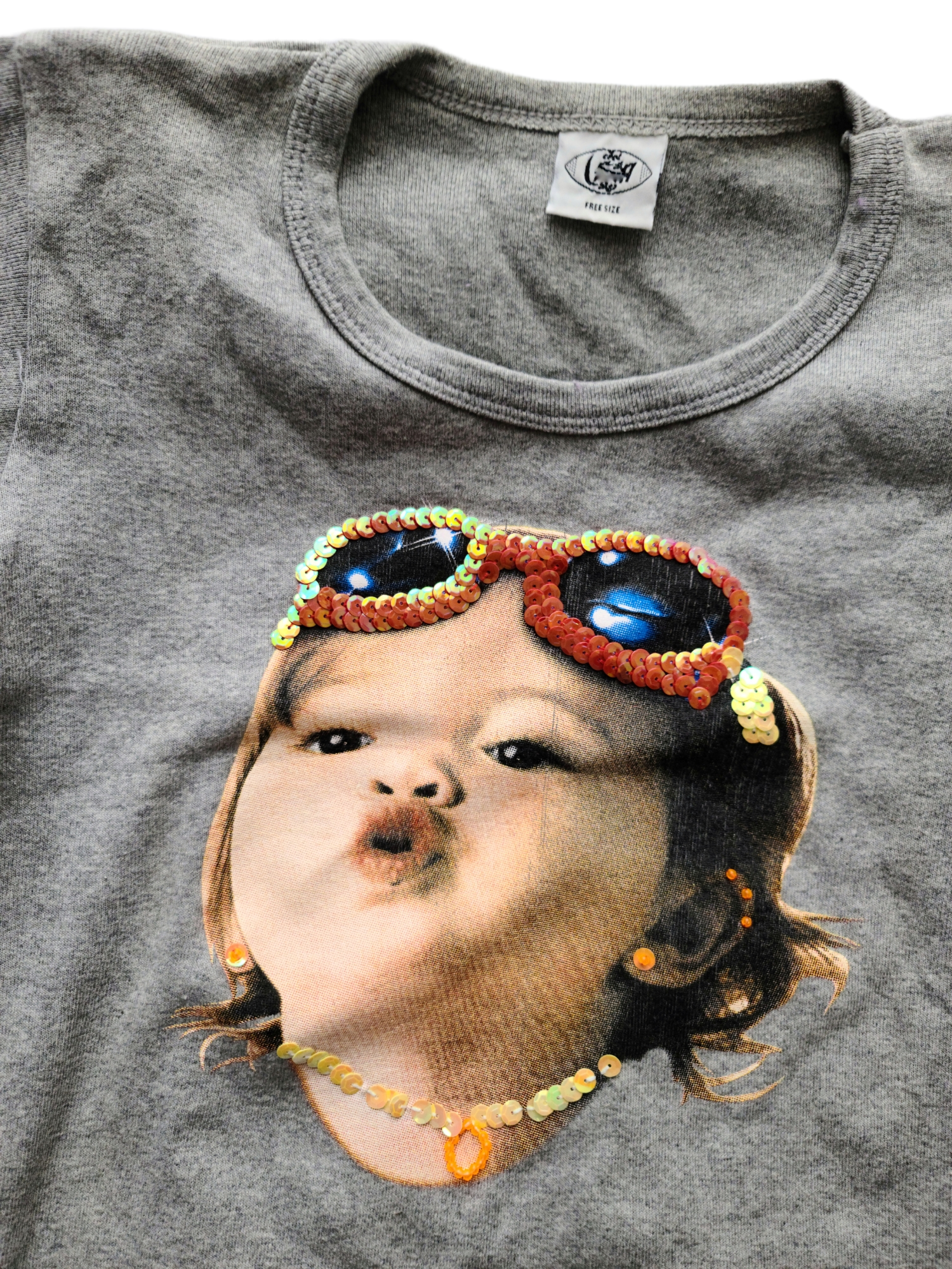 Amazing grey baby printed t-shirt, vintage harajuku cyberpunk archive. Embossed rhinestone and piercing details. RARE.