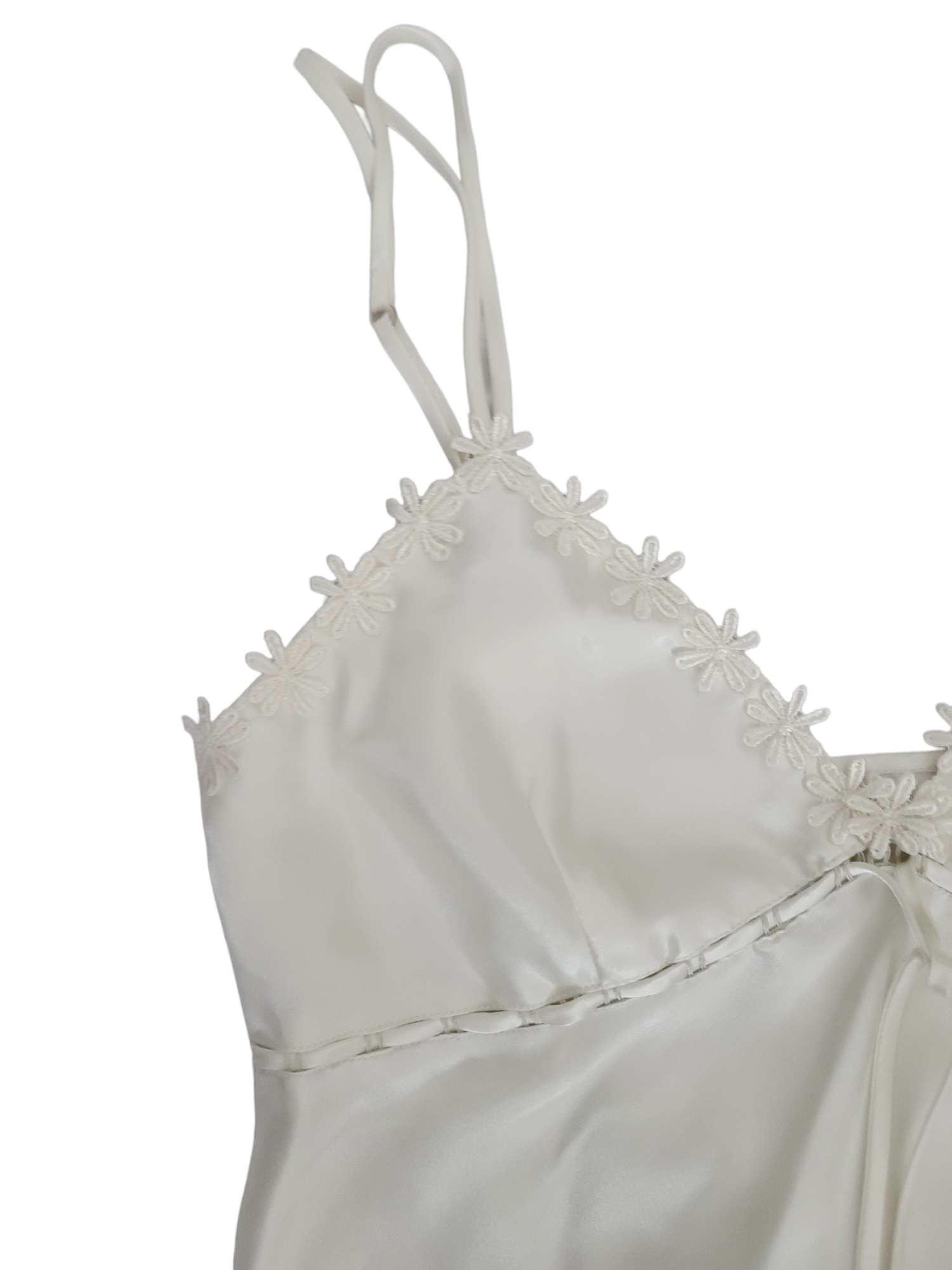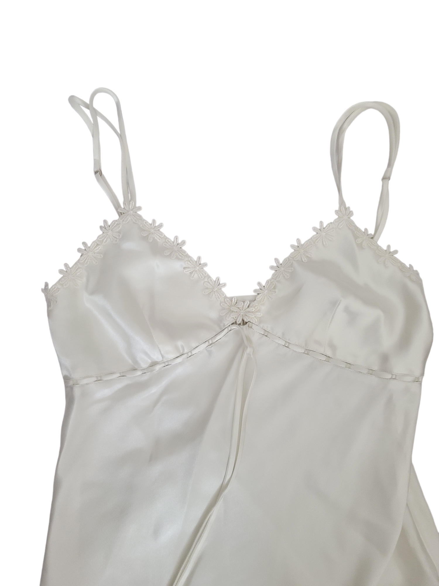 Very beautiful white satin dress with flirtatious y2k straps with pink floral embroidery.