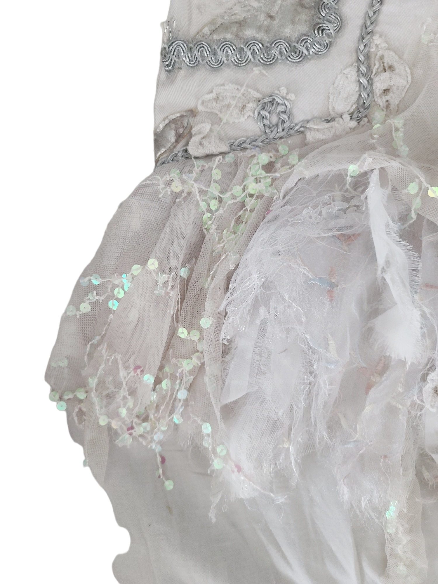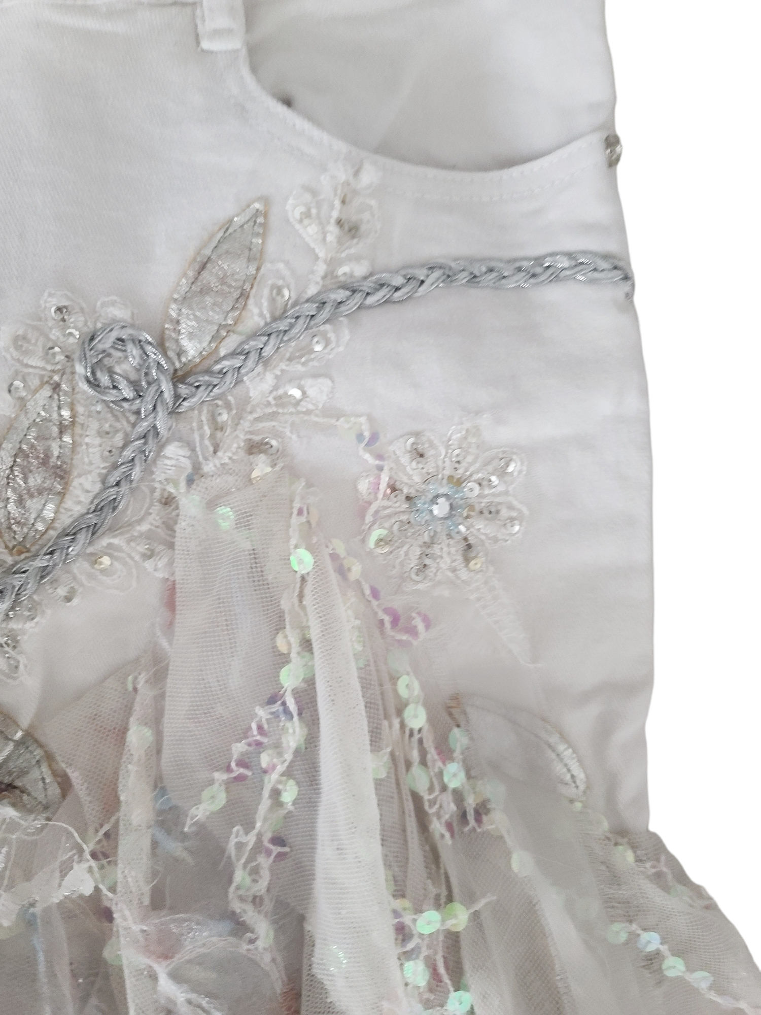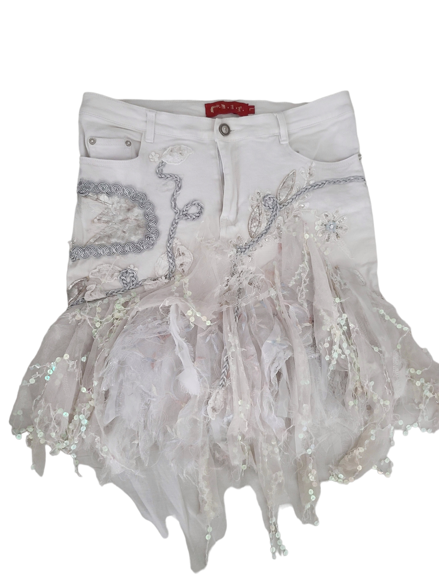 Magnificent white y2k fairycore denim skirt with mesh and sequin ruffles