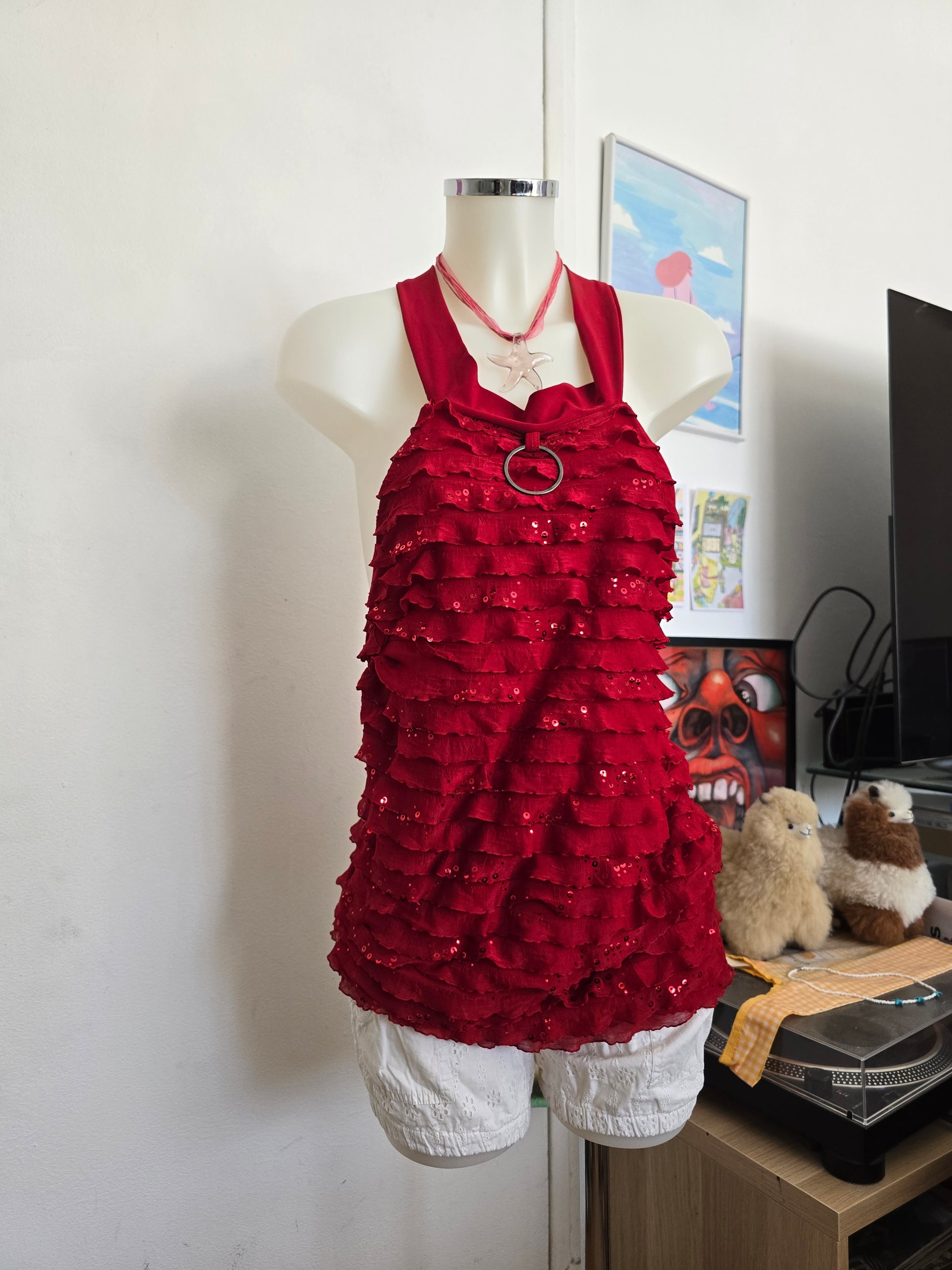 Y2k vintage indiesleaze ruffled sequin halter dress