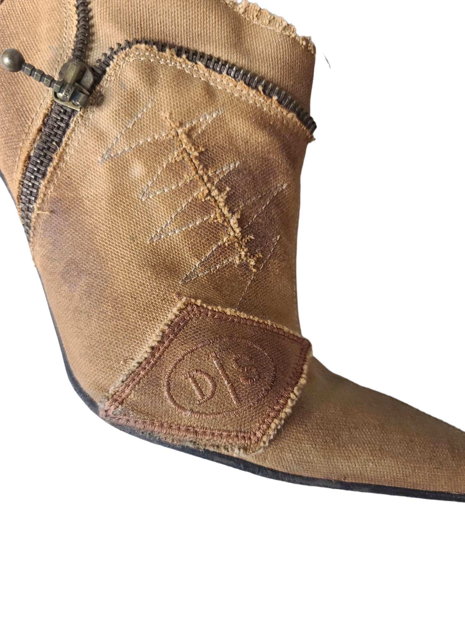 Amazing pair of 90s grunge, 90s brown destroy. Pointed design with small heel. Frayed effect and zips. Rare.