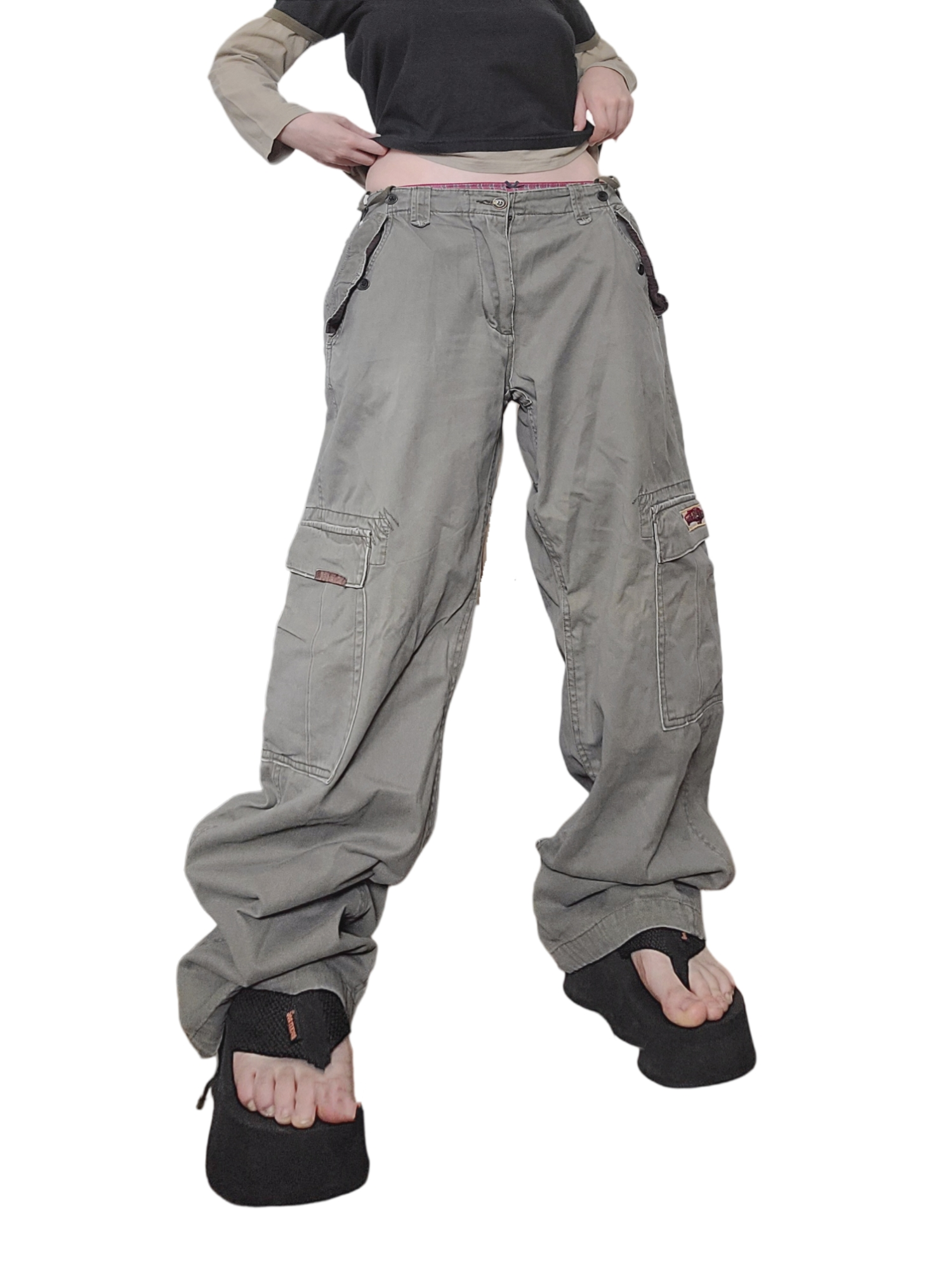 Amazing vintage 90s grunge khaki baggy pants with multiple pockets. Drawstrings at the waist and ankles. Adjustable waist with metal drawstrings on the sides. Skater style.