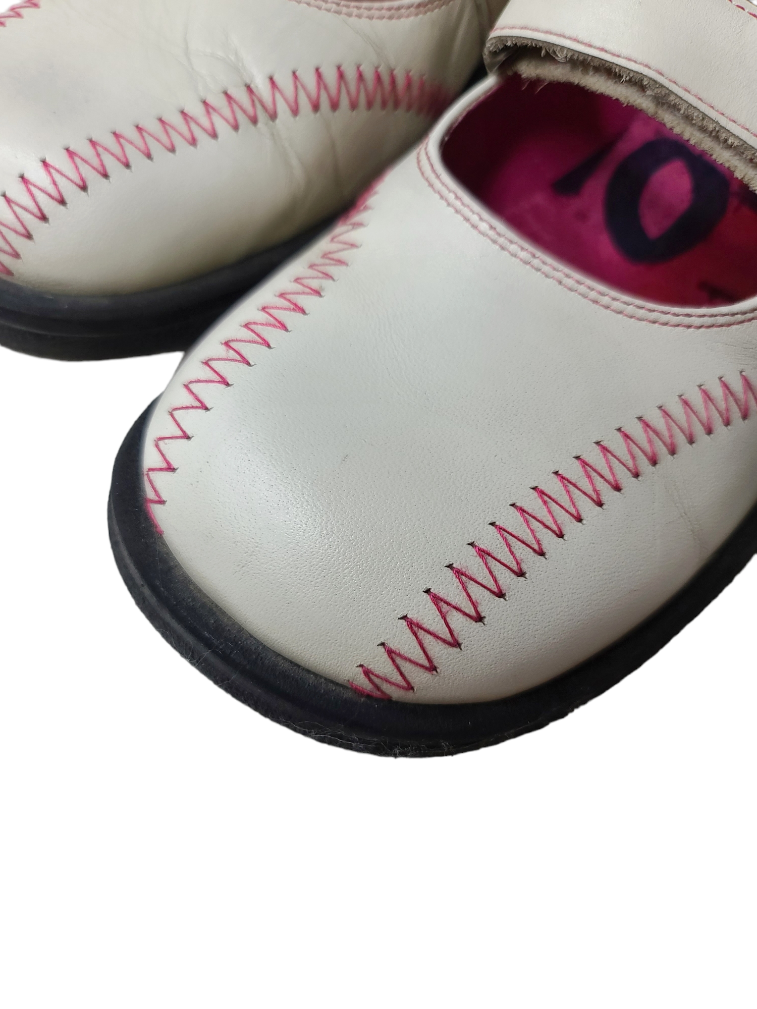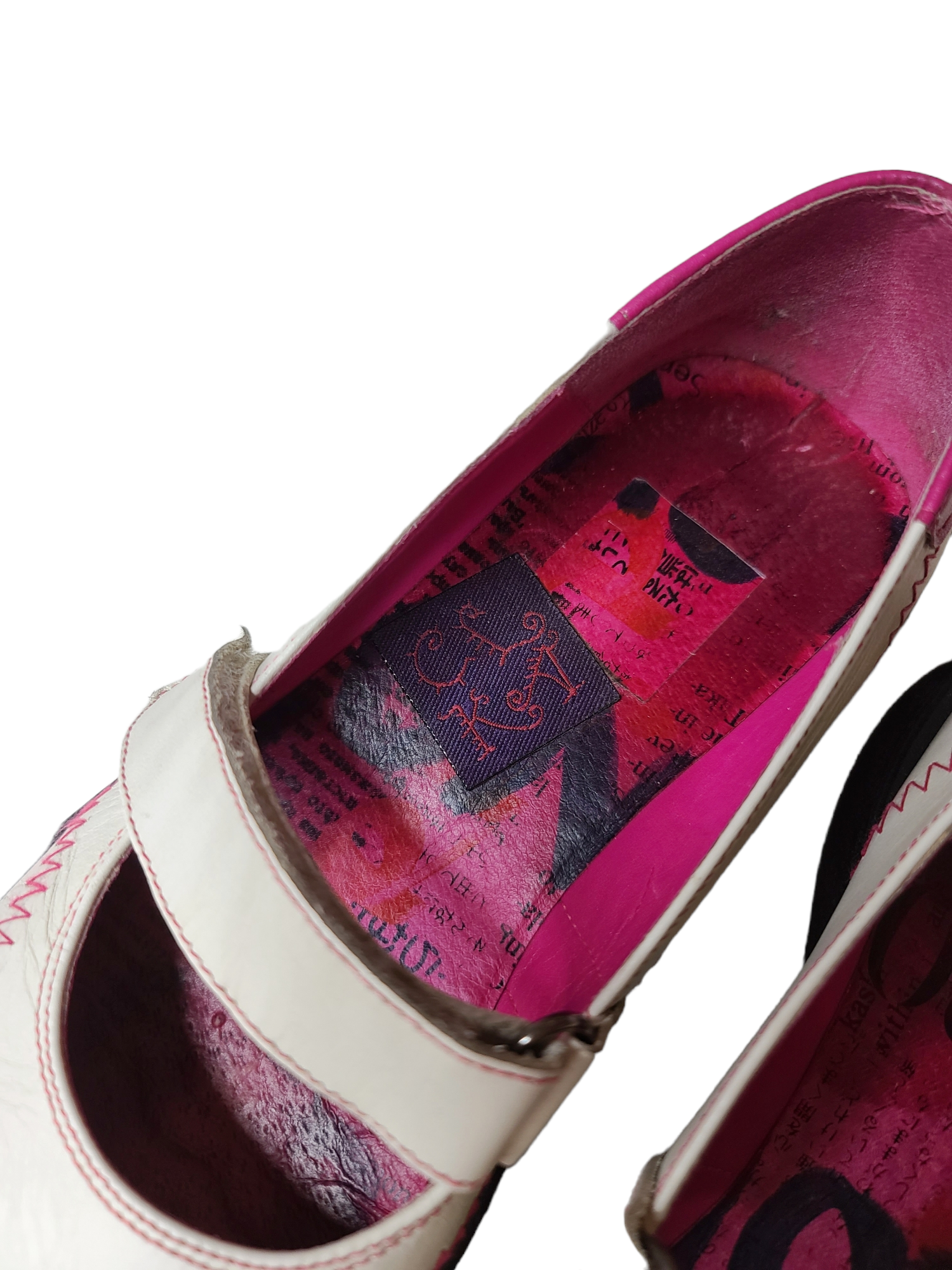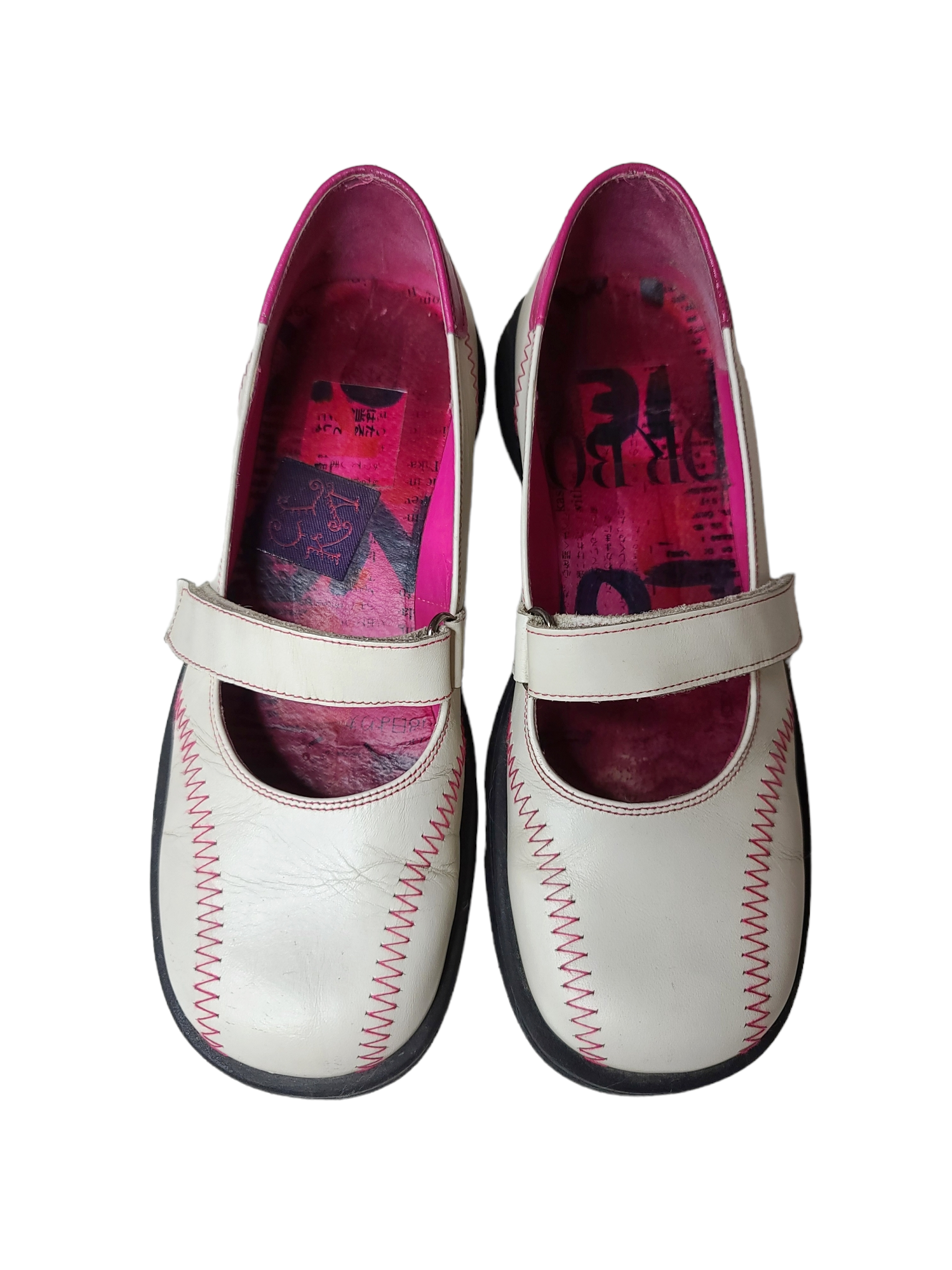 Very beautiful white and pink cybery2k sportswear square ballet flats with velcro, to wear with a big pair of white ribbed socks or fancy tights. Harajuku style. Newspaper archive effect insole.