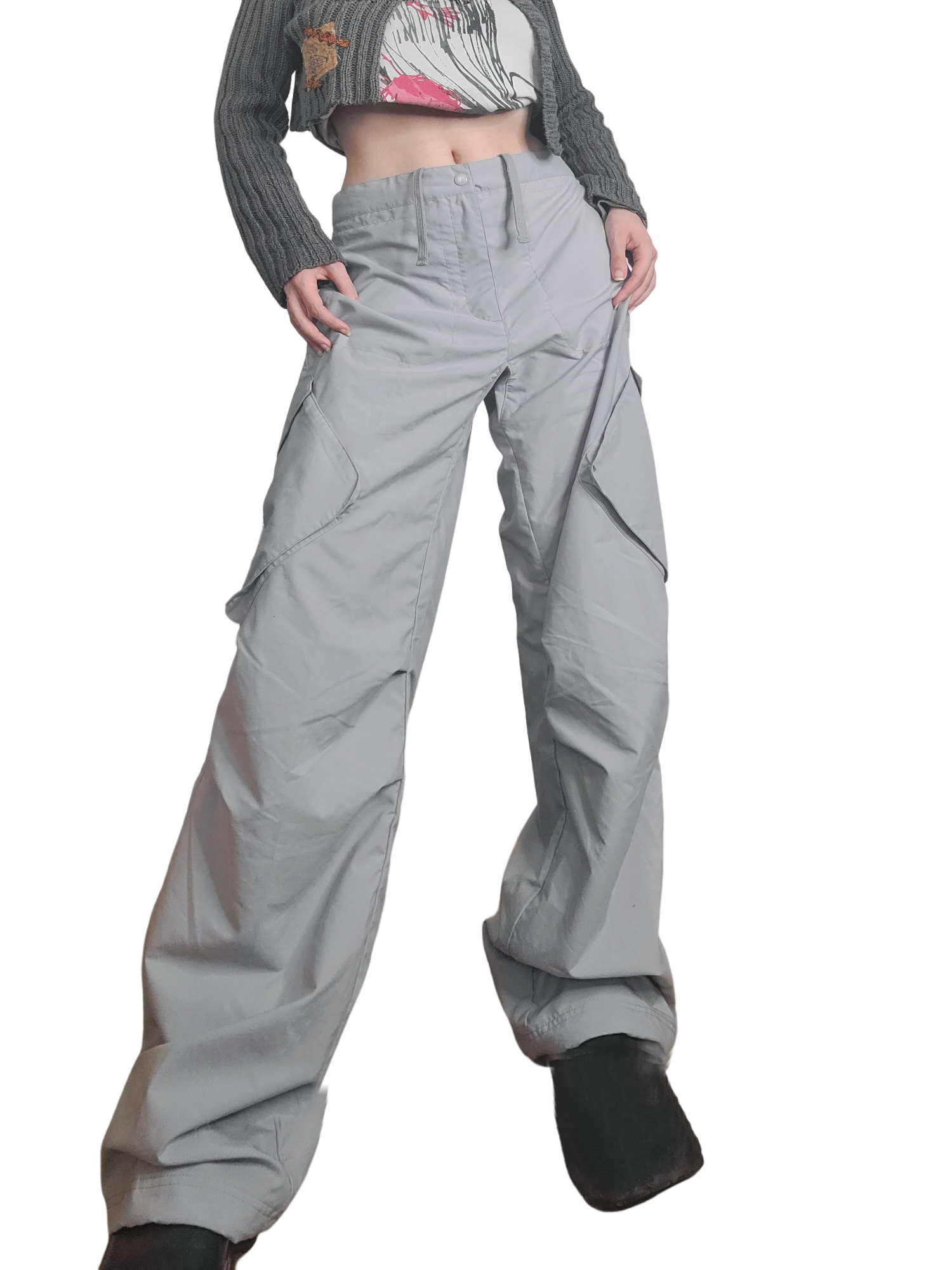 Oversized gray gorpcore parachute cargo, multi-pockets with velcro and drawstring at the waist and ankles. Old Domyos sportswear model from the early 2000s.