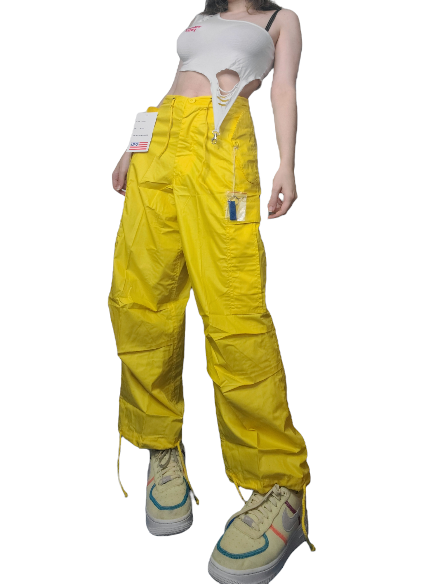 Vintage yellow parachute cargo, military style, multi-pockets and drawstrings.