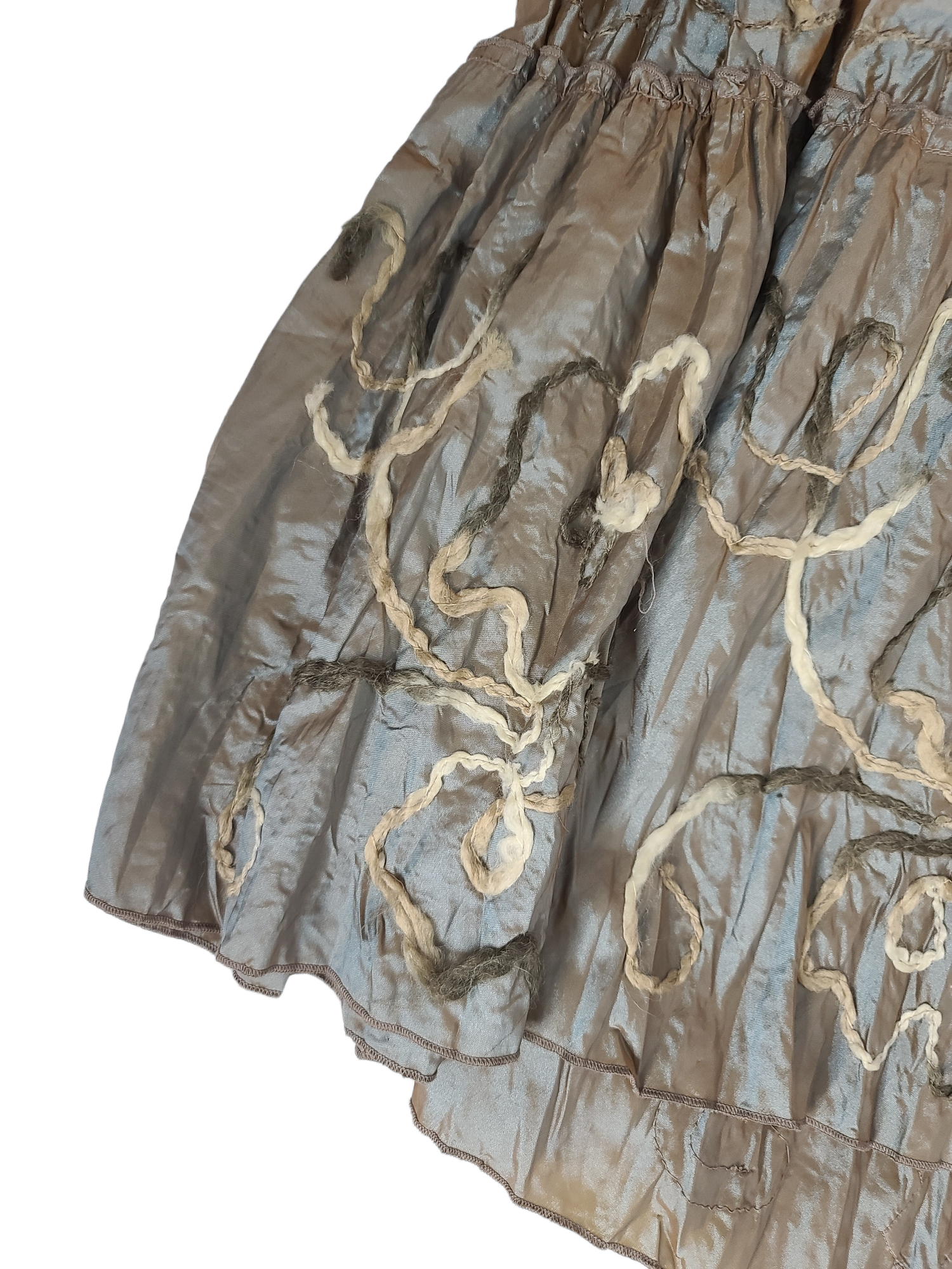 Very beautiful long khaki satin fairycore skirt, vintage from the 2000s, with ruffles. Floral embroidered fabric details.