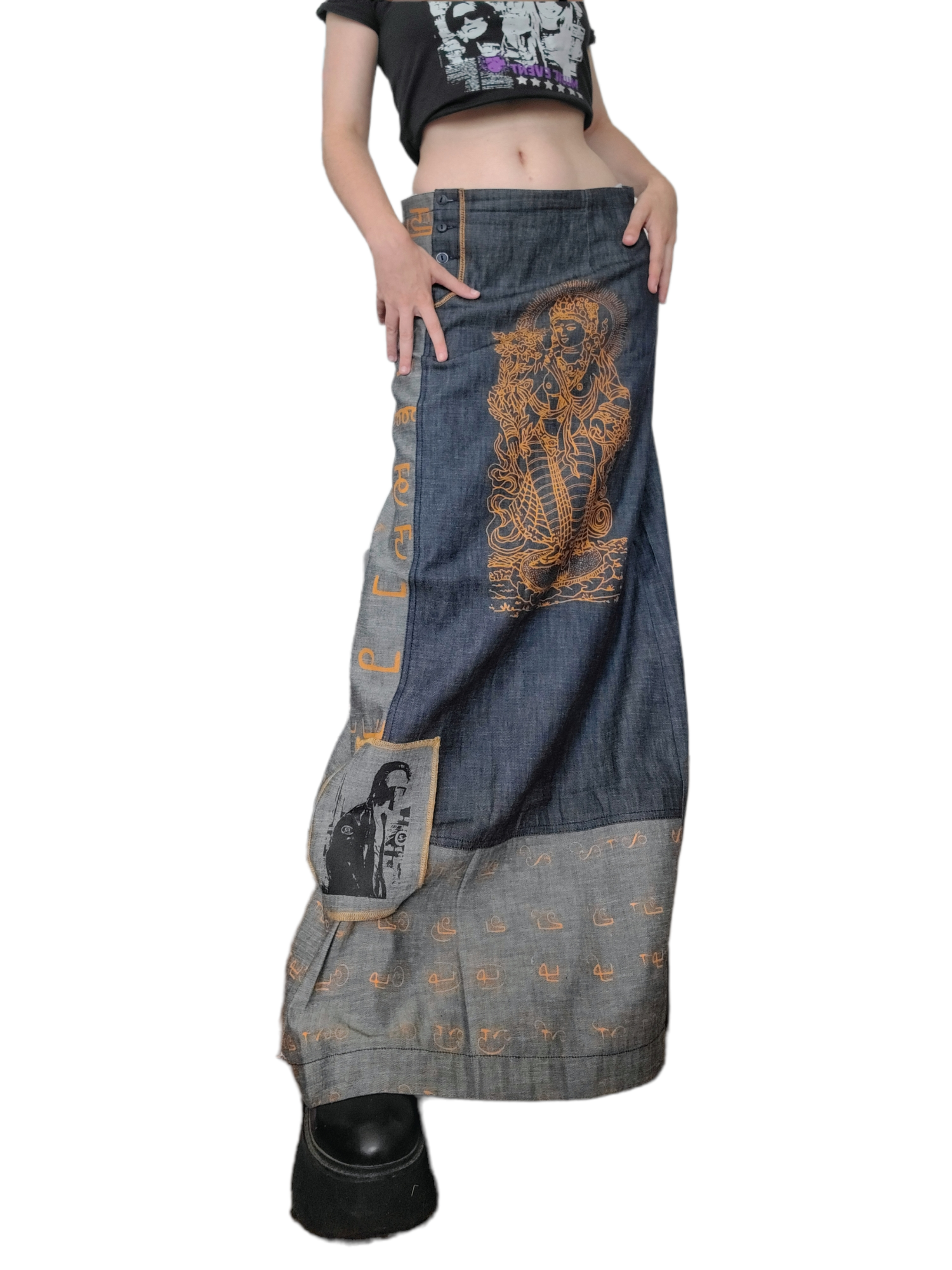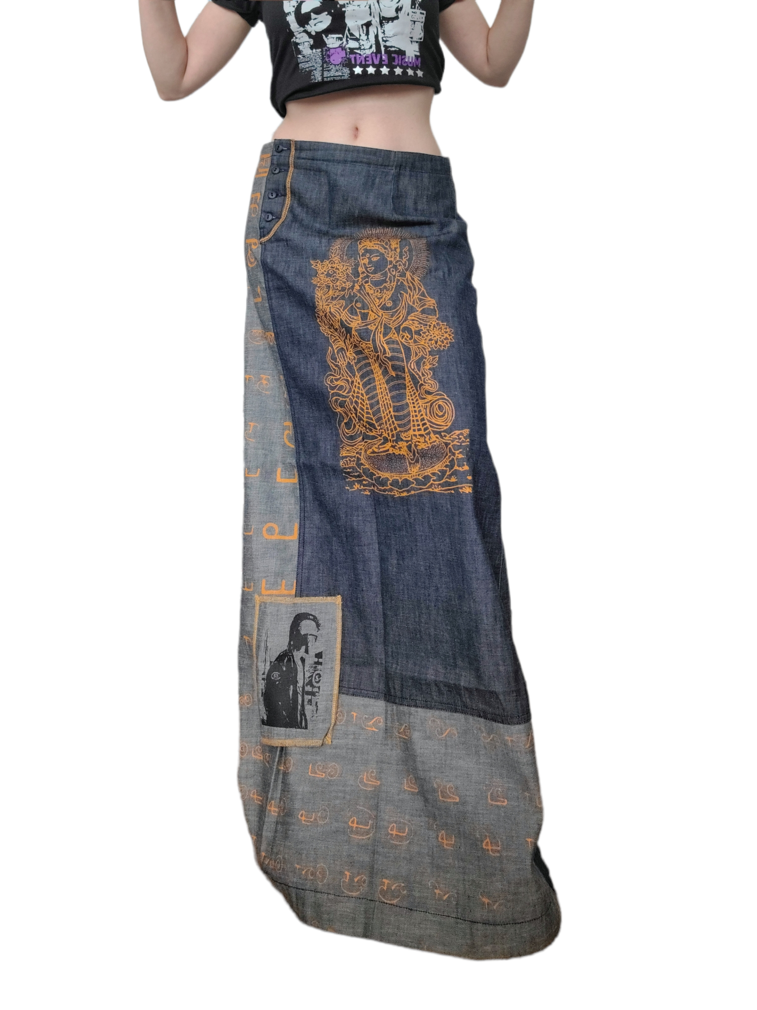 Amazing cybery2k long vintage jean patchwork skirt, bohemian style printed.