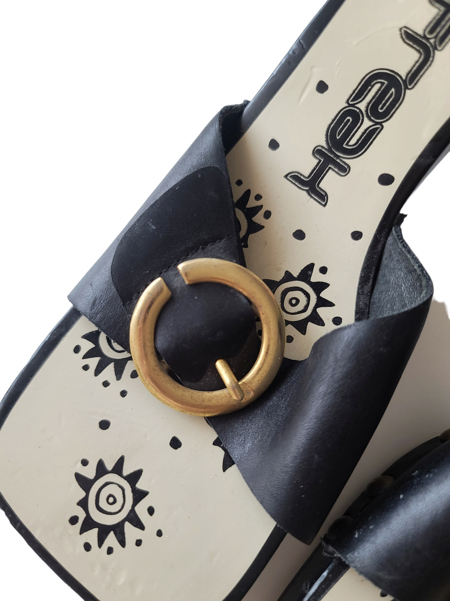 Very nice black grunge cyber pair of 90s heeled mules. Square, studded strap, heels and toes. Rave archive 90s.