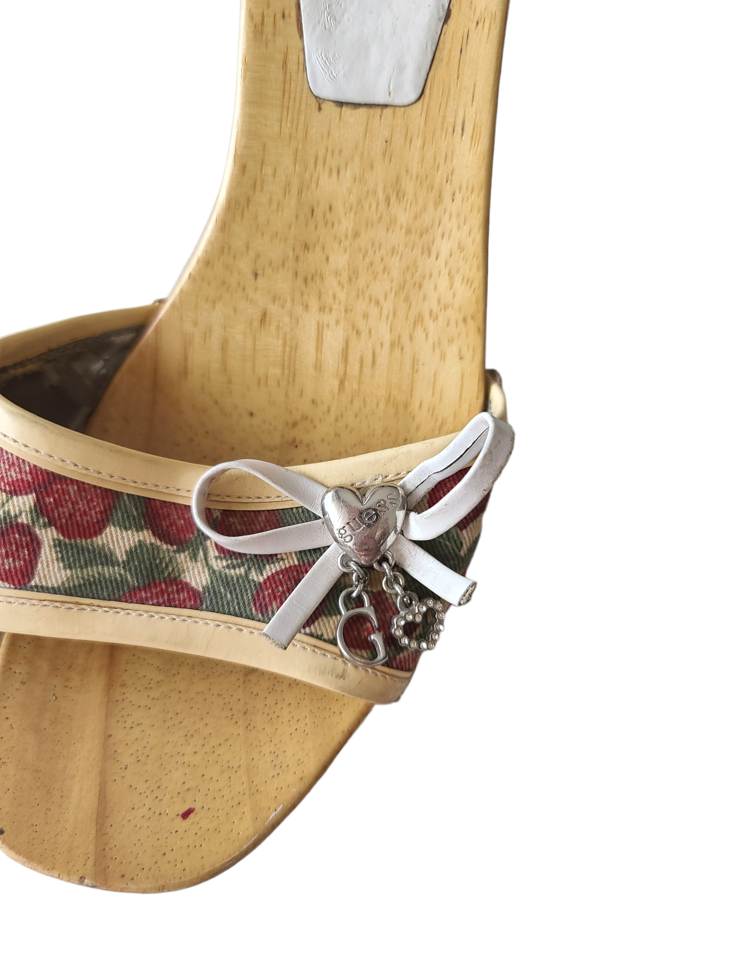Incredible studded pair of Guess heeled mules, archive 2000. Mcbling y2k model with strawberry and chain print and heart rhinestones and ribbons. Kawaii gyaru style.