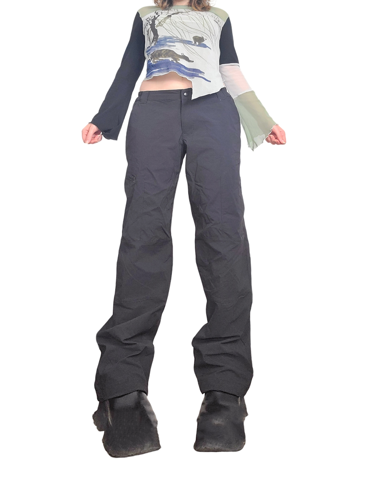 Black parachute texture pants, gorpcore, neutral tone, oversized, with elastic waist.
