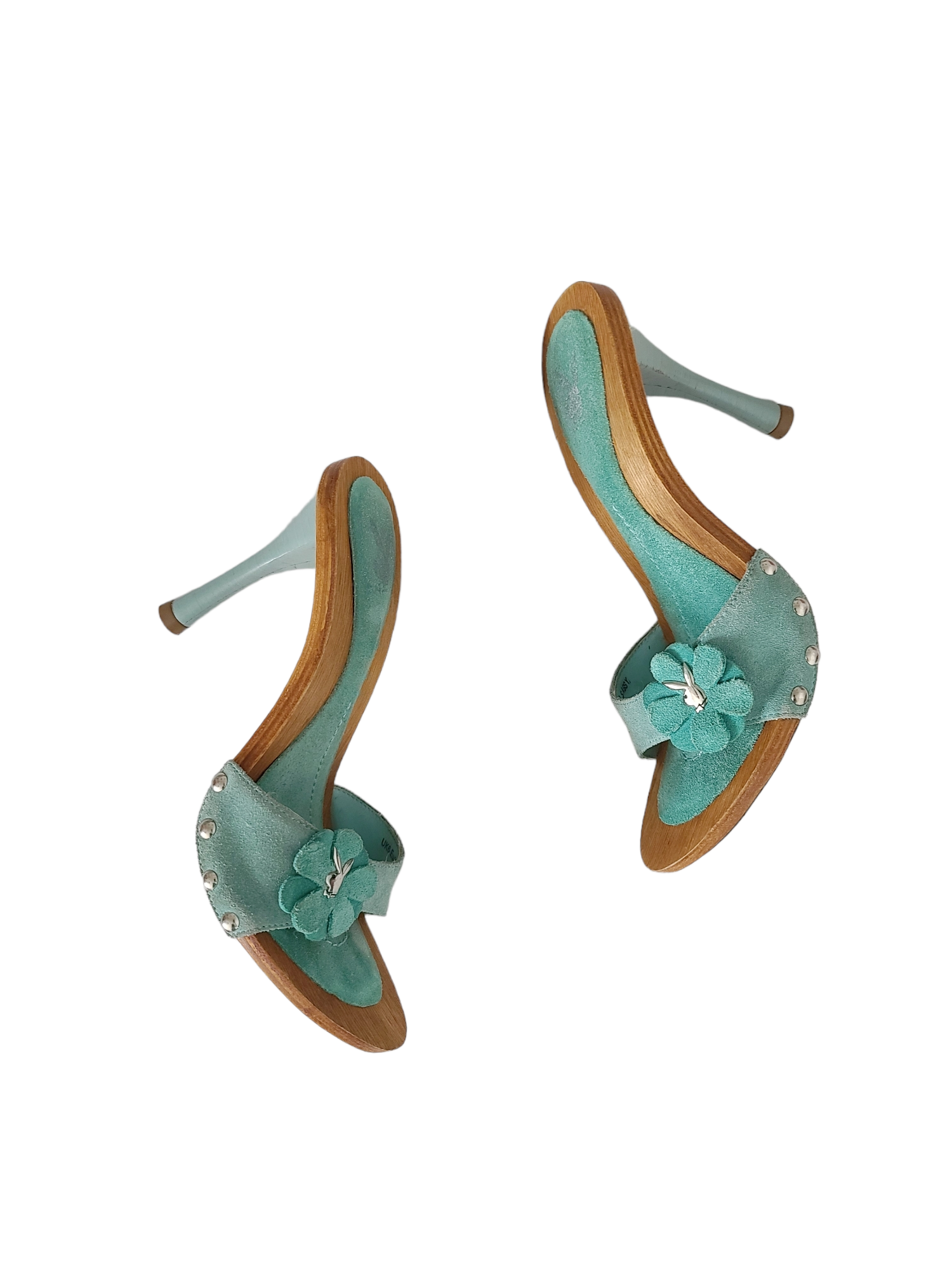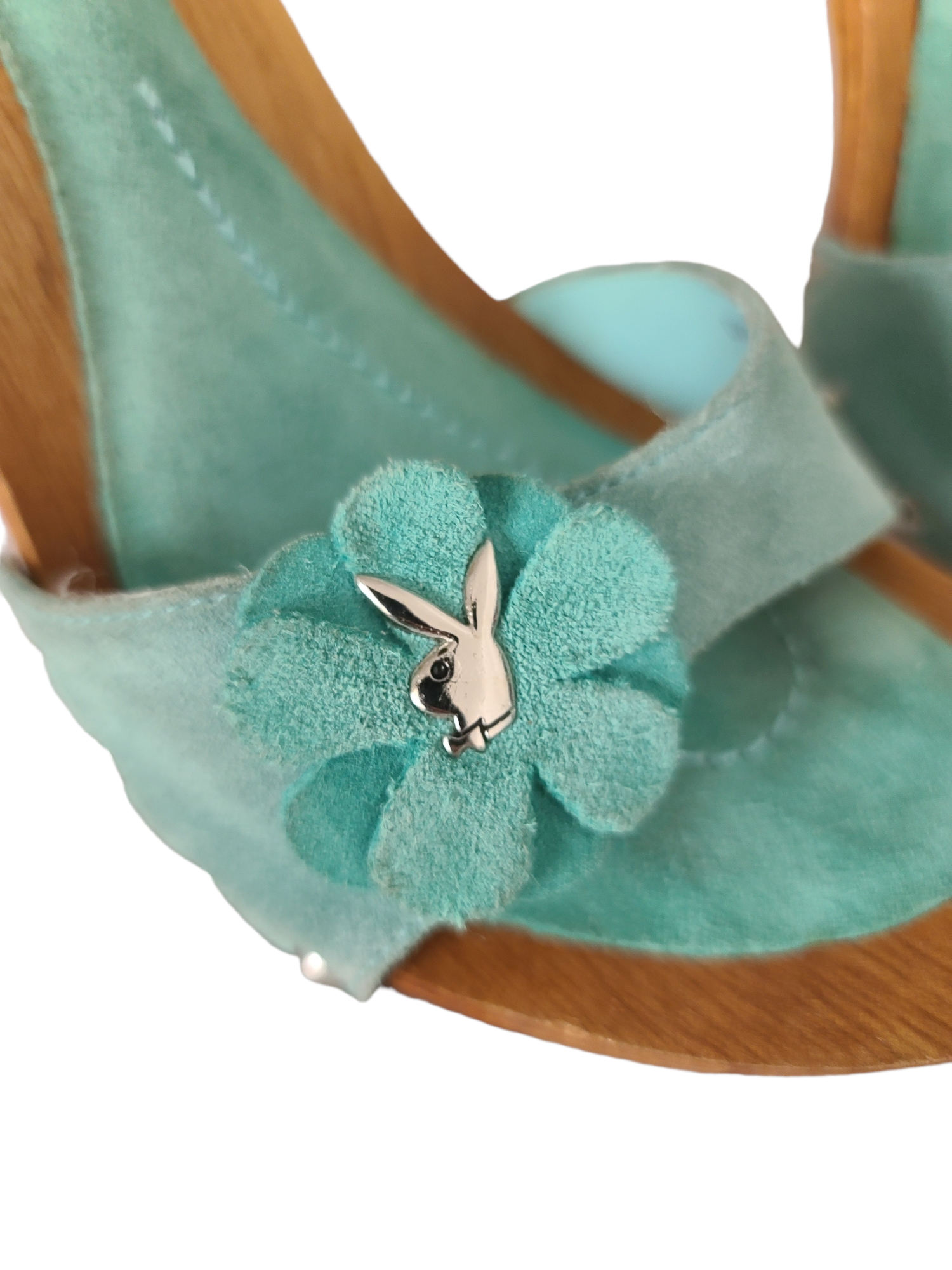 Sublime y2k green wooden heeled mules, Playboy archive, coquette mcbling.