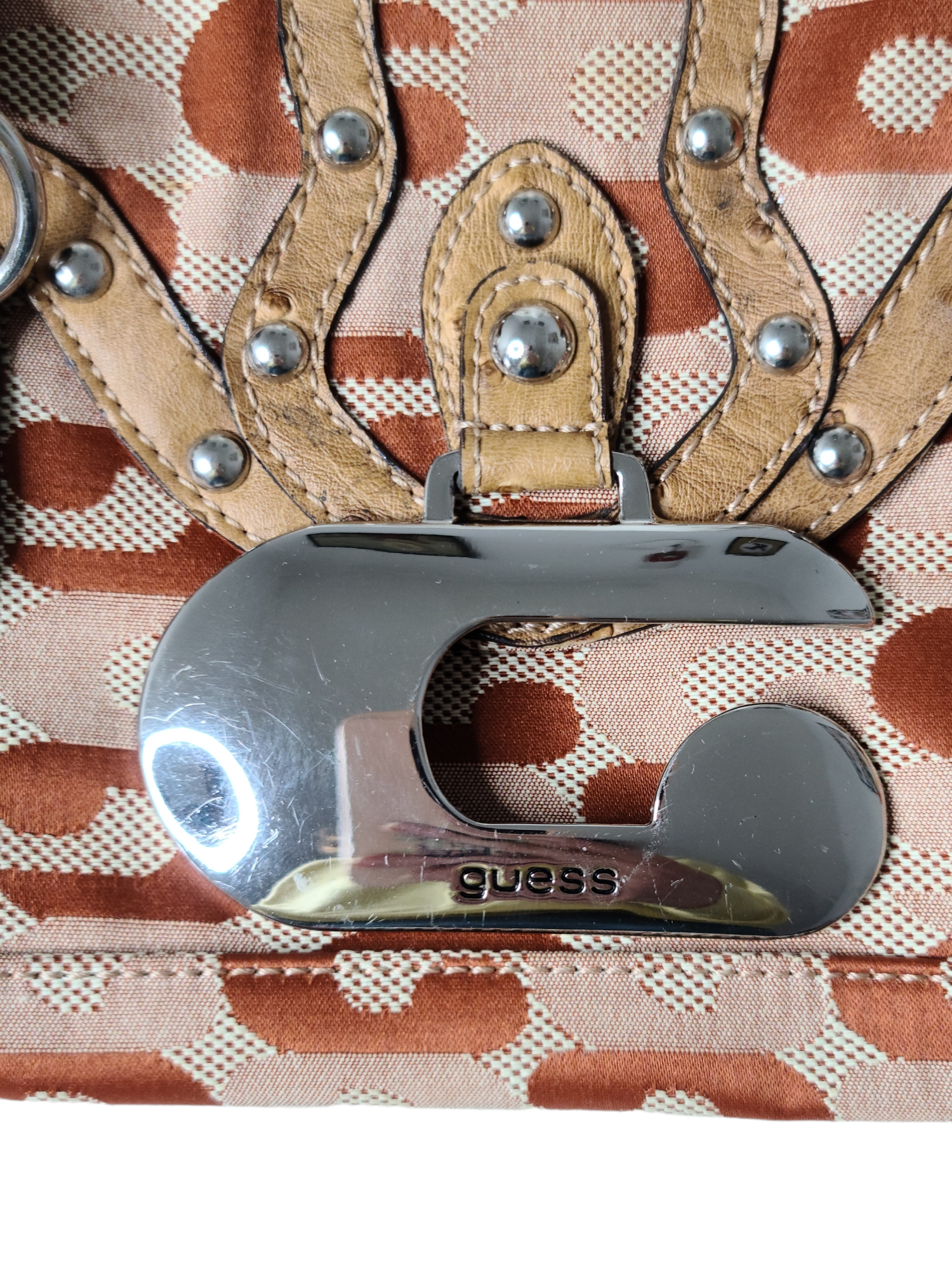 Vintage 2000s Guess baguette bag, brown and cream. Stud details and Guess G on the front.