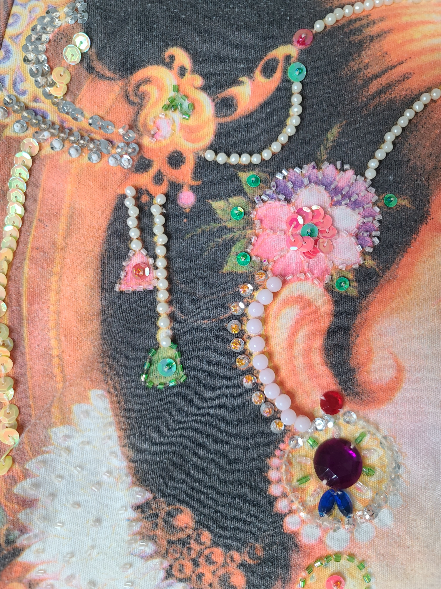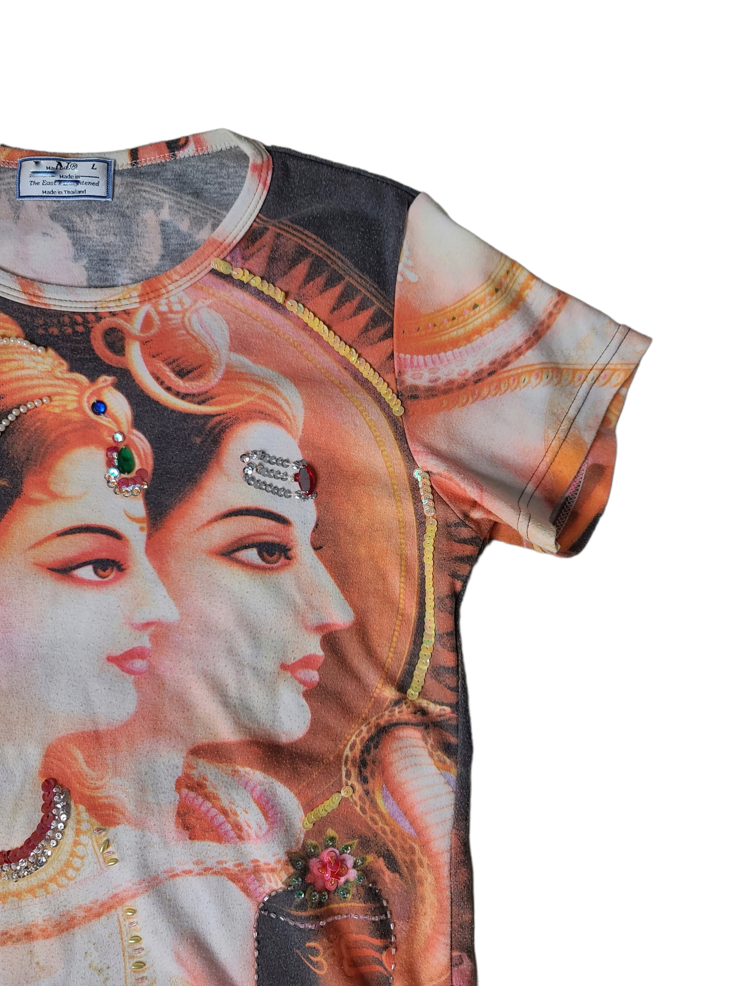 Amazing vintage 2000s cybery2k t-shirt with face and jewel print, beads and jewels in relief. Rare piece.