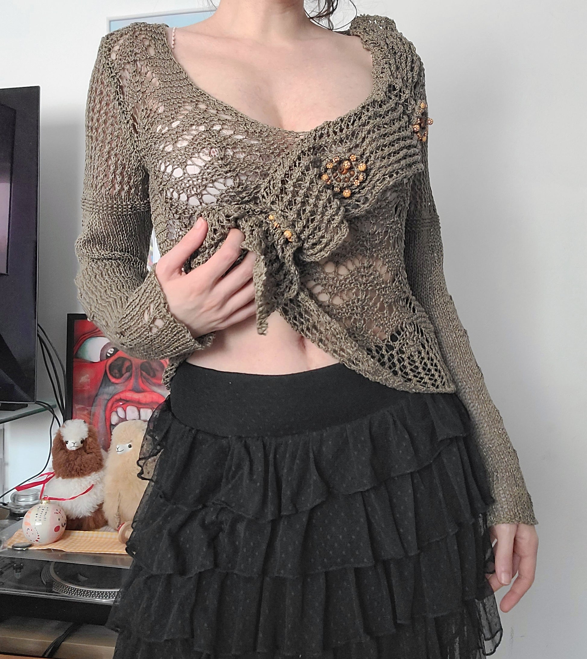 Magnificent brown vintage crochet sweater from the 2000s, bohemian, with wooden beads, fairycore.