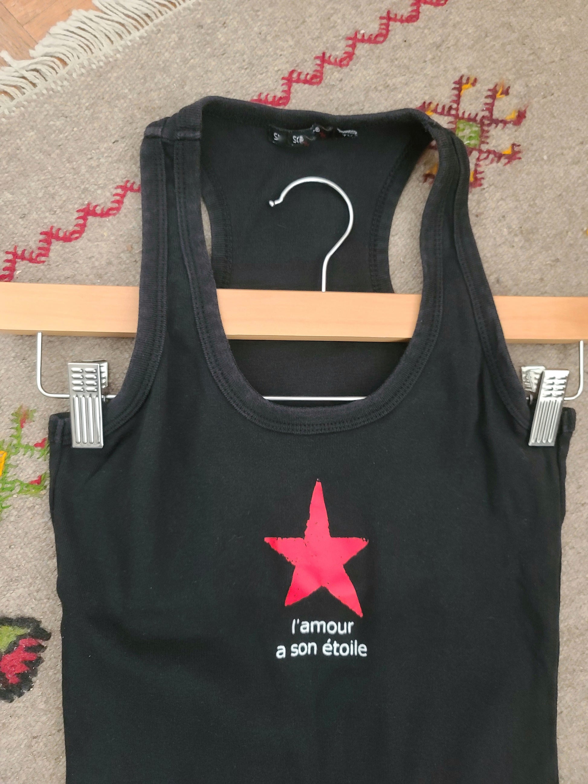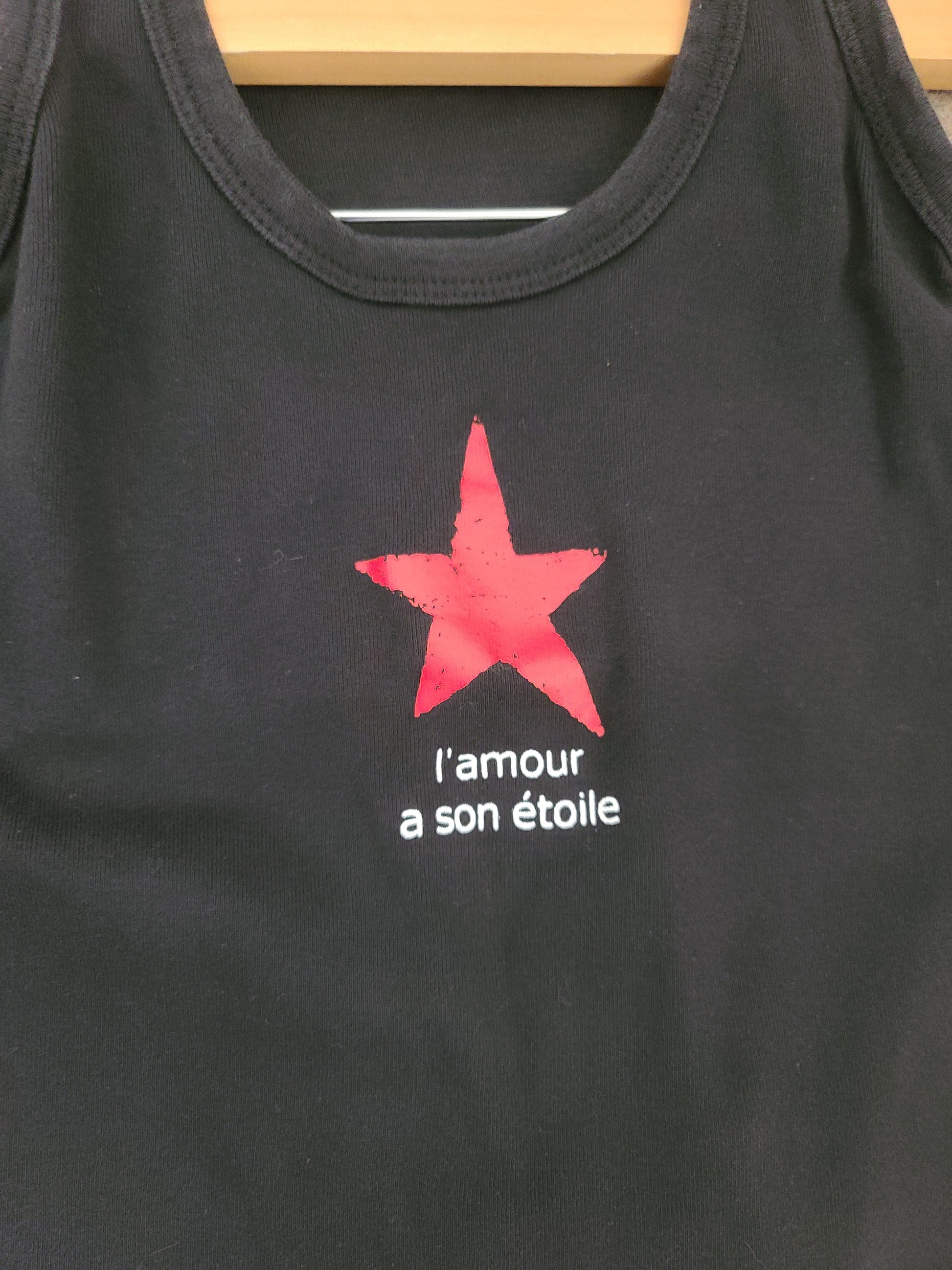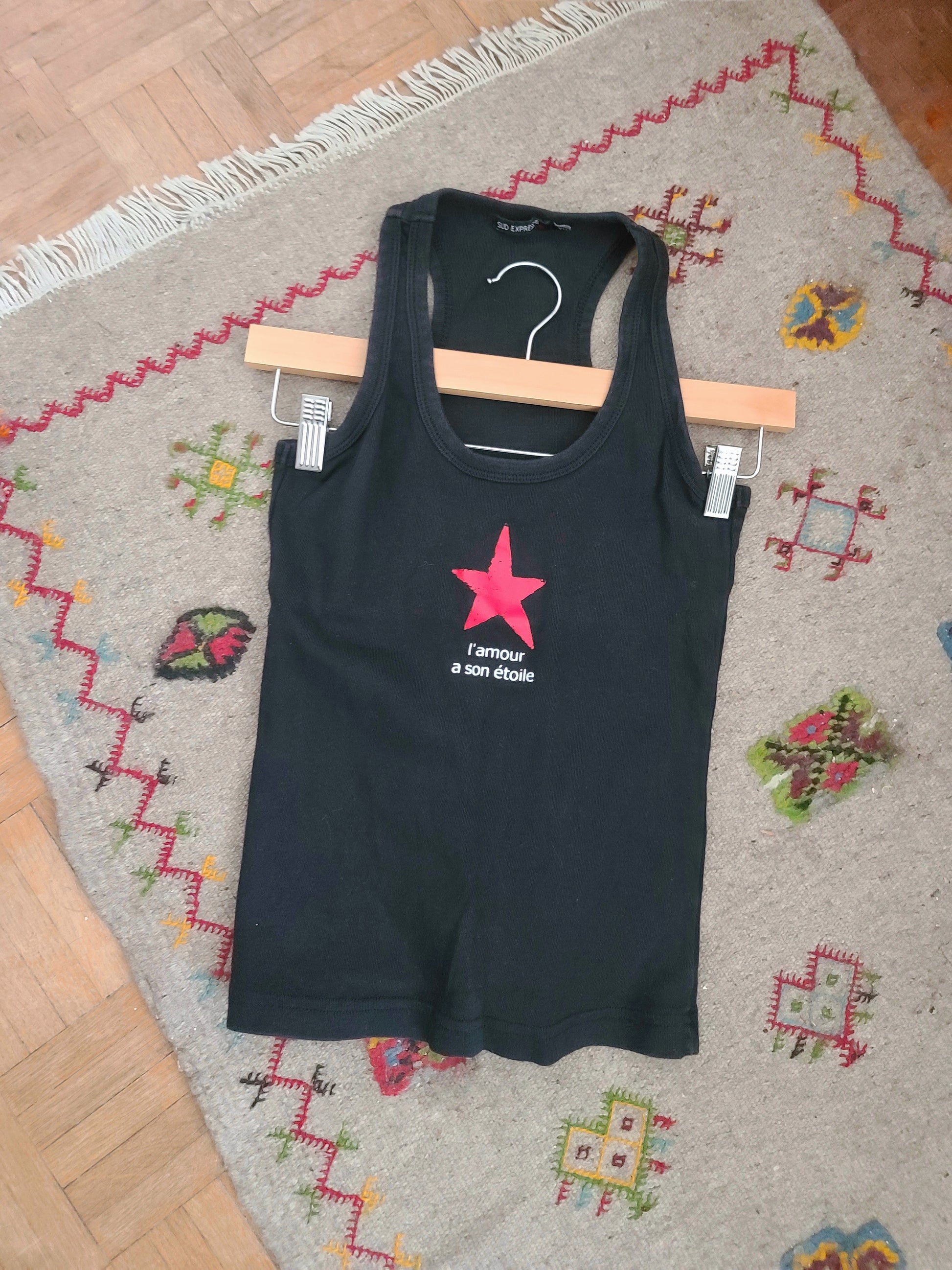 Beautiful vintage black top from the 90s with red star print, "love has its star".