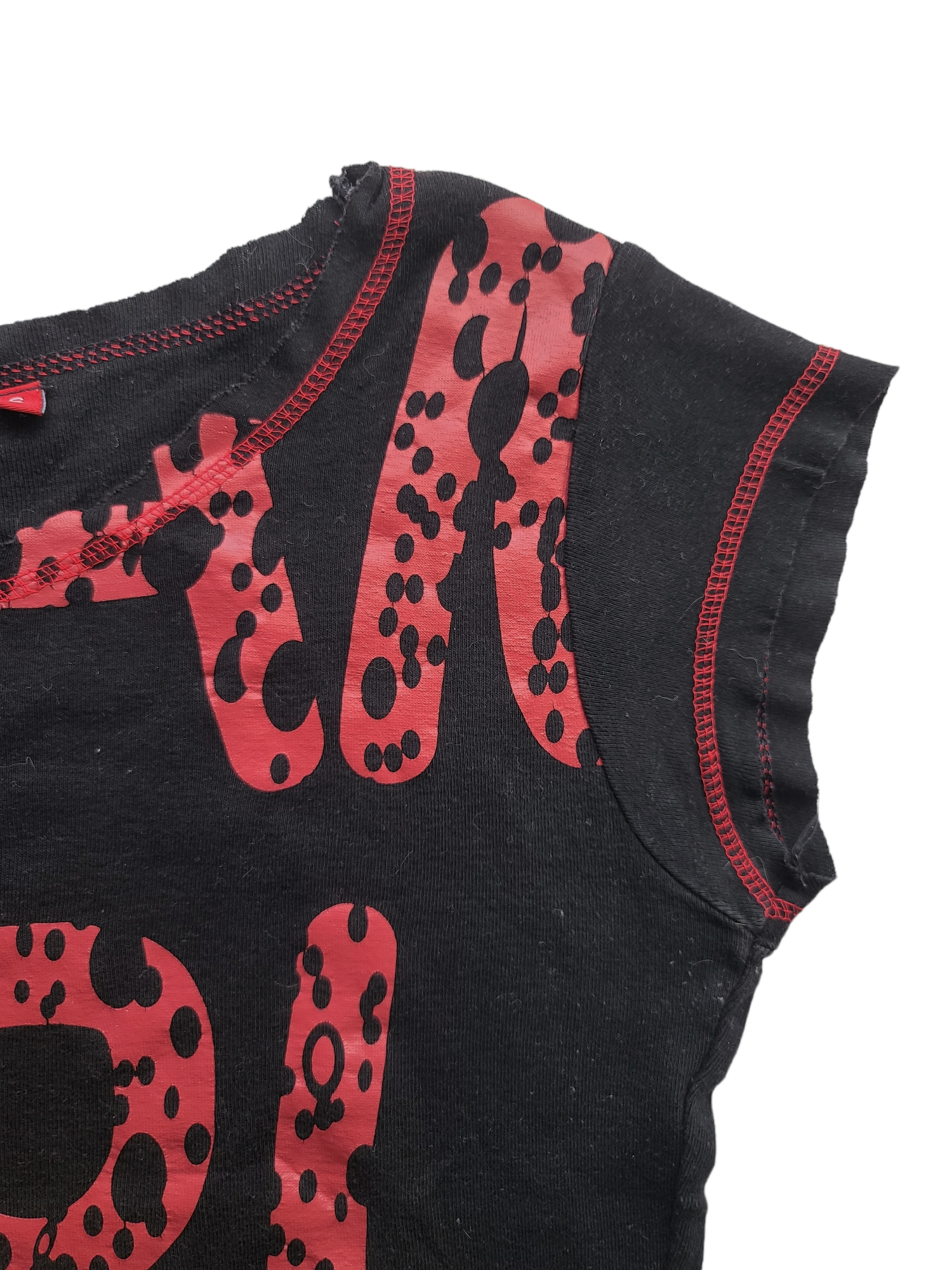Beautiful black vintage y2k streetwear t-shirt with red leopard text print, bimbocore.