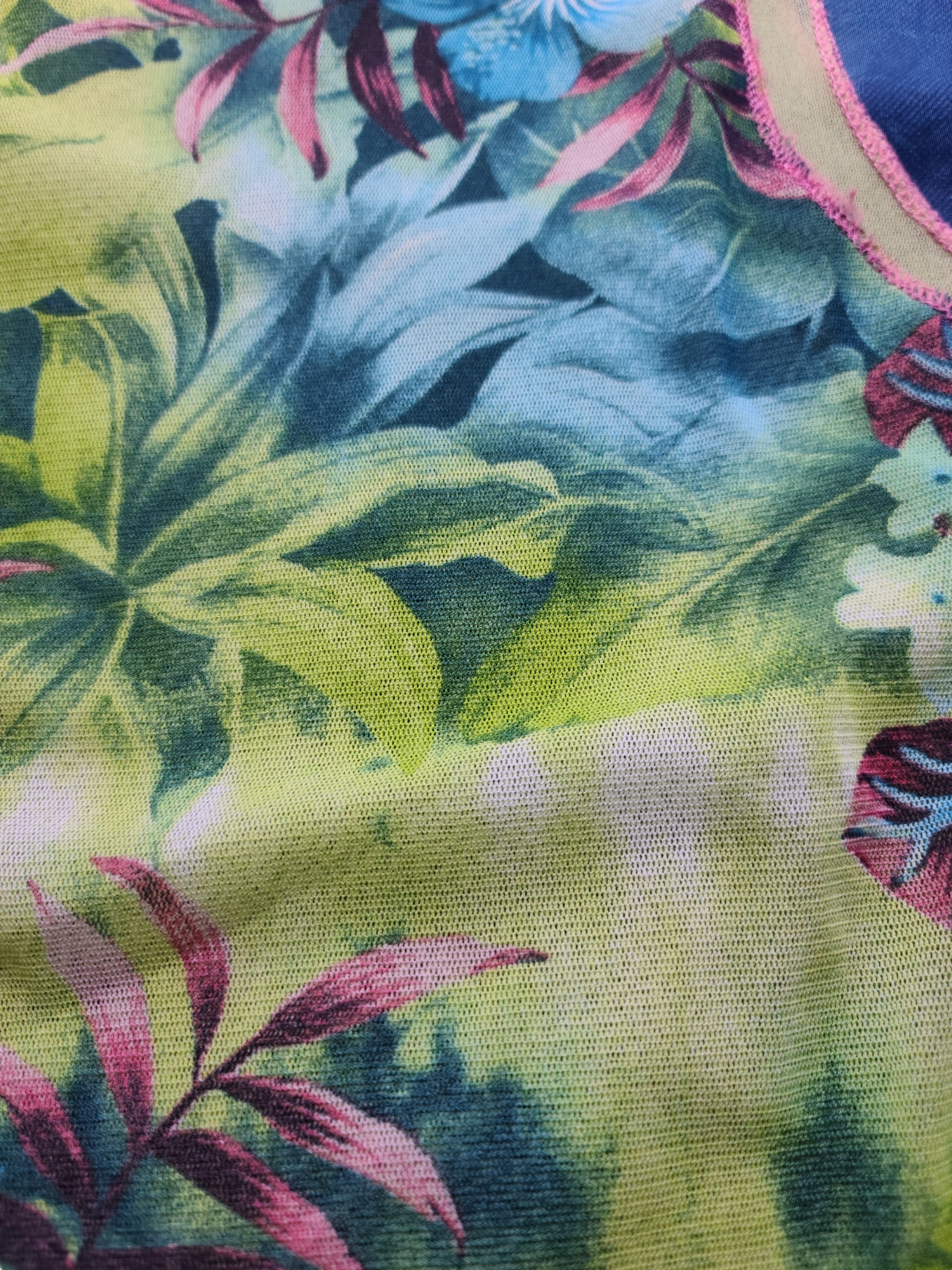 Beautiful vintage mesh top from the 2000s, tropical plant print, blue green and pink. Overlocked seams. Indie style.