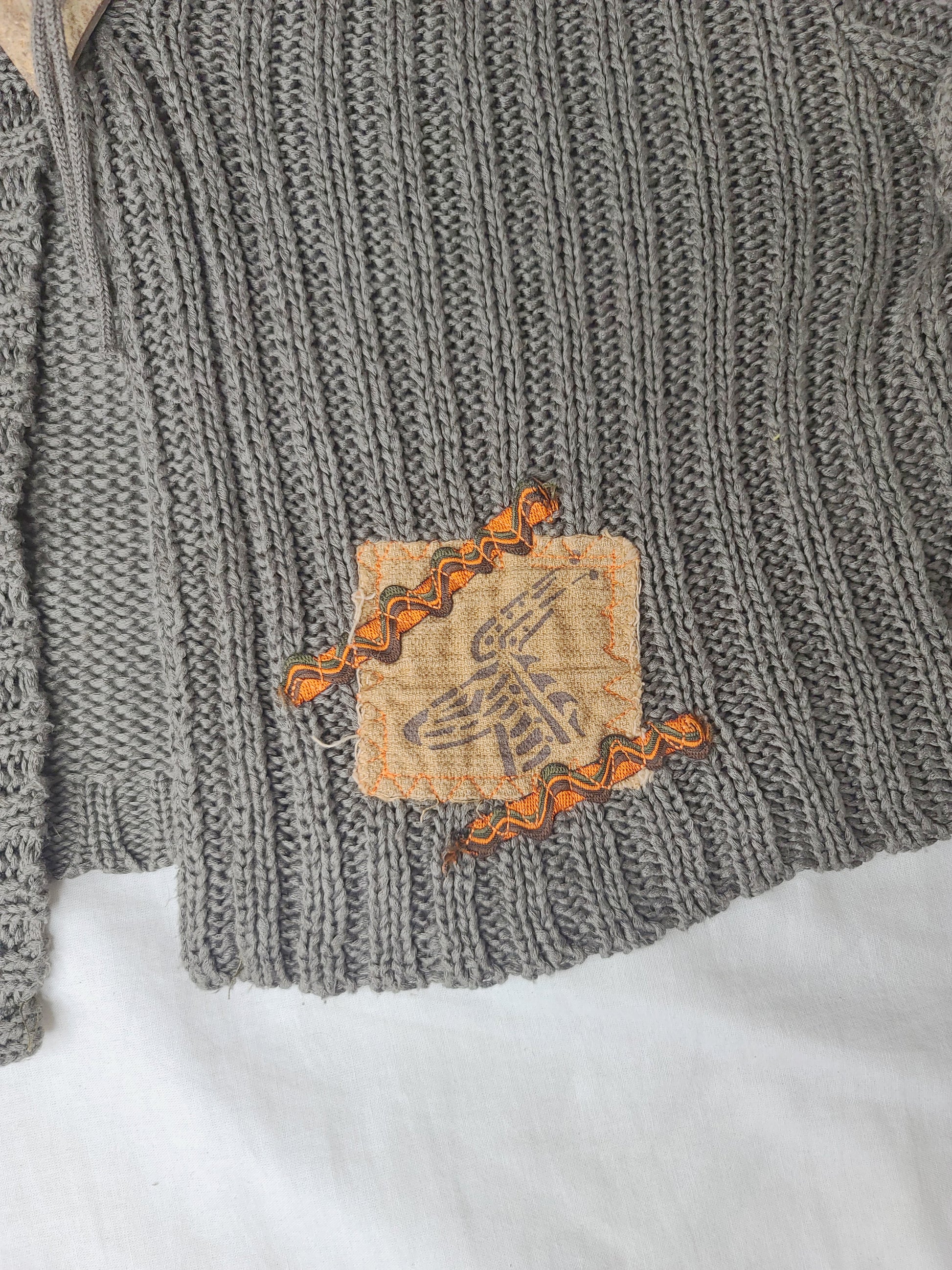 Beautiful vintage bohemian gray mesh bolero vest, stitched pattern details and wooden triangle.