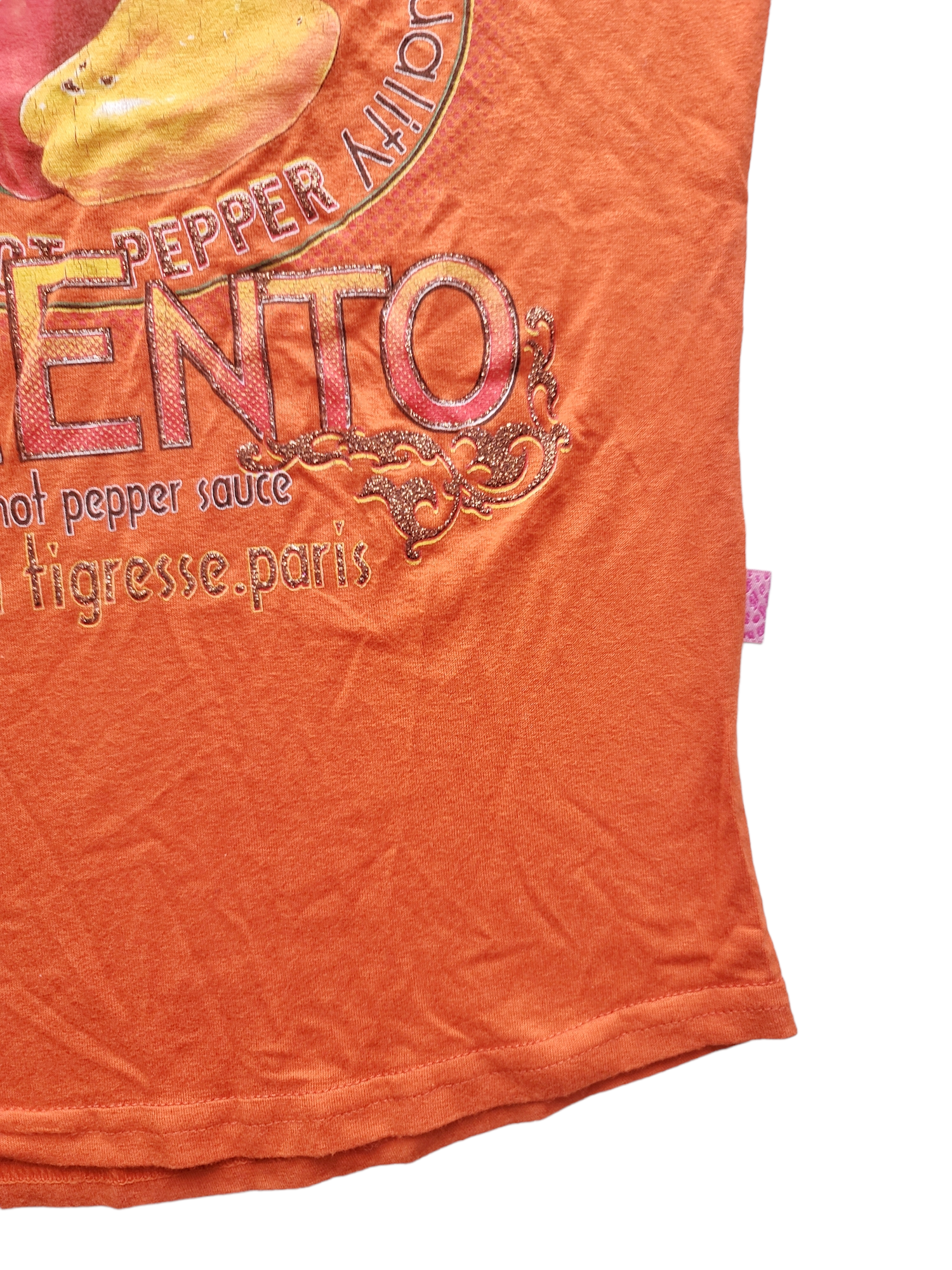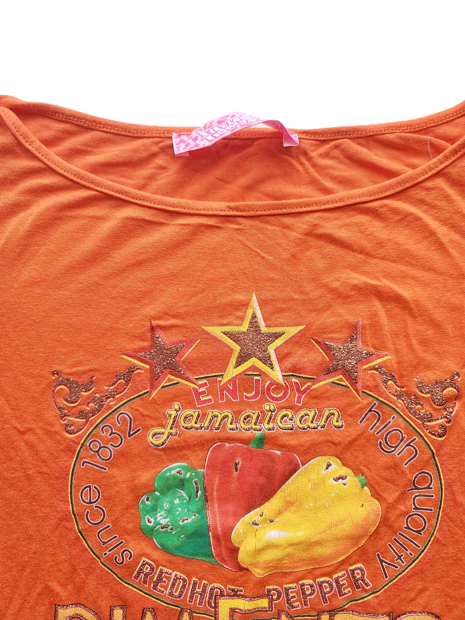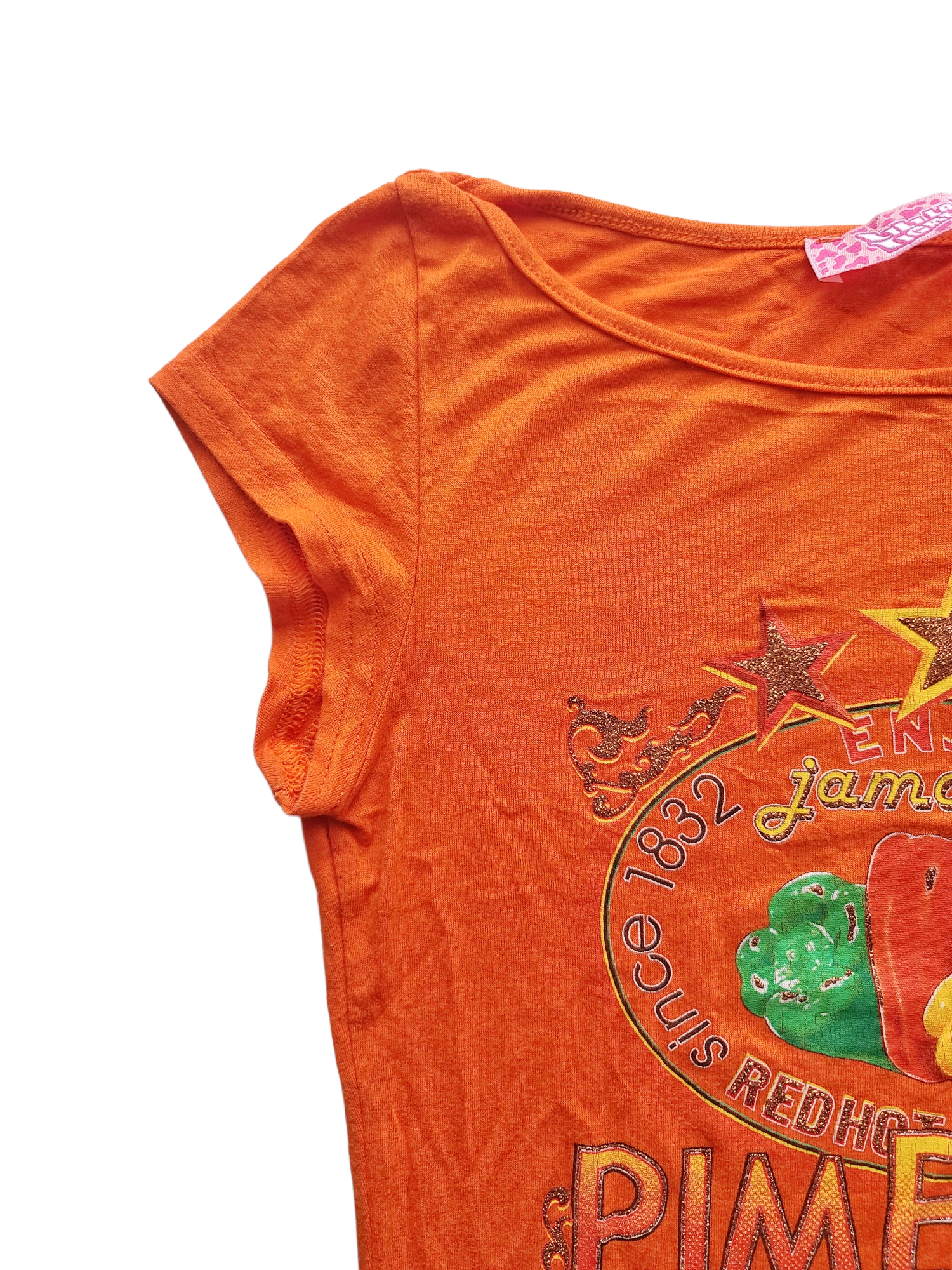 Amazing vintage orange top from the 2000s, y2k indie style. Rhinestone text and food print. Rare archive.