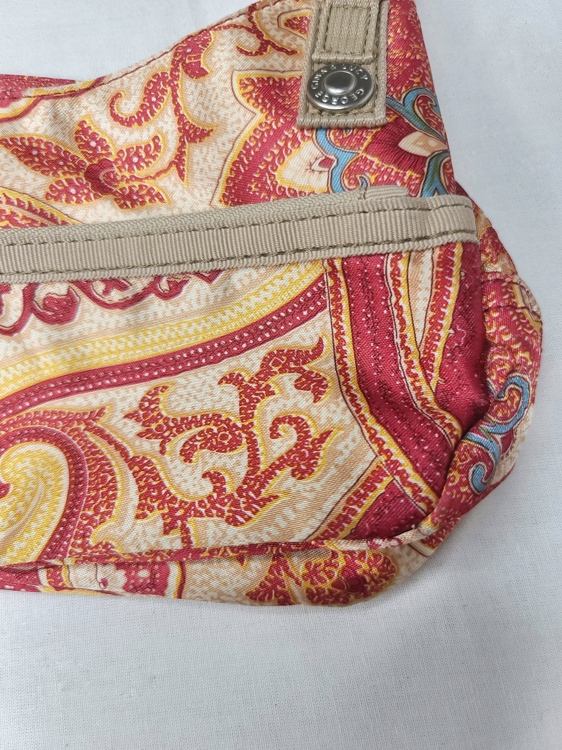 Beautiful vintage bohemian y2k baguette bag, red and orange arabesque patterns, George Gina and Lucy. "Small world" model. Khaki lining. 3 storage spaces + inside pocket and back pocket.