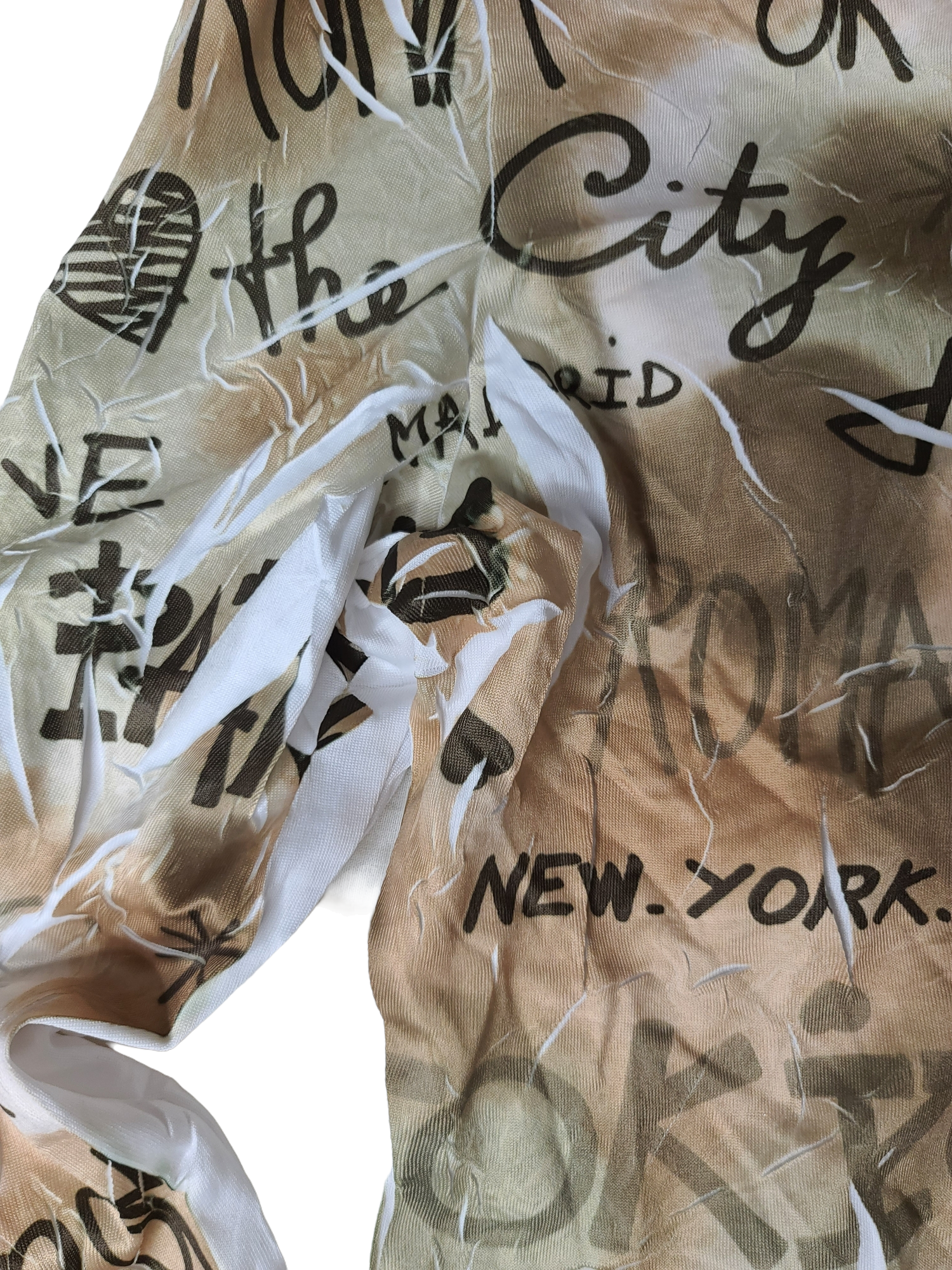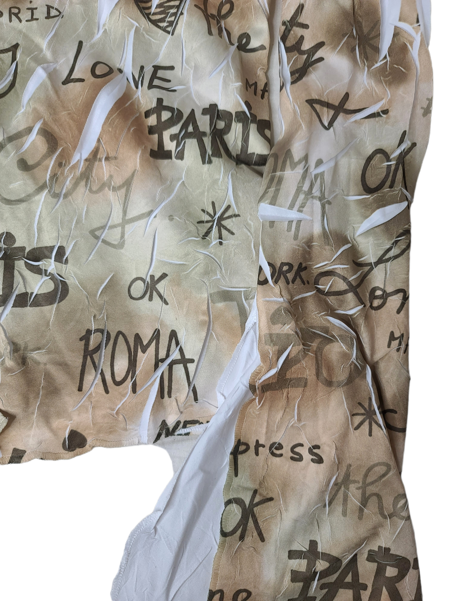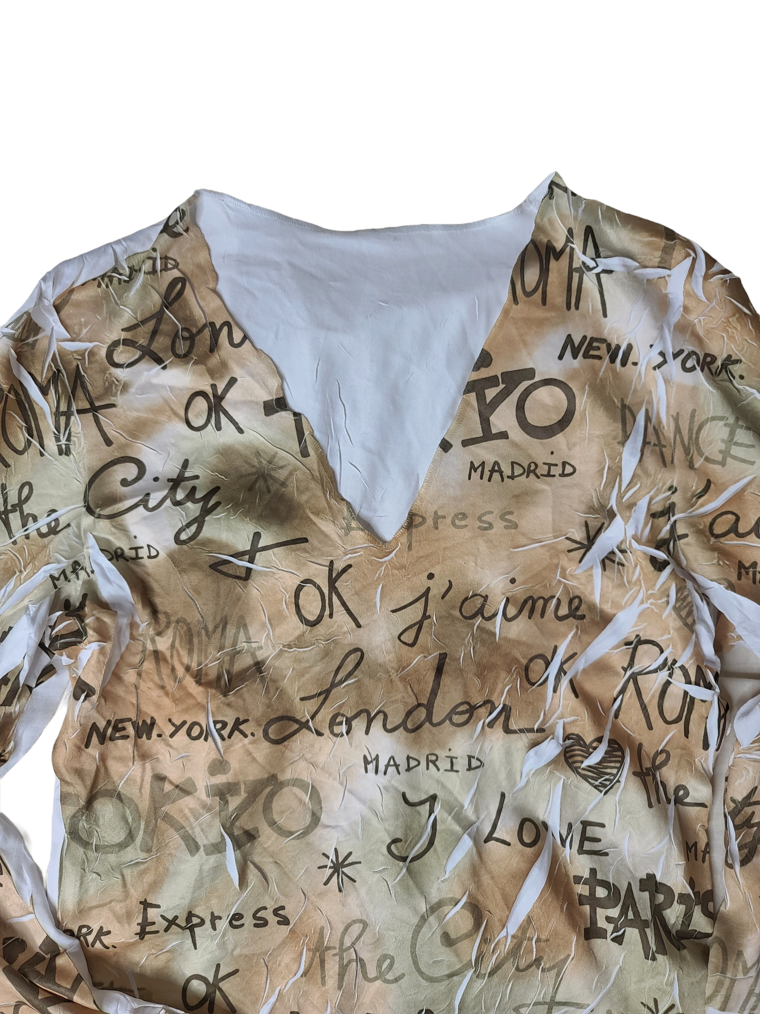 Amazing stretch top archive post-apo y2k, newspaper crinkle effect. Destroy cutout style, khaki print and text. Long and wide sleeves with slits. Dystopian style. Exclusive model.