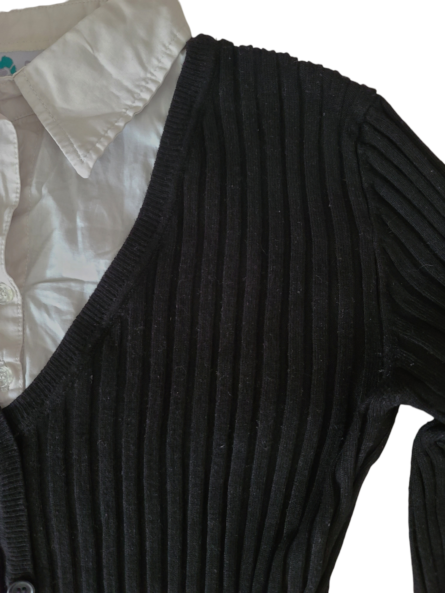 Downtown y2k vintage flirty black ribbed sweater with white mock shirt collar. Acubi cute style.