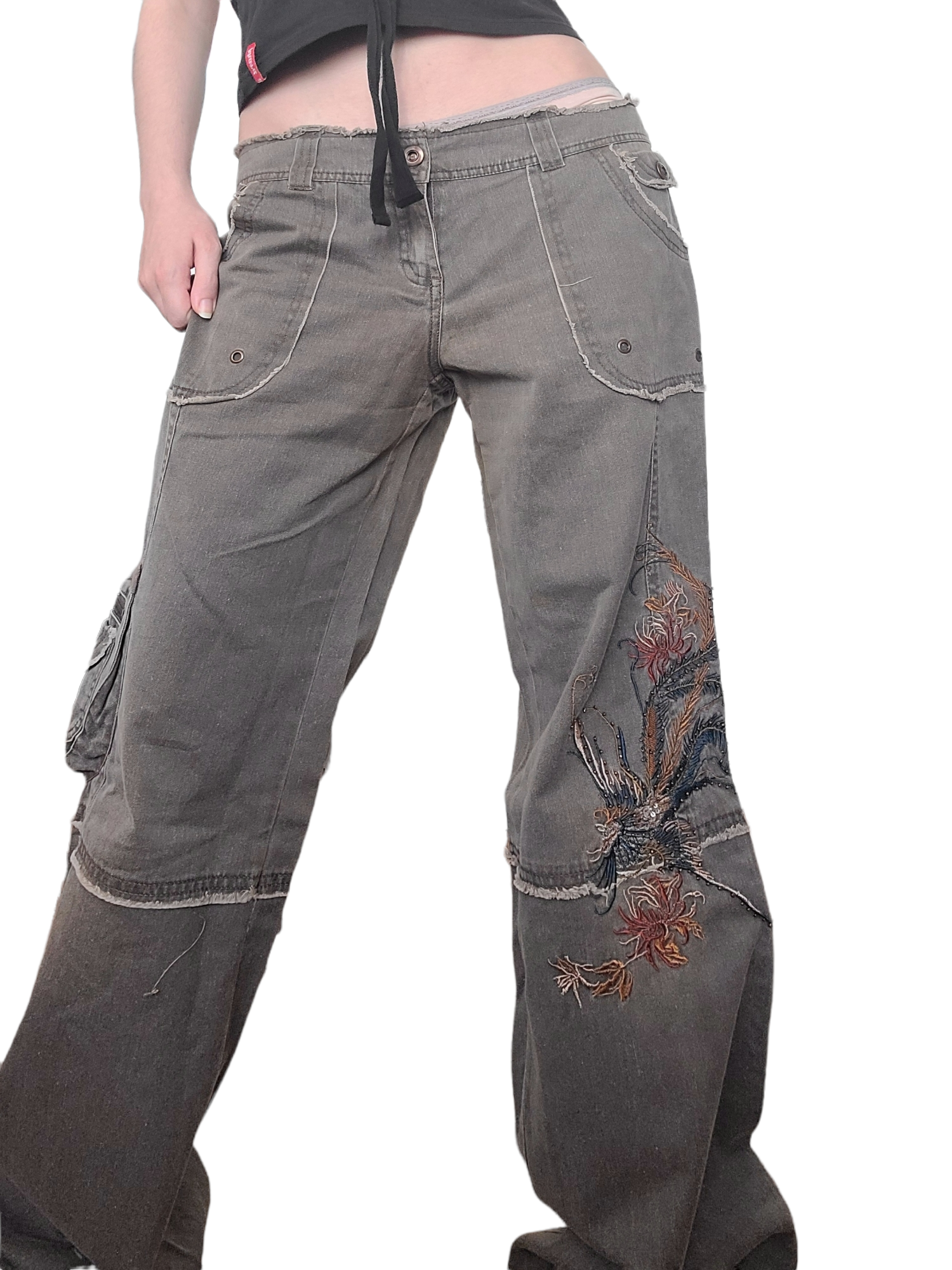 Magnifique cargo gris foncé vintage des années 90 grunge bohem avec détails destroy effilochés. Magnifique broderie sur la jambe avec perles.