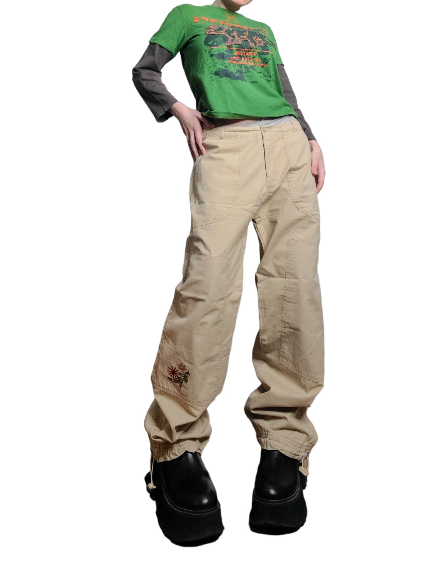 Très beau cargo crème vintage 90s sportwear, neutral style. Cordons de serrage aux chevilles et broderie florale en bas d'une jambe. Archive gorpcore.