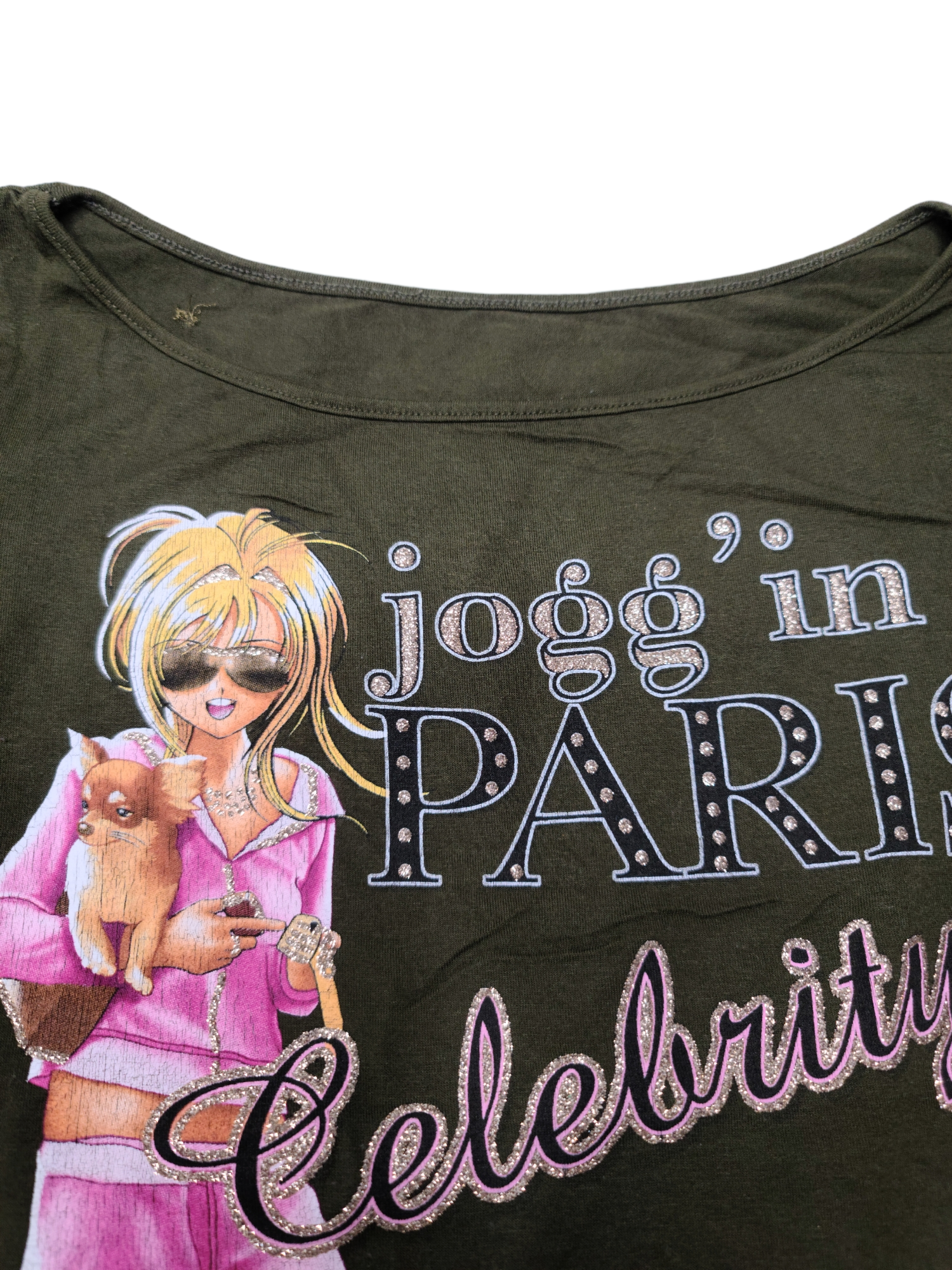 Incroyable top vintage des années 2000 y2k à manches longues kaki et flocage à strass "jogg'in Paris Celebrity ".