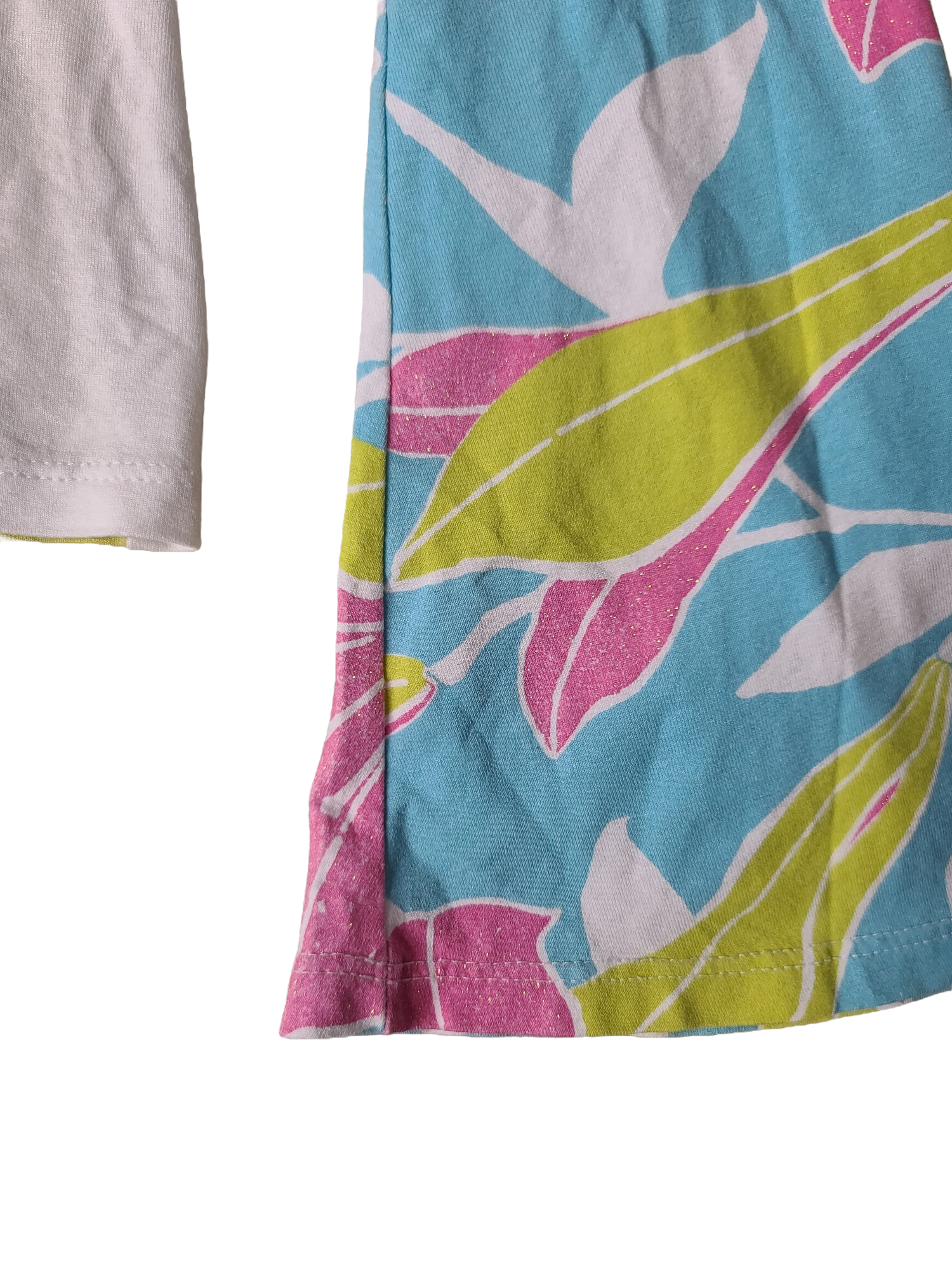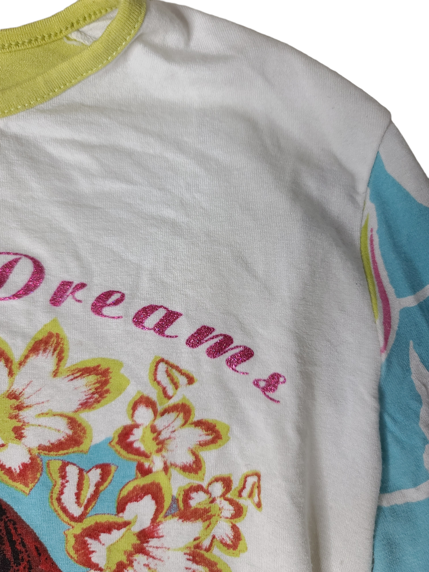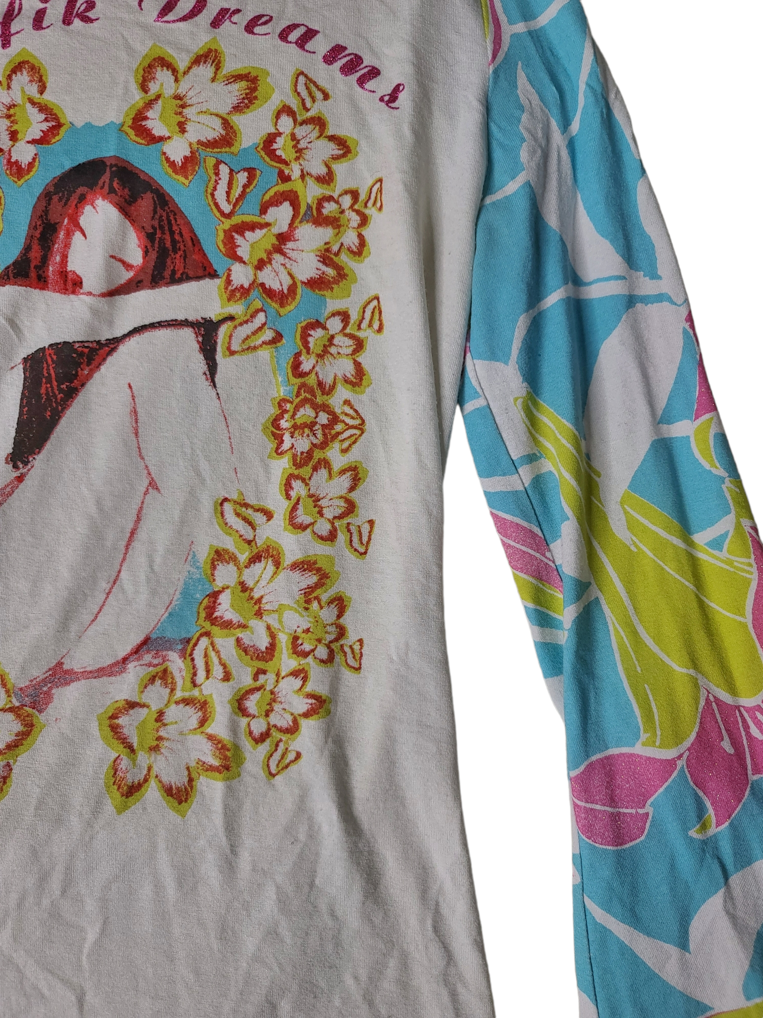 Incroyable top blanc et bleu fairycore y2k imprimé femme et fleurs. Manches évasées, style coupe 70s avec details pailletés. Archive 2000.