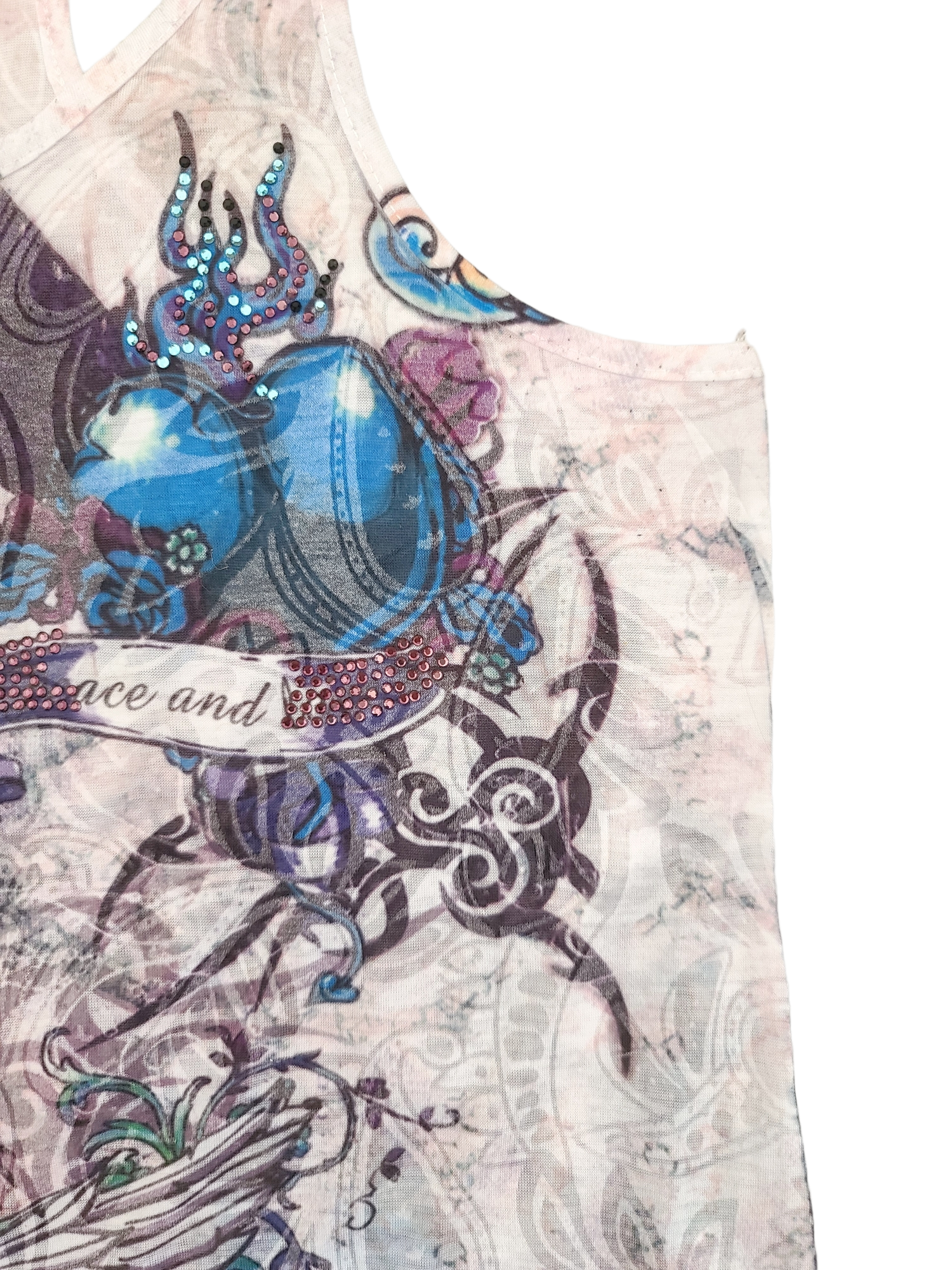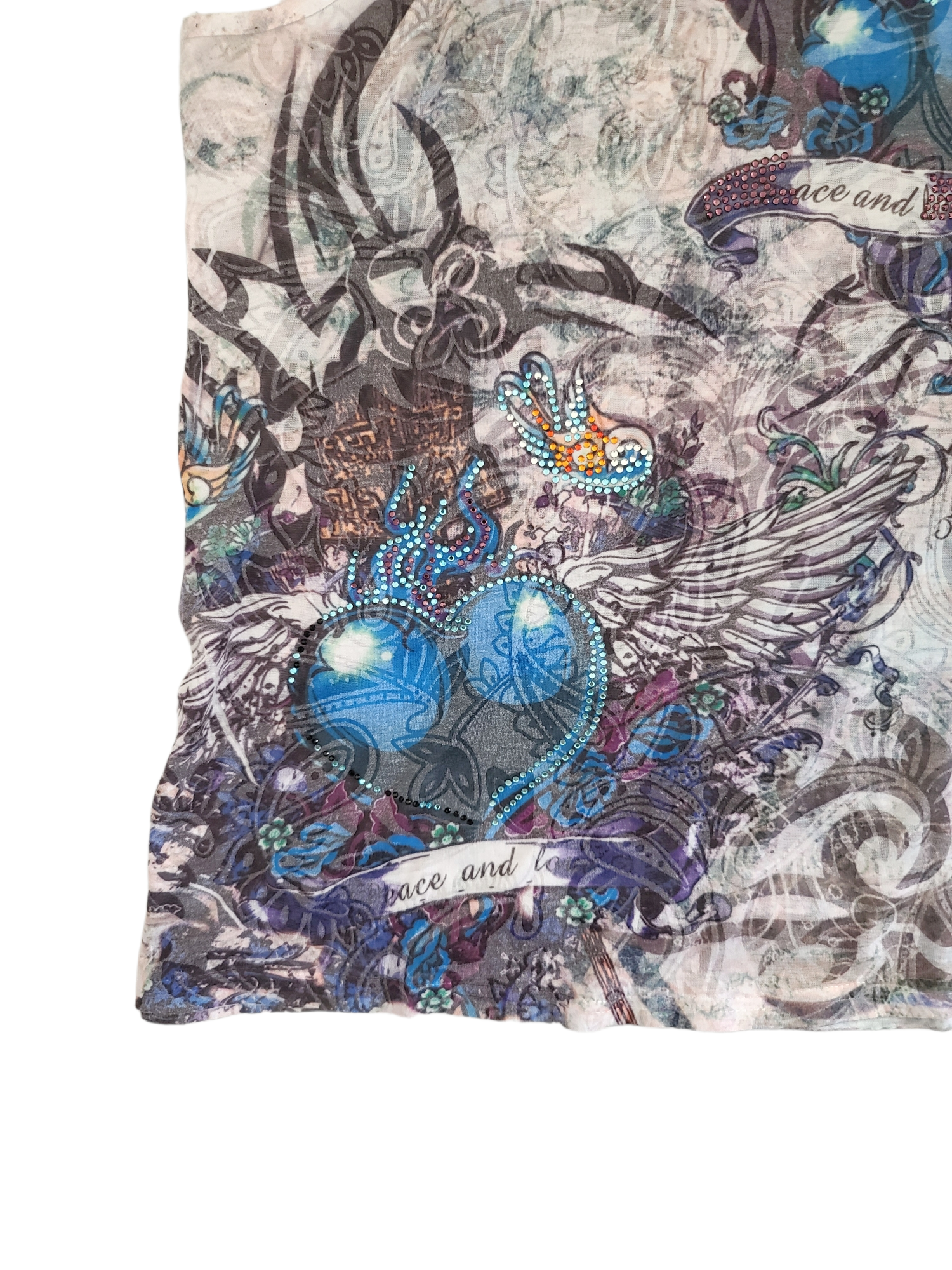 Beau top debardeur, emo streetwear style. Motif tatto et cœurs et strass. Modèle y2k.