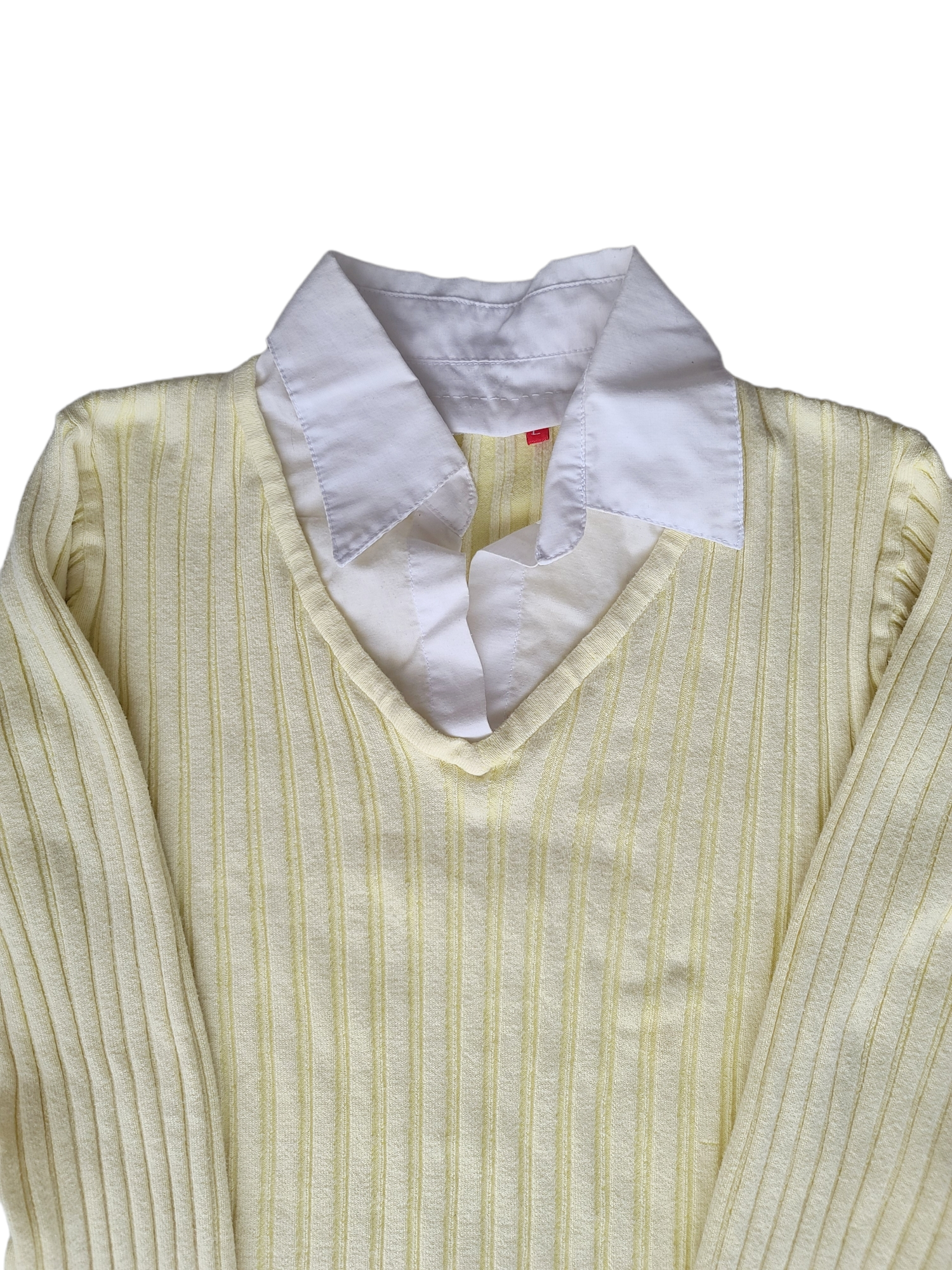 Downtown y2k vintage flirty yellow ribbed sweater with white mock shirt collar. Acubi cute style.