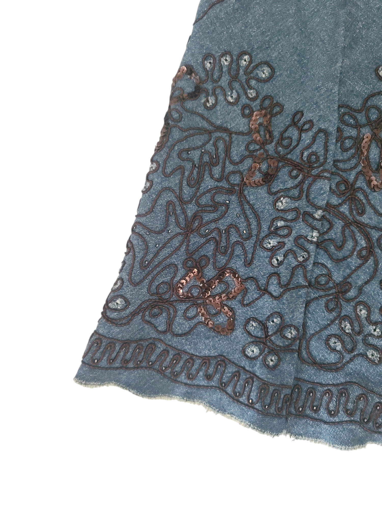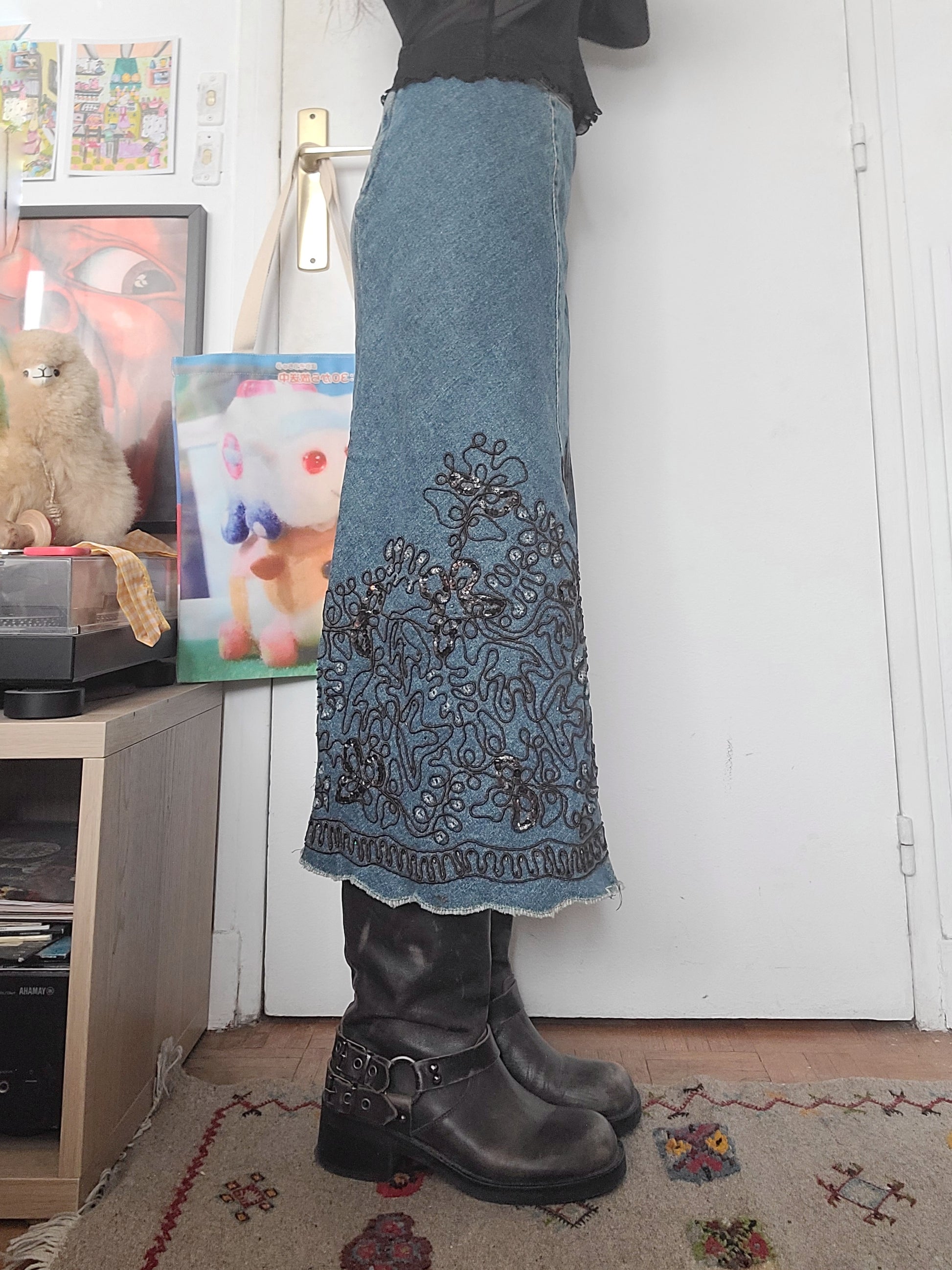 Gorgeous vintage 90s denim long skirt with pearl embroidery details. Fairygrunge.