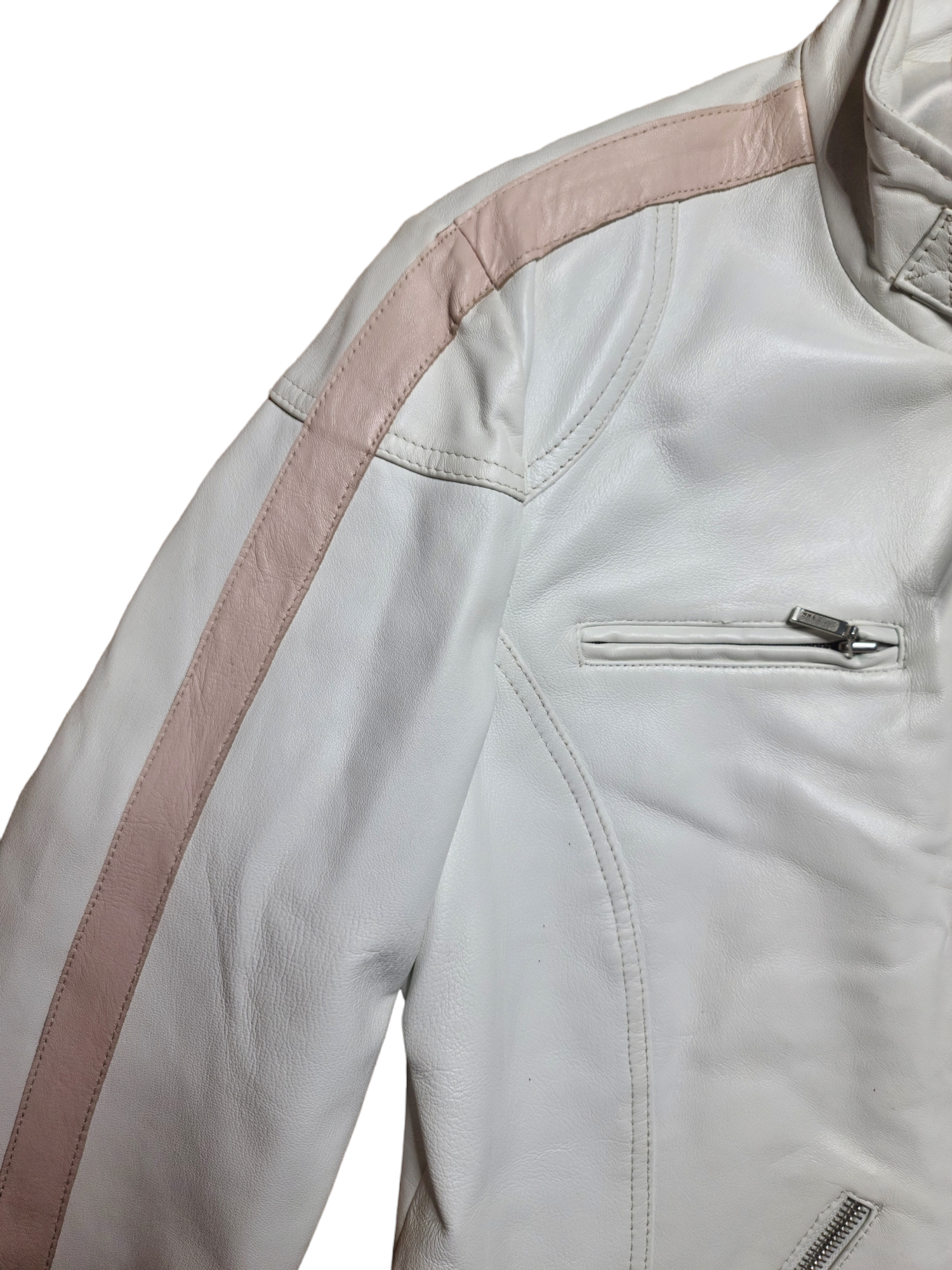 Incroyable veste biker vintage blanche et rose pastel, motorcycle style. Détails bandes roses le long des manches. Col sangle.