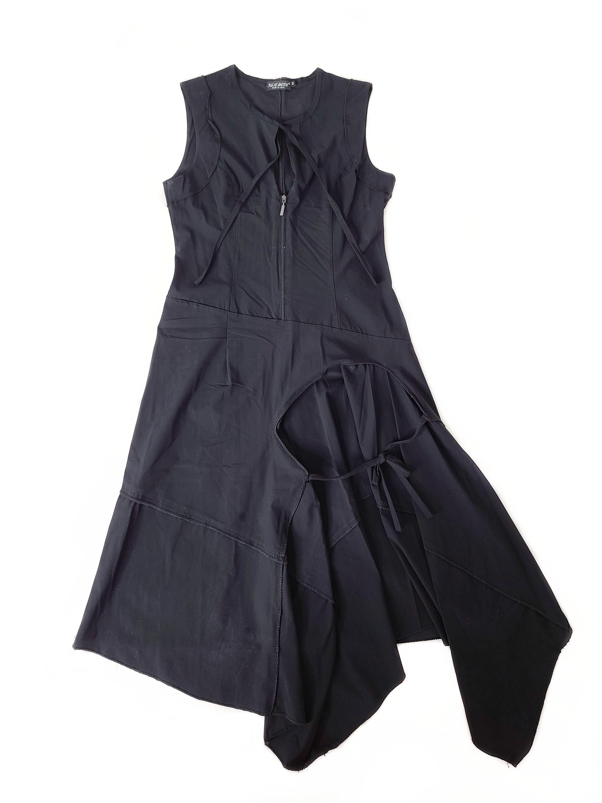 Ensemble vintage noir subversive basics style. Robe évasée et veste. Détails cordons et découpes irrégulières.