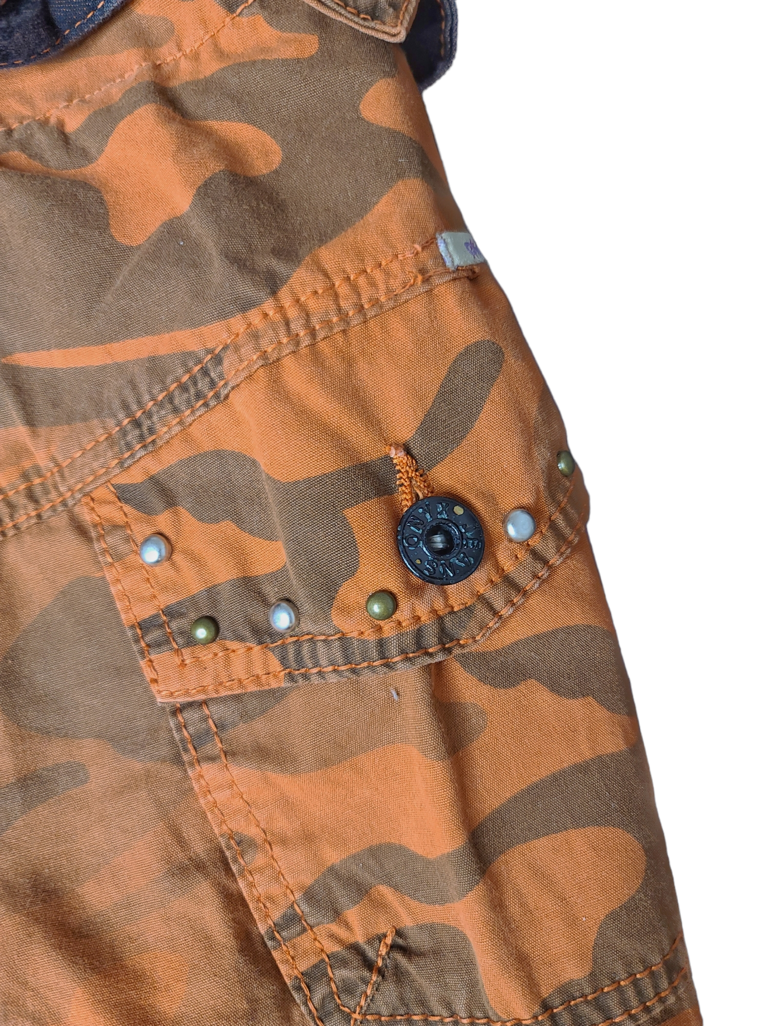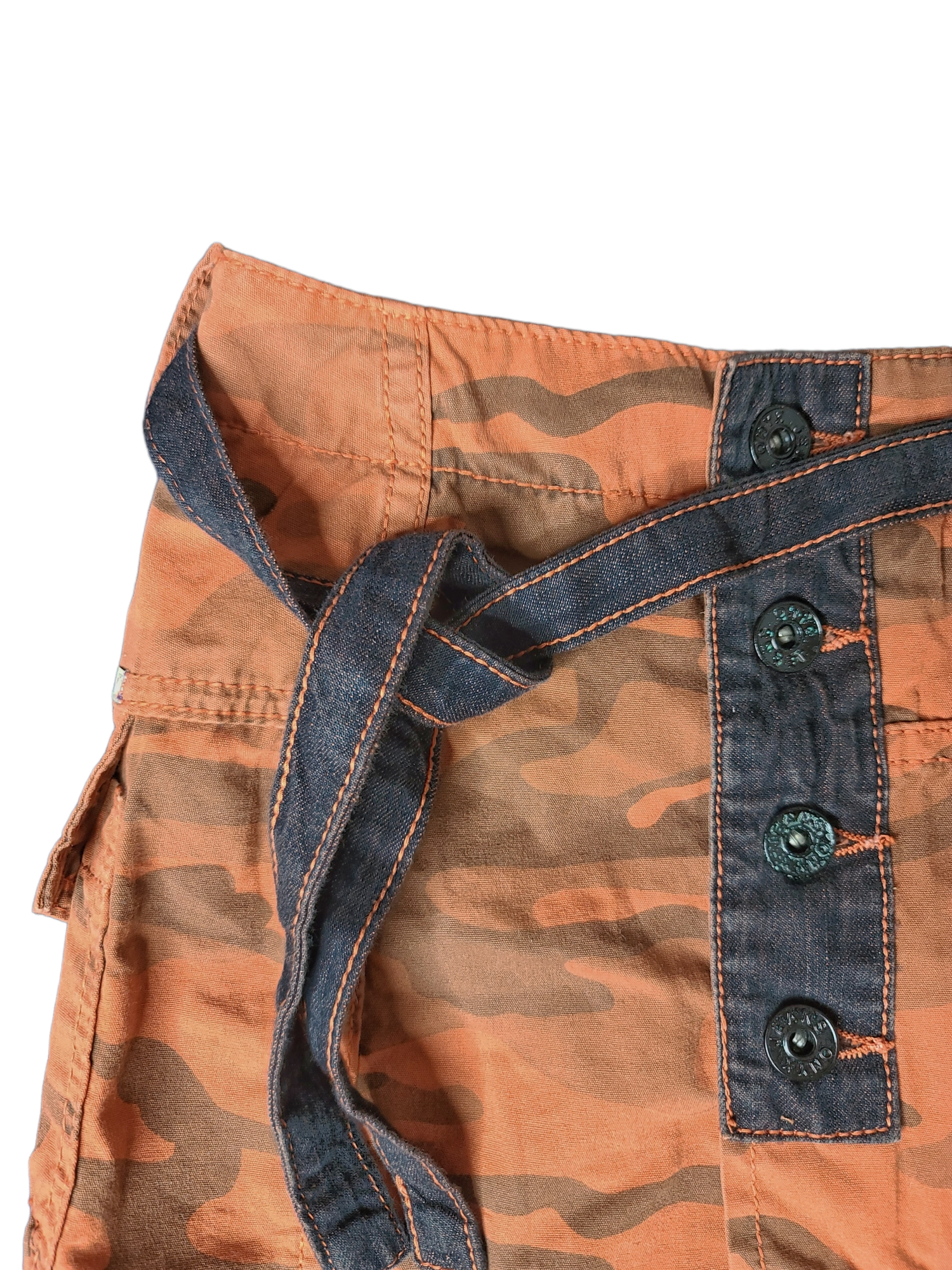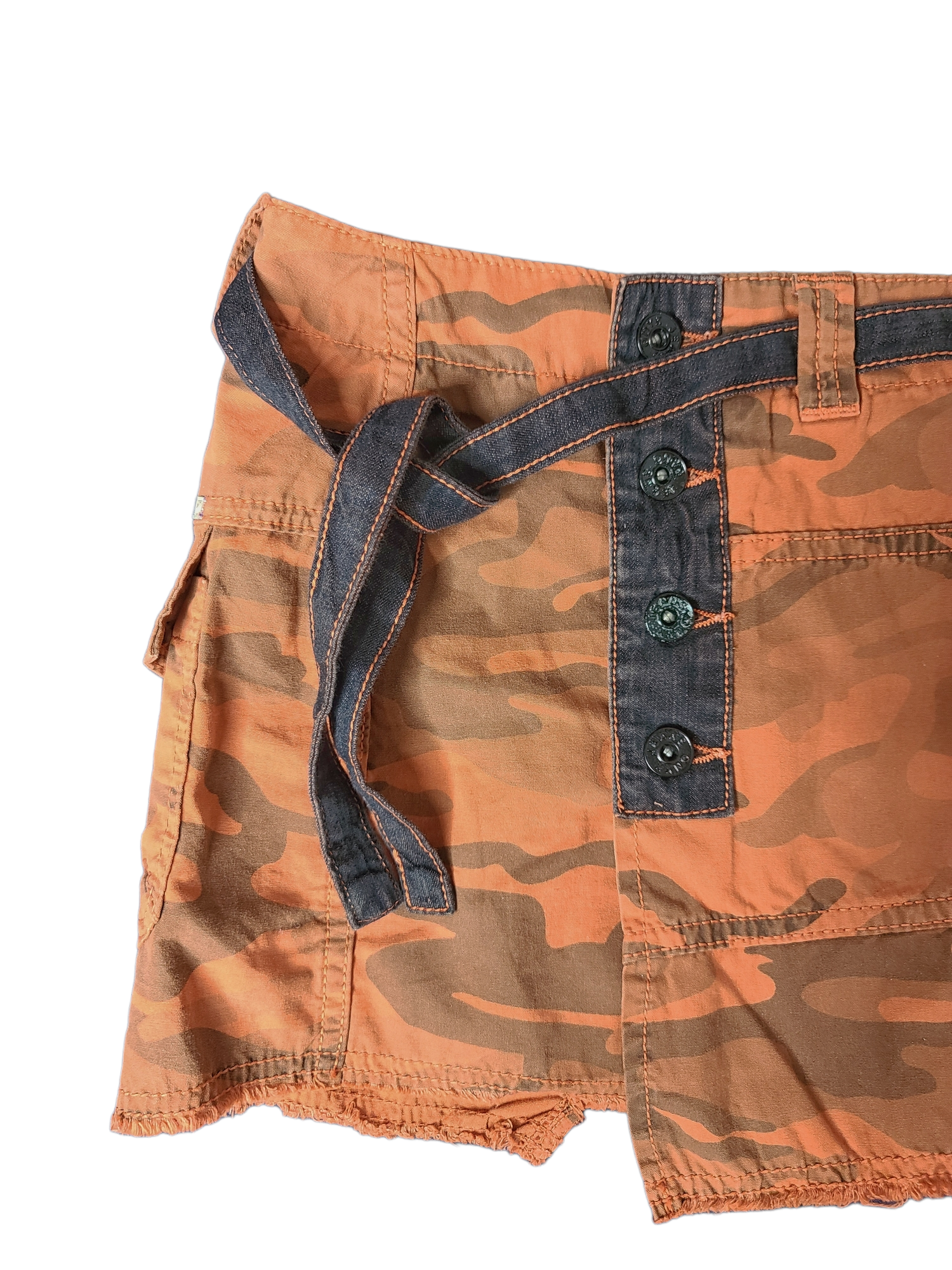 Amazing mini skirt y2k harajuku asymmetrical vintage orange military pattern. Denim and pearl details.